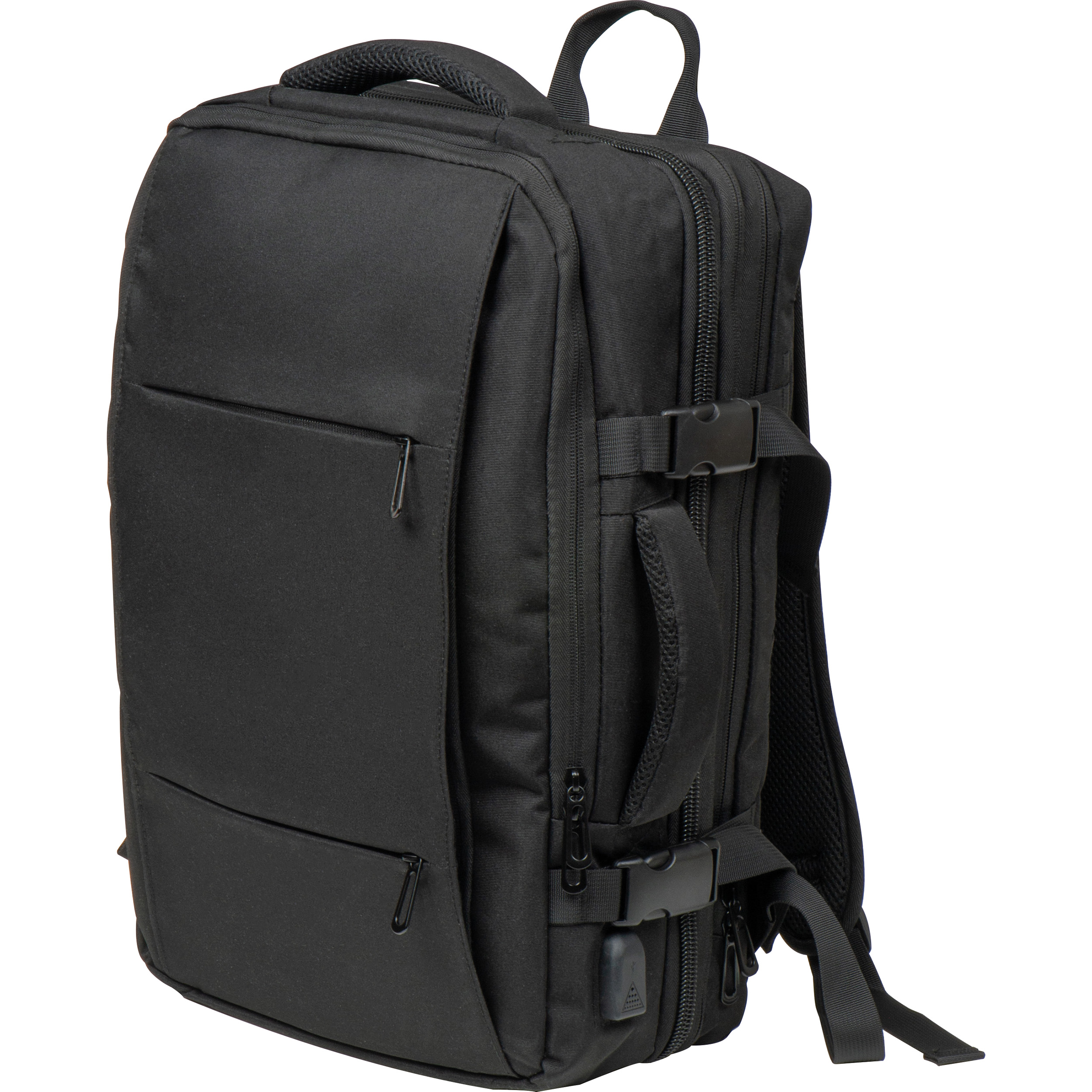 CrisMa Reiserucksack mit drei Reißverschlussfächern. Im Inneren befindet sich eine clevere Aufteilung mit u. a. einem Laptopfach, diversen kleineren Fächern und einem eingearbeiteten Nassfach für die Unterbringung von von Kosmetikartikeln oder feuchter Wäsche. Die Kapazität beträgt zwischen 22L und 37L und lässt sich durch die Fixiergurte anpassen. Ihre Werbung drucken wir auf das Vorfach.