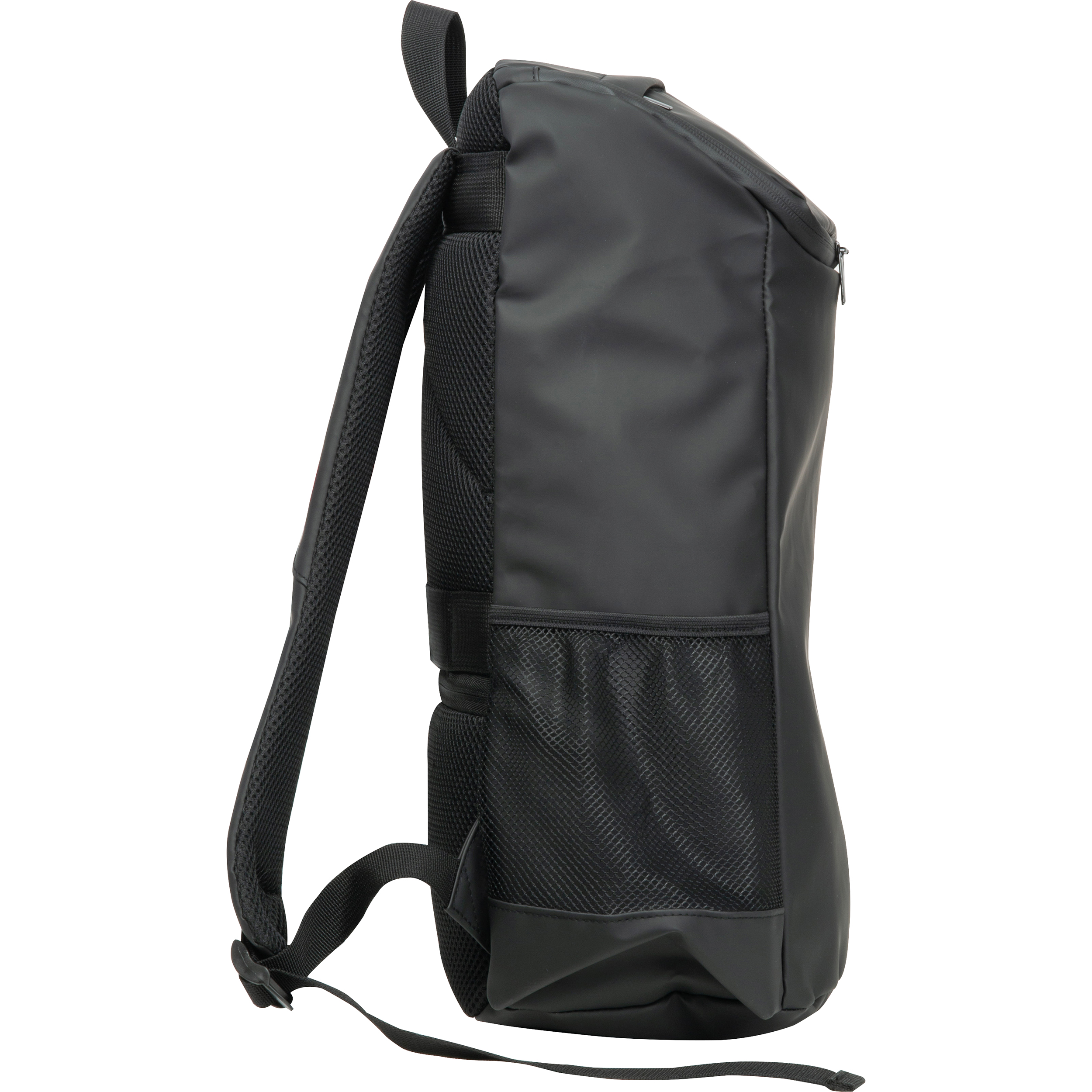 Goßer Rucksack aus PU mit viel Stauraum und einem Tableteinsteckfach im inneren. Schwarz glänzende Reisverschlüsse, zwei seitliche Netze als Getränkehalter, einem Anti-Diebstall-Fach und gepolsterten Schultergurten. Ihre Werbung drucken wir auf die Vorderseite.