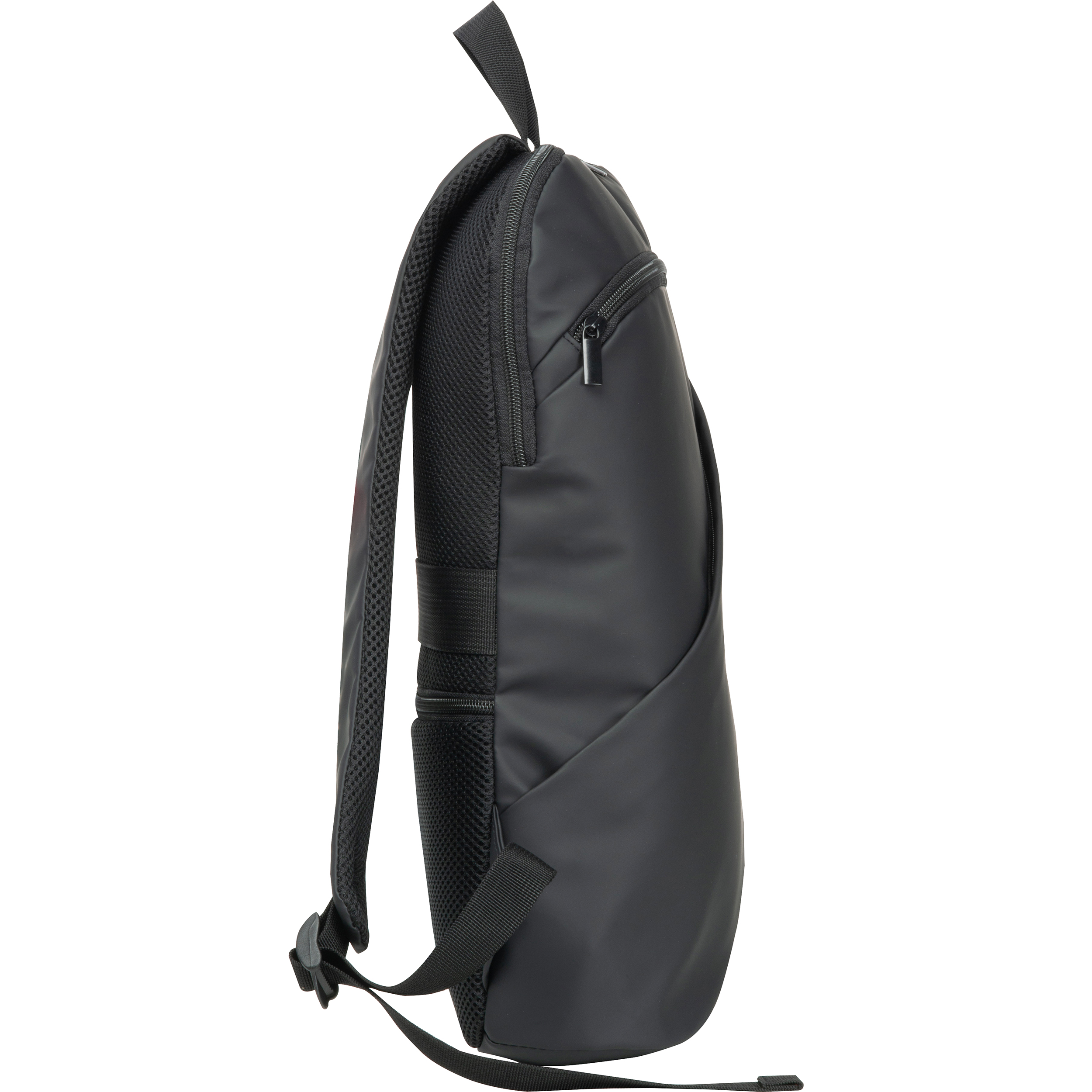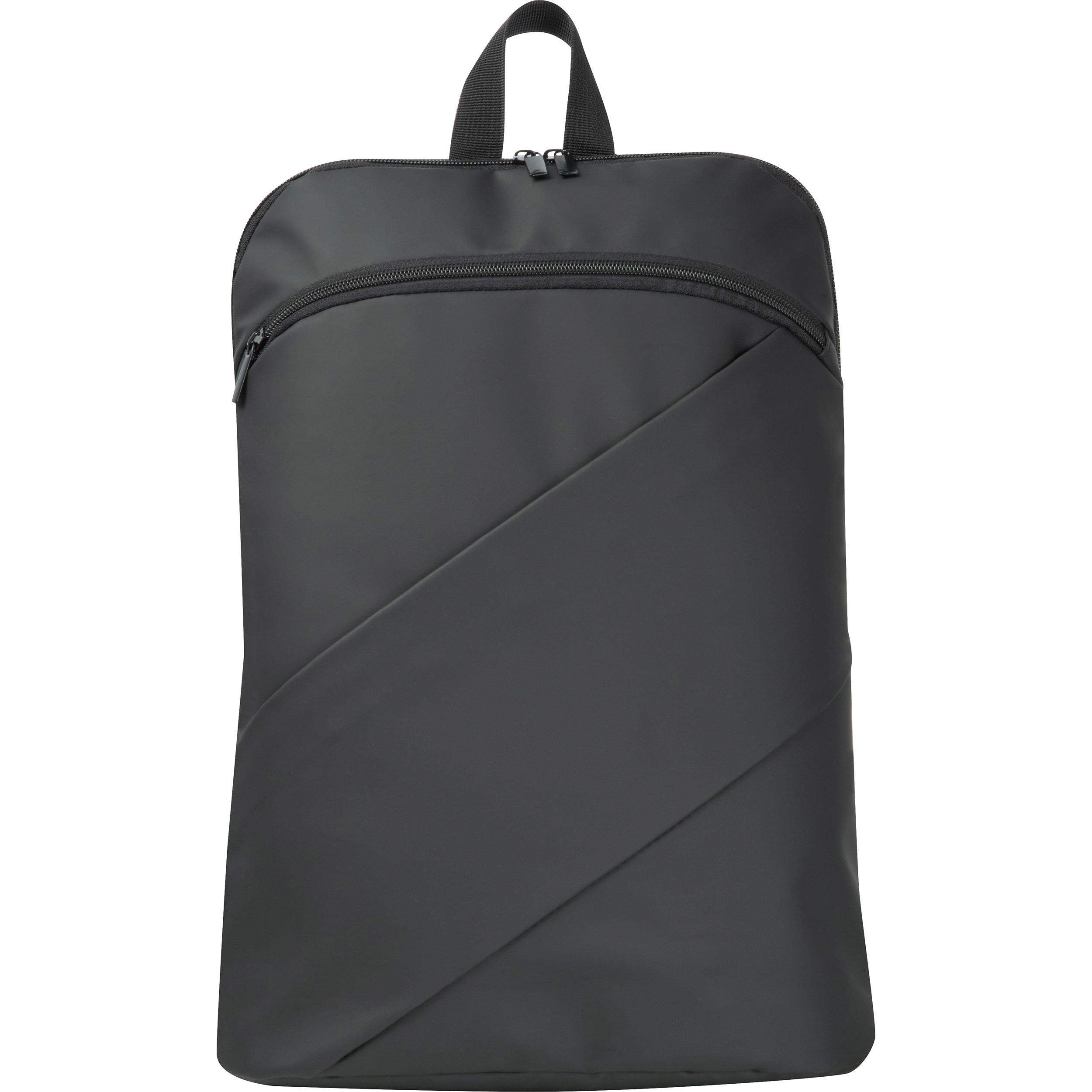 Rucksack aus PU mit zwei schrägen, schwarzglänzenden Reißverschlüssen an der Vorderseite, Trageschlaufe, zwei bequemen Schultergurten und einem Anti-Diebstahl-Fach. Ihre Werbung wird auf die Vorderseite gedruckt.