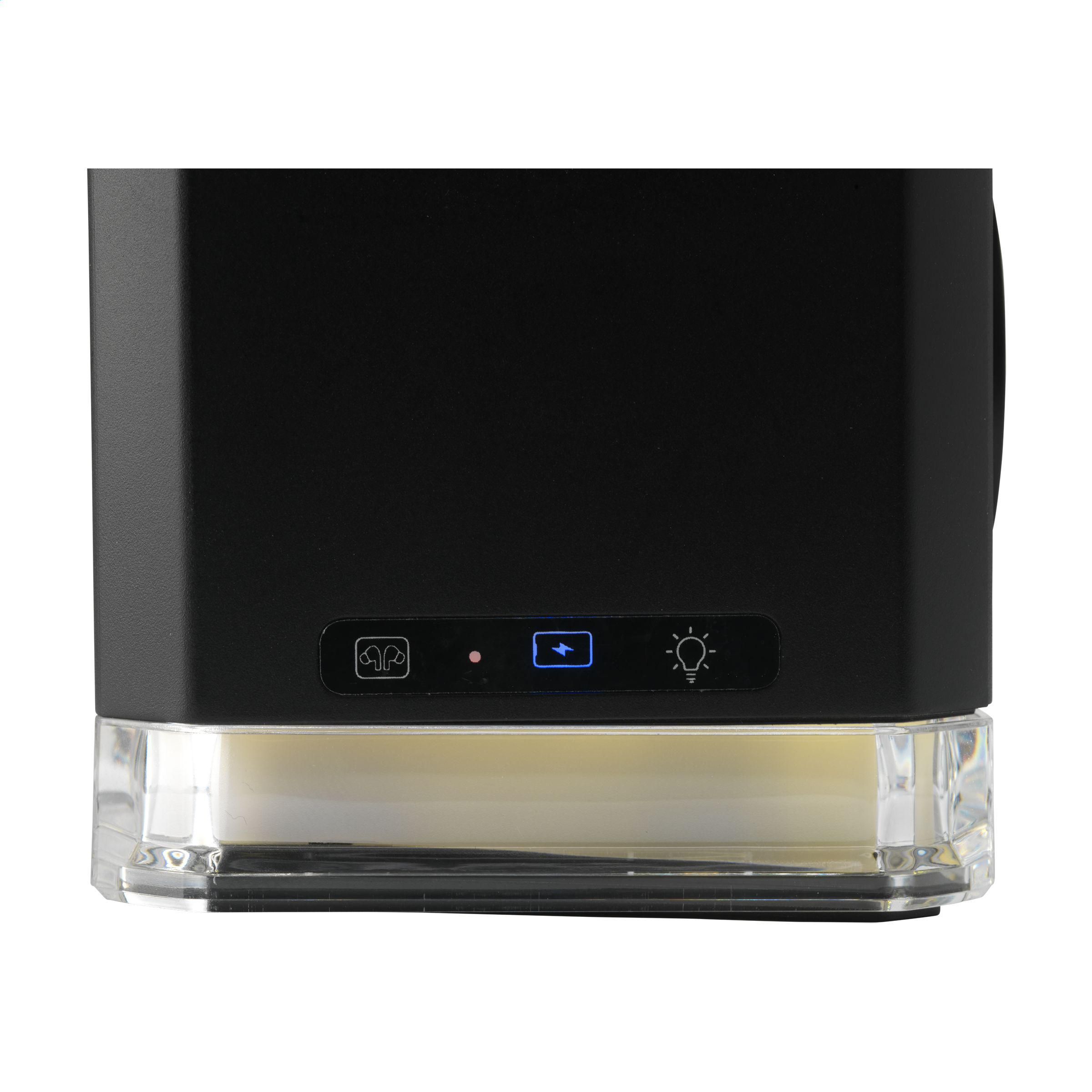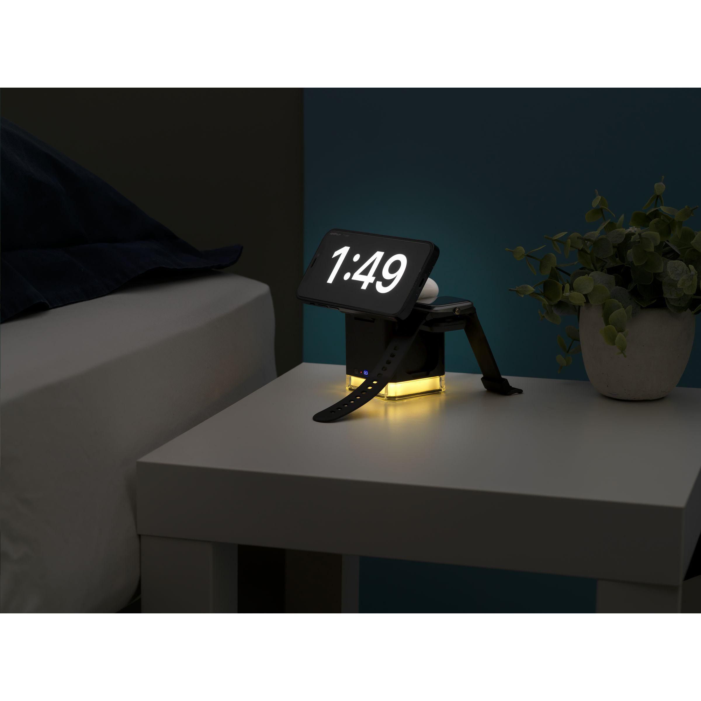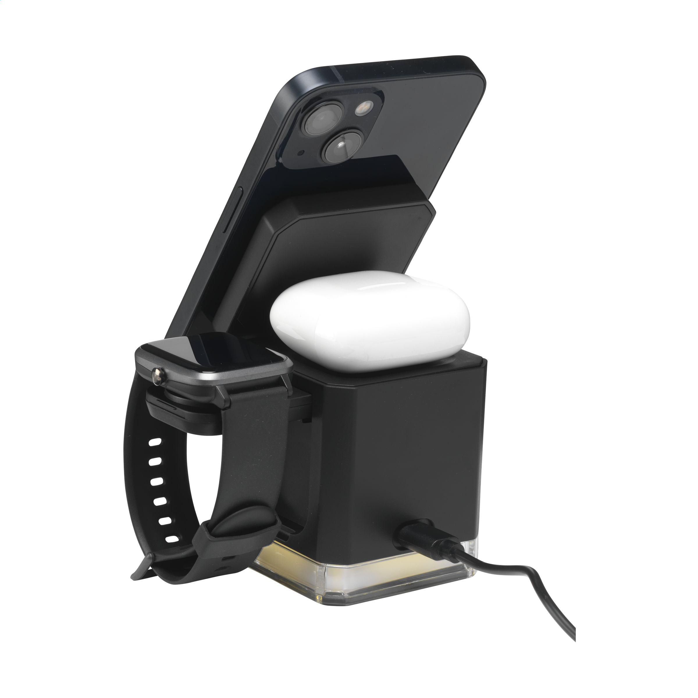 3-in-1-Ladestation/Schnellladegerät mit einem Gehäuse aus 100% RCS-zertifiziertem recyceltem ABS. Das Ladegerät hat eine attraktive Würfelform mit beweglichen Teilen zum gleichzeitigen Laden Ihres iPhones (ab Version 12), Ihrer Kopfhörer und Ihrer Apple Watch. Es verfügt über eine Magnetfunktion (Magsafe) zum kabellosen Laden Ihres iPhones. Die integrierten Magnete im Ladegerät sind perfekt ausgerichtet und sorgen immer dafür, dass die Smartwatch in der richtigen Position geladen wird. Dieses Ladegerät wird mit einem zusätzlichen magnetischen Metallring geliefert, der das Laden von nicht magnetischen, kabellos wiederaufladbaren Smartphones unterstützt. Eingang: DC9V 3A. Drahtlose Ausgangsleistung Smartphone: 5 W/7,5 W/10 W/15 W, iWatch: 3 W, TWS-Kopfhörer: 5 W. Kann auch als Wecker in Kombination mit Ihrer Smartwatch verwendet werden. Das Ladegerät verfügt über eine integrierte LED-Beleuchtung und eine rutschfeste Unterseite. Enthält ein rTPE-USB-C/USB-C-Ladekabel (passende Farbe) und eine Gebrauchsanweisung.