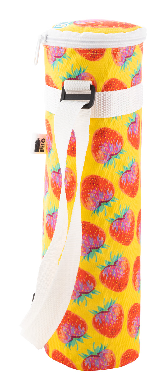 Individuelle, flaschenförmige Kühltasche mit Reißverschluss aus 600D RPET-Polyester, ausgestattet mit Aluminium-Polsterung und verstellbarem Schultergurt. Perfekt für eine 1,5-Liter-Flasche. Mit vollflächigem Sublimationsdruck. Mit RPET-Label. Mindestmenge: 25 Stk.