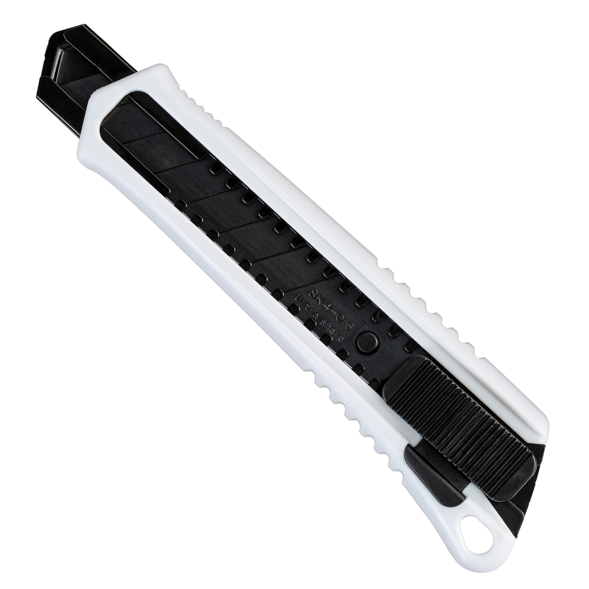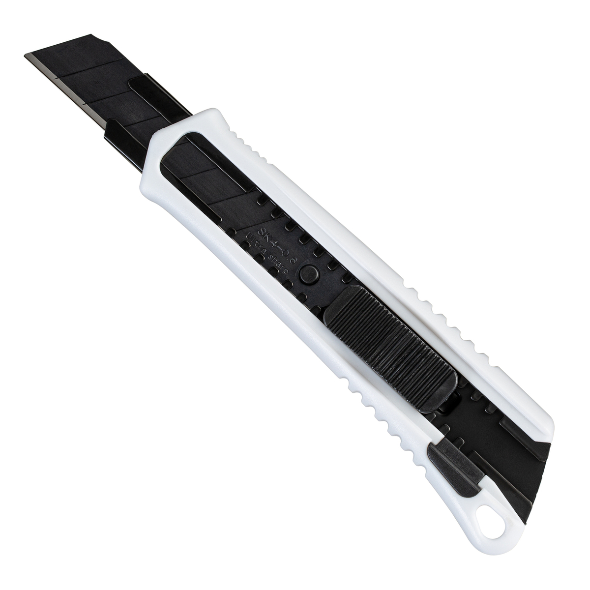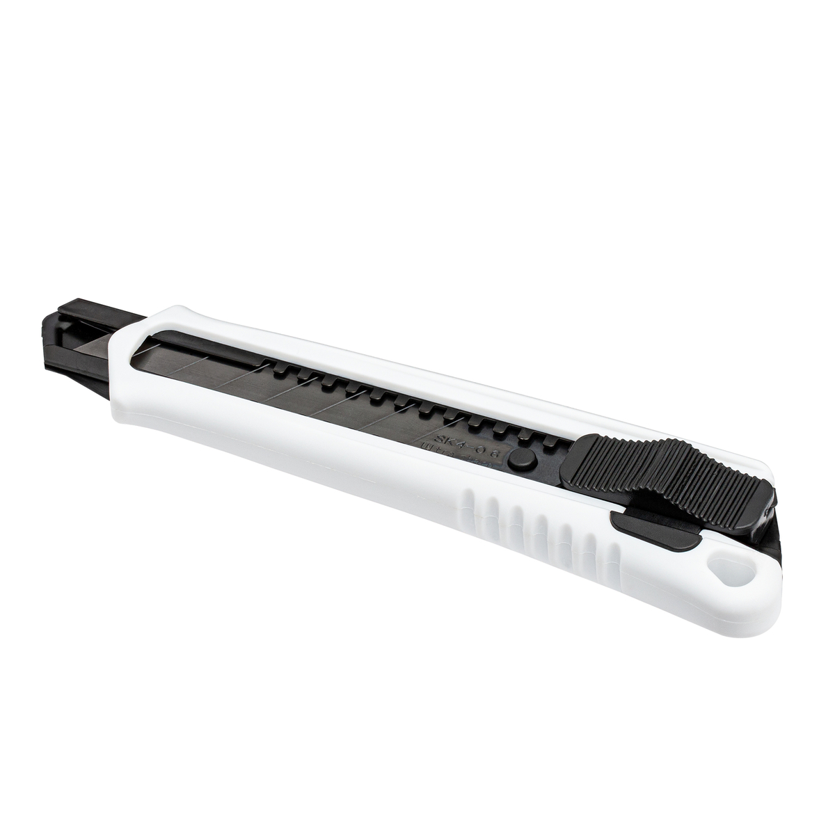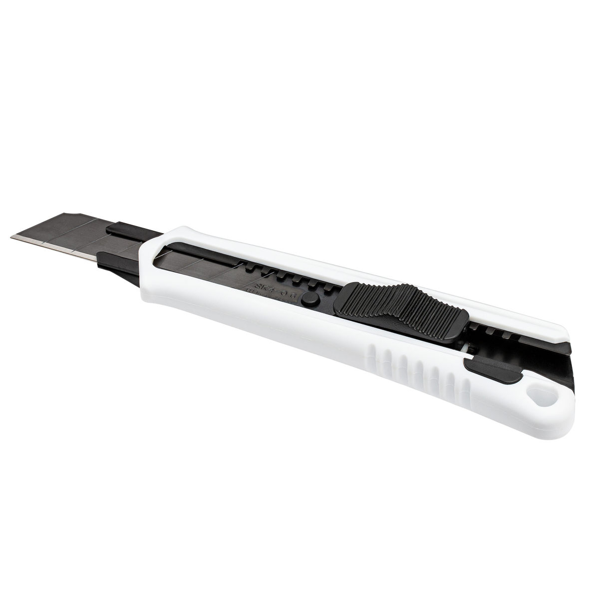 Der Cutter schneidet mühelos verschiedene Materialien wie Kunststoffplatten- und Rohre, Teppich, Kabel, Karton oder Gips. Der Cutter mit weißem Kunststoffgriff und 18 mm breiter/ 0,6 mm dünner Carbon-Stahlklinge mit schwarzer Beschichtung hat eine Druckbelastung bis zu 25 kg. Durch die lasergeschnittene Klinge ist der Cutter extrem scharf. Die Werbeanbringung kann als Doming oder Tampondruck auf dem Griff platziert werden.