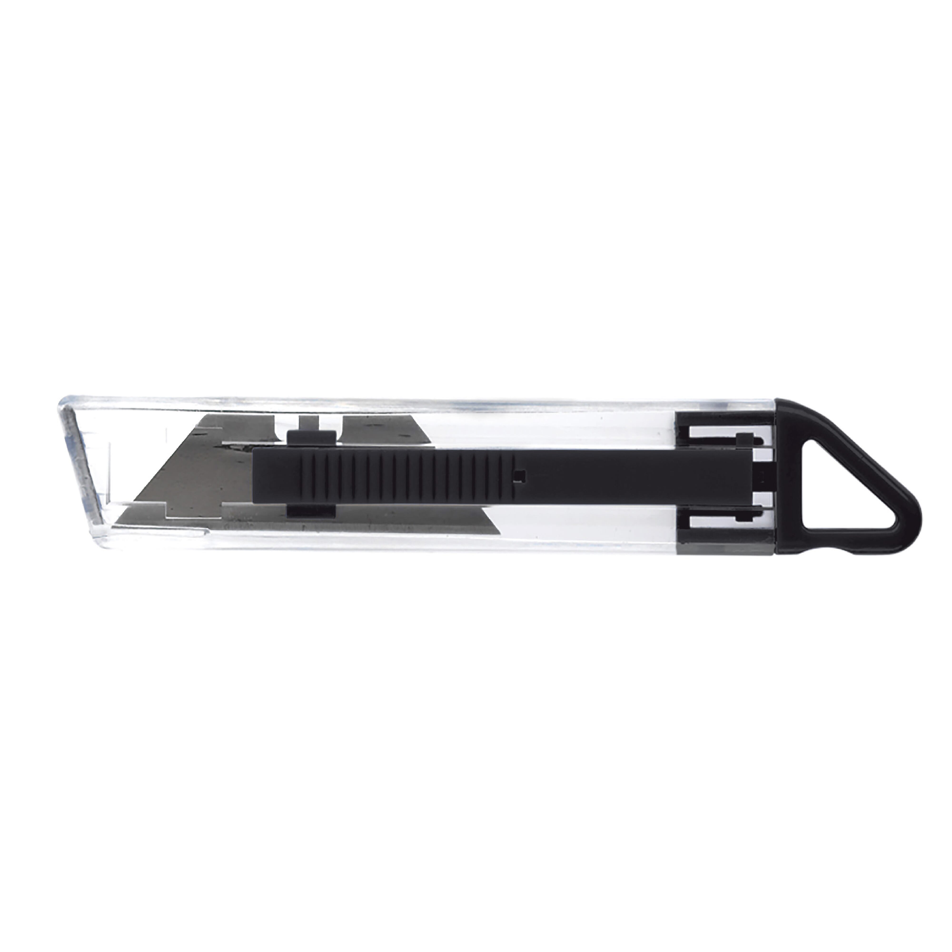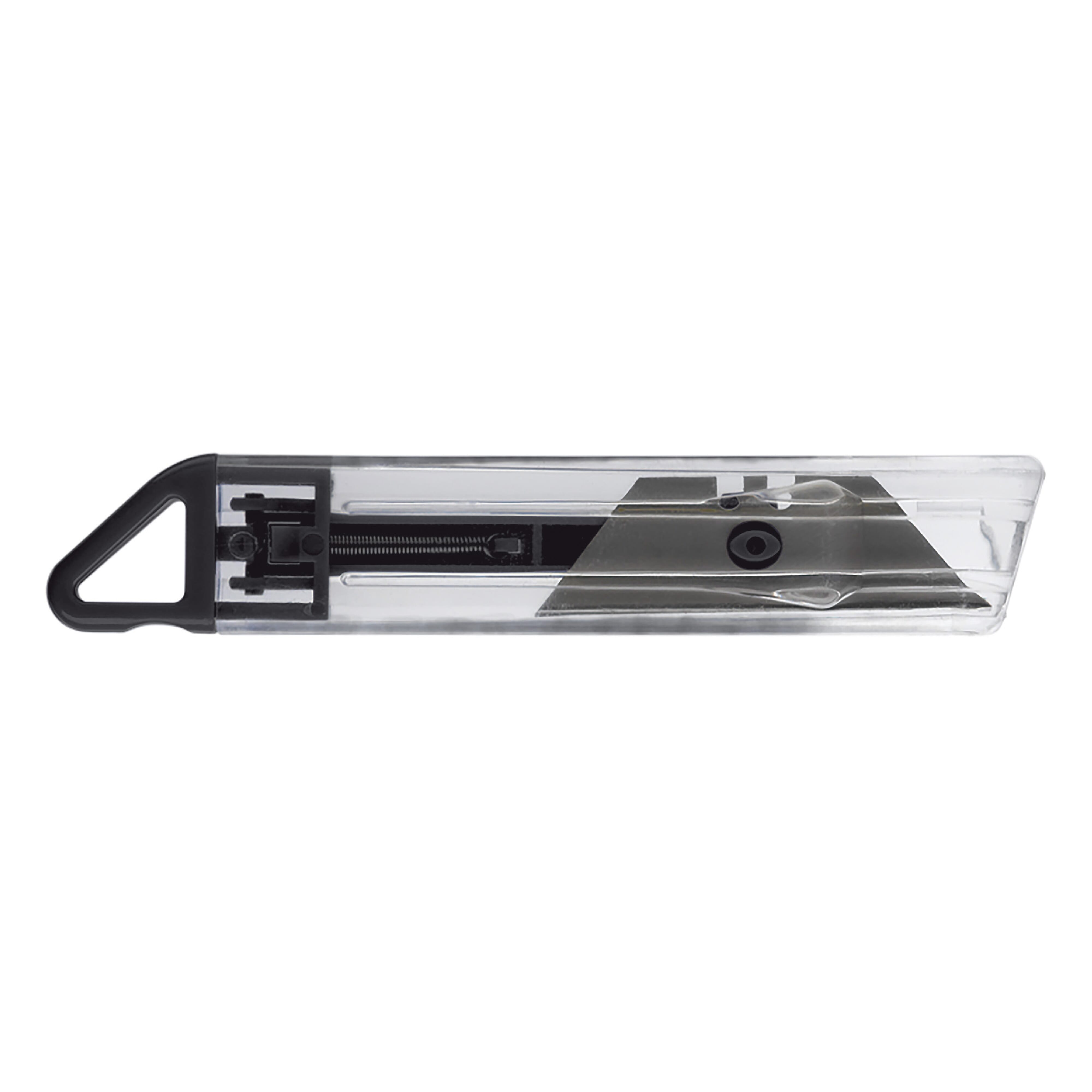 Transparentes Cuttermesser mit farbigen Gehäuselementen. Inkl. einer Öse zur Befestigung eines Bandes.