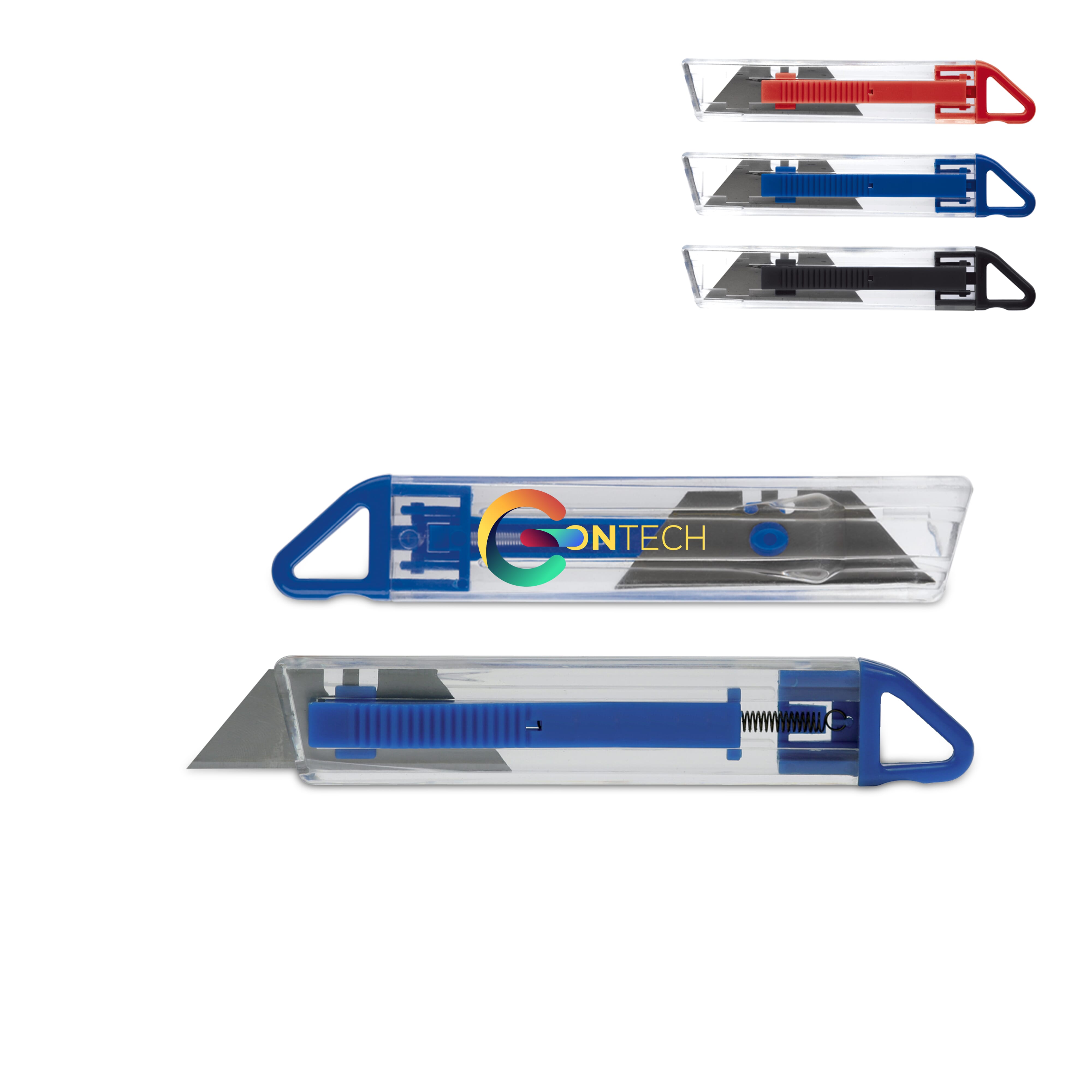 Transparentes Cuttermesser mit farbigen Gehäuselementen. Inkl. einer Öse zur Befestigung eines Bandes.