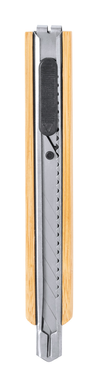Cuttermesser aus Metall mit Bambusgriff und Sicherheitsverschluss.