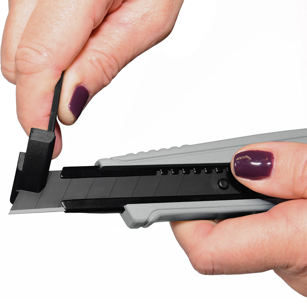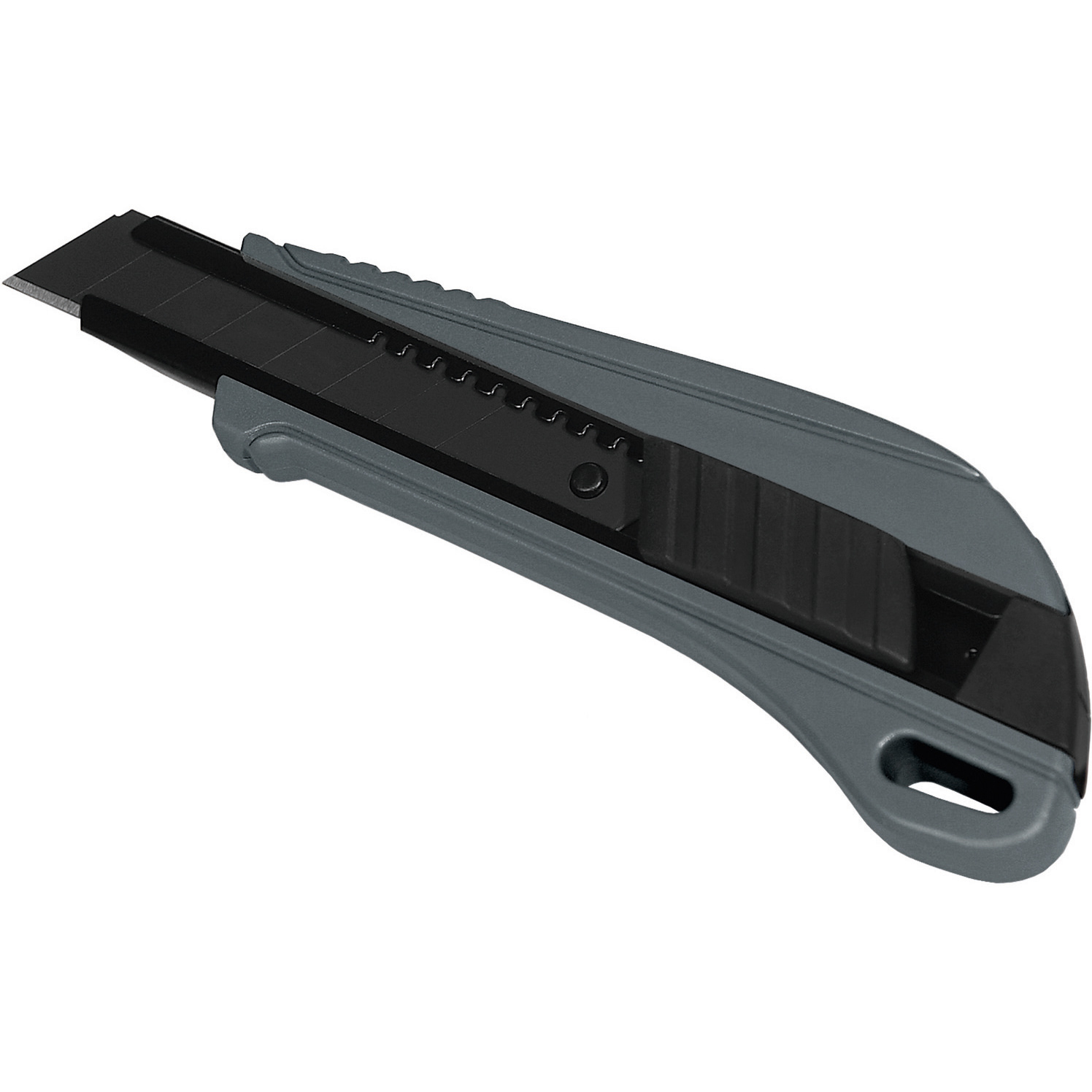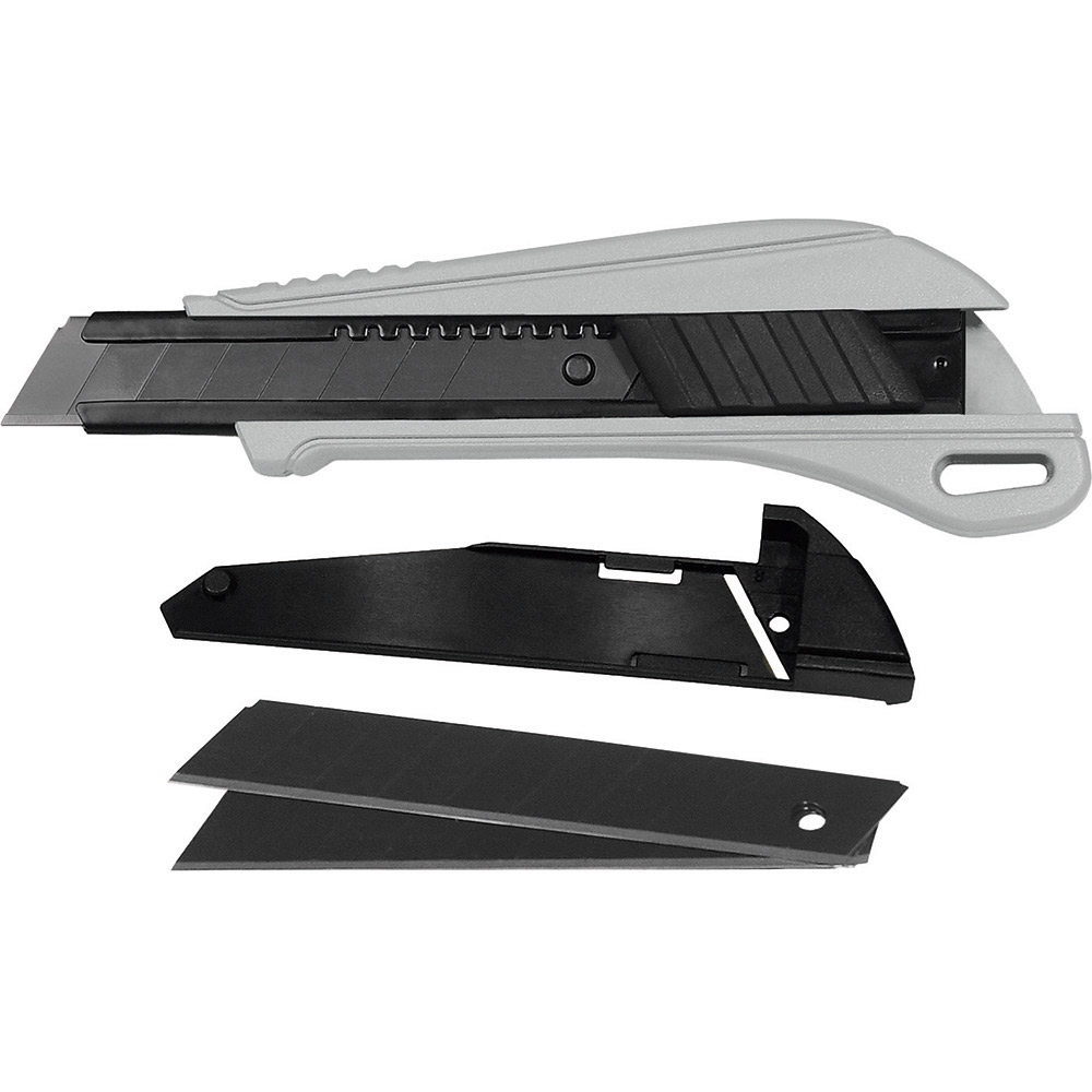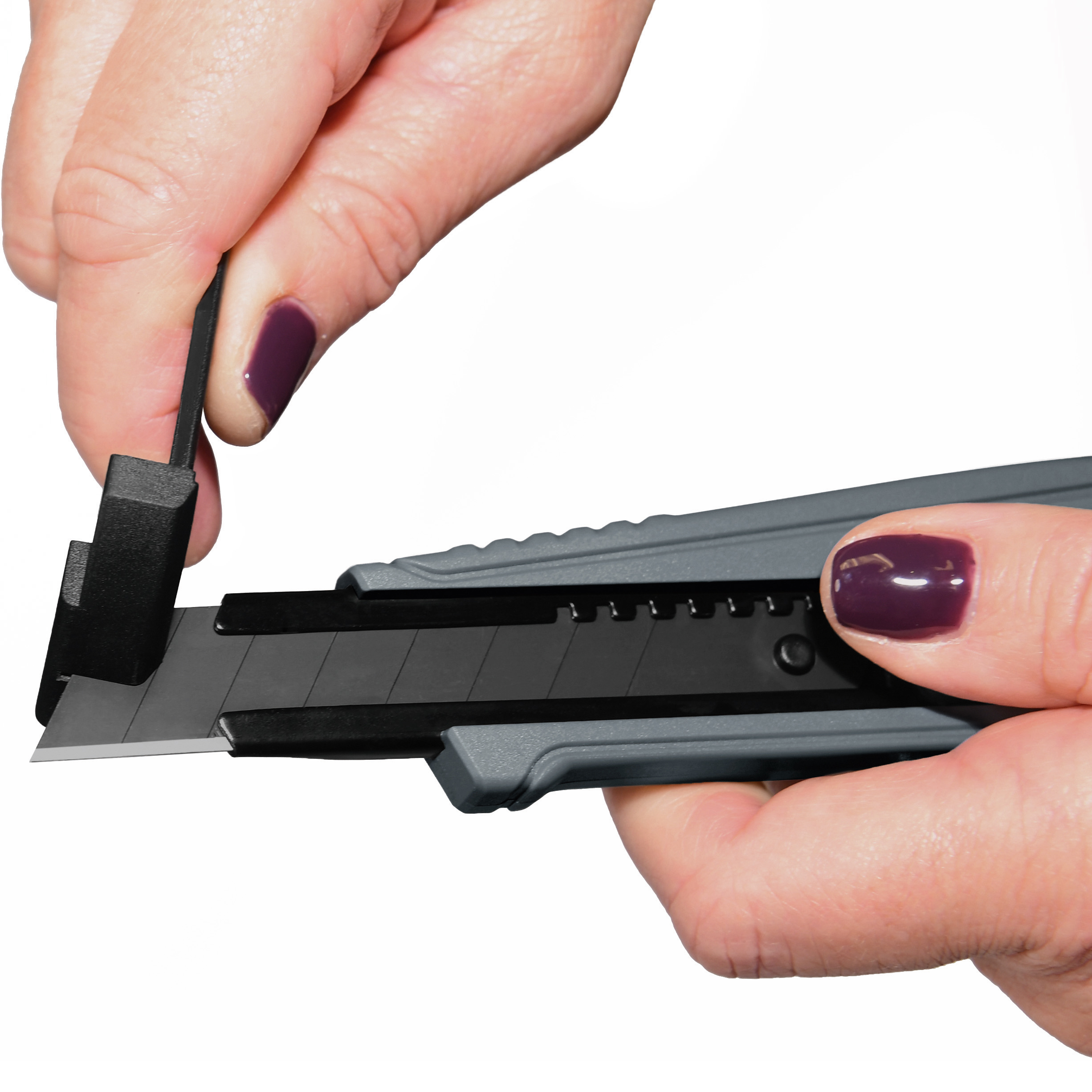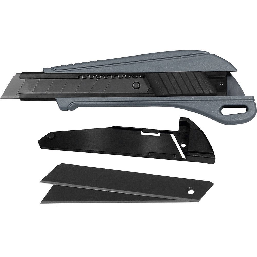 Hochwertiges, ergonomisches Qualitäts-Cuttermesser mit 18 mm SK2 Hochleistungs-Abbrechklinge. Extrem hohe Schnitthaltigkeit durch den hohen Kohlenstoffgehalt der SK2 Stahlklinge. Die schwarze Klinge steht für besondere Schärfe und Langlebigkeit. Ein spezieller Schliff erhöht die Anfangsschärfe. In der äußerst robusten Edelstahl-Führungsschiene mit Schieberaster, kann die Klinge in der gewünschten Länge arretiert werden. Die Rücklaufsperre in der Führungsschiene verhindert, dass die Klinge beim Zurückfahren einfach aus dem Gehäuse springt. Material: schlagfestes Gehäuse aus ABS, Klingenführungsschiene aus schwarz beschichtetem Edelstahl 430, Schieber aus TPR / ABS. Klinge: 18 mm Abbrechklinge aus SK2 Carbonstahl, Stärke 0,5 mm, Rockwell 62~65 HRC (gehobene Premium-Qualitätsstufe), Korrosionsschutz durch schwarze Beschichtung, max. Klingenausschub 79 mm, dreifach facettengeschärfte Schnittkante, 7 Abbrechsegmente für 8-fache Nutzung. Funktionen: Rücklaufsperre in der Klingenführungsschiene, Endkappe zum Abbrechen der Klingen-Segmente, Klingen-Feststellmechanismus, Öse zum Anbringen eines Lanyards oder Fangriemen. Zubehör: 2 Ersatzklingen im separaten Ersatzklingenbehälter. Verpackung: schwarze Geschenkverpackung