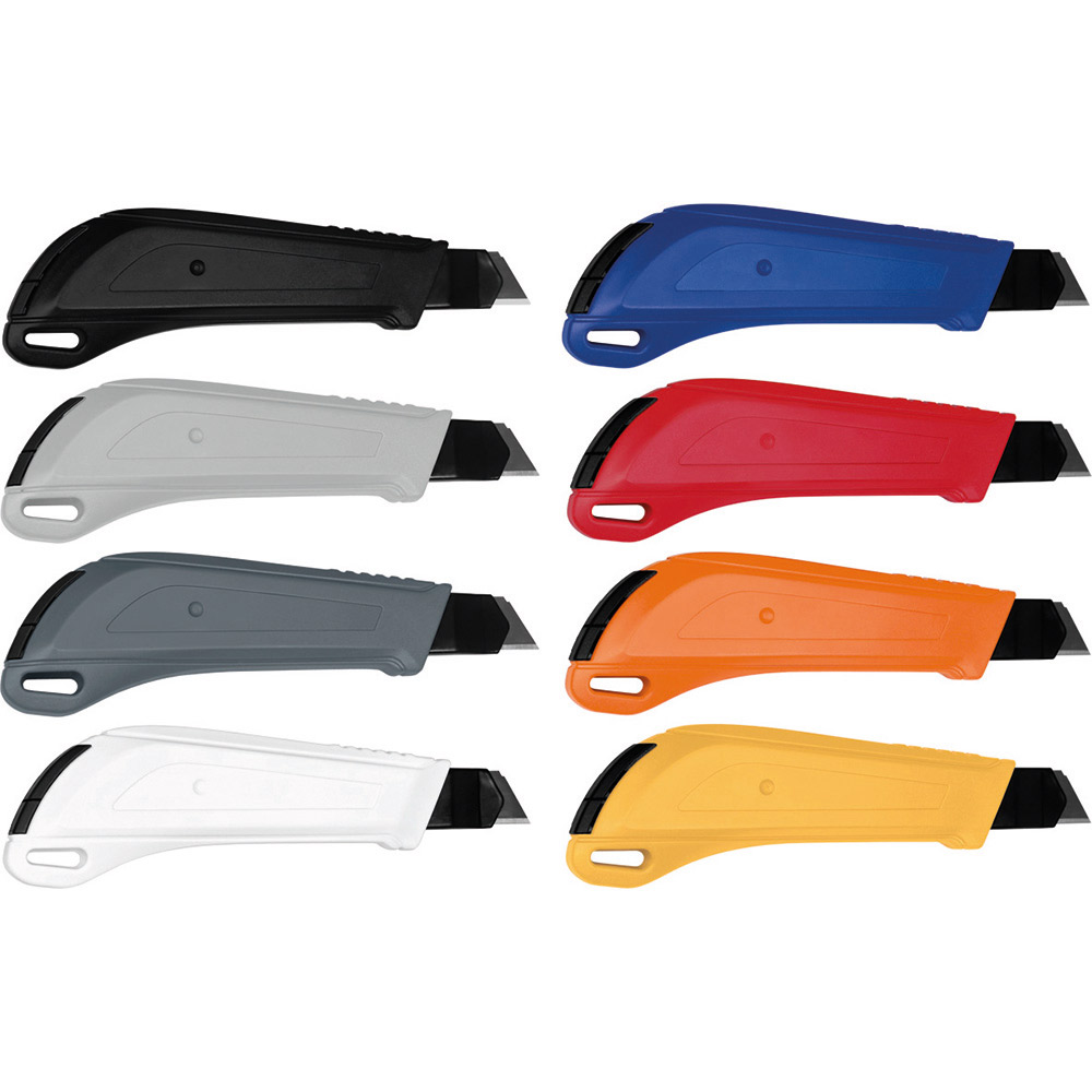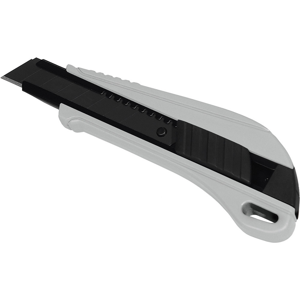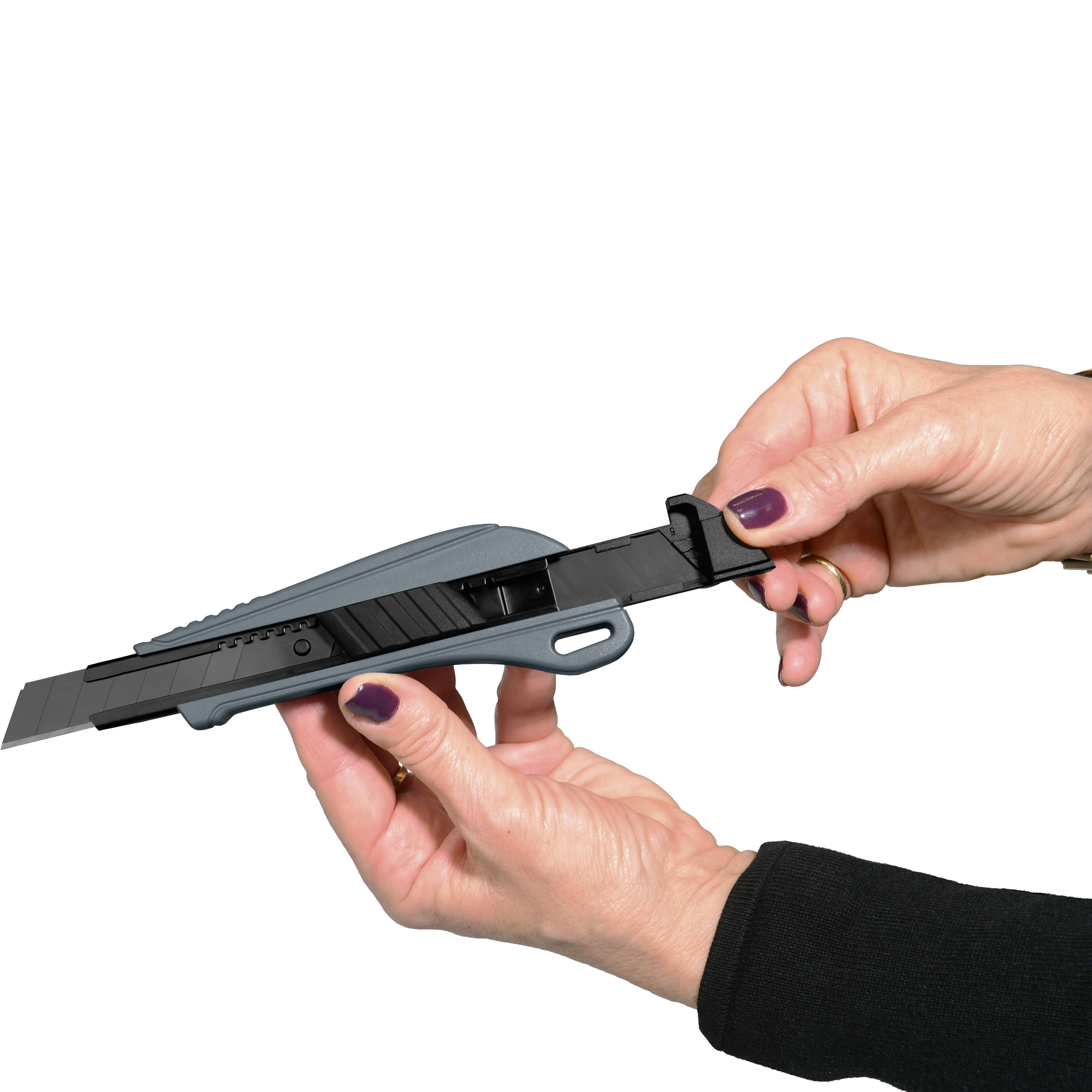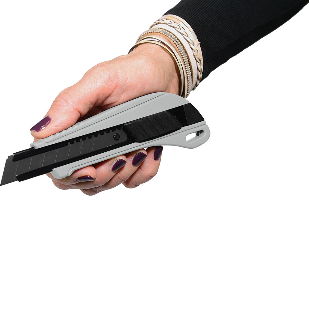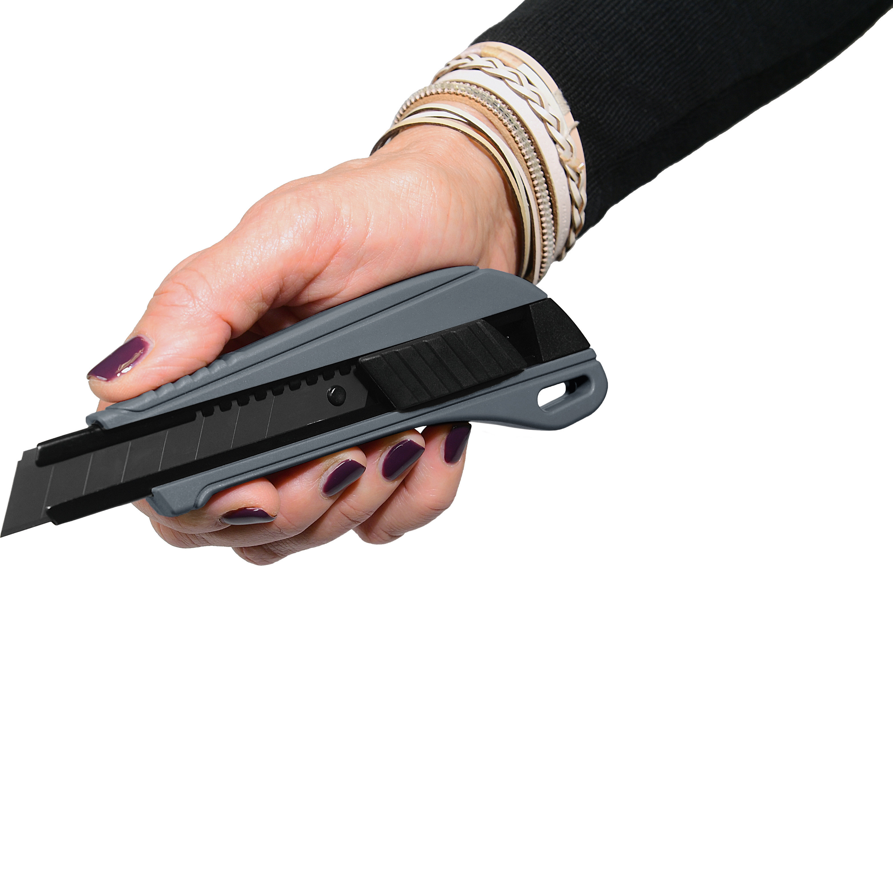 Hochwertiges, ergonomisches Qualitäts-Cuttermesser mit 18 mm SK2 Hochleistungs-Abbrechklinge. Extrem hohe Schnitthaltigkeit durch den hohen Kohlenstoffgehalt der SK2 Stahlklinge. Die schwarze Klinge steht für besondere Schärfe und Langlebigkeit. Ein spezieller Schliff erhöht die Anfangsschärfe. In der äußerst robusten Edelstahl-Führungsschiene mit Schieberaster, kann die Klinge in der gewünschten Länge arretiert werden. Die Rücklaufsperre in der Führungsschiene verhindert, dass die Klinge beim Zurückfahren einfach aus dem Gehäuse springt. Material: schlagfestes Gehäuse aus ABS, Klingenführungsschiene aus schwarz beschichtetem Edelstahl 430, Schieber aus TPR / ABS. Klinge: 18 mm Abbrechklinge aus SK2 Carbonstahl, Stärke 0,5 mm, Rockwell 62~65 HRC (gehobene Premium-Qualitätsstufe), Korrosionsschutz durch schwarze Beschichtung, max. Klingenausschub 79 mm, dreifach facettengeschärfte Schnittkante, 7 Abbrechsegmente für 8-fache Nutzung. Funktionen: Rücklaufsperre in der Klingenführungsschiene, Endkappe zum Abbrechen der Klingen-Segmente, Klingen-Feststellmechanismus, Öse zum Anbringen eines Lanyards oder Fangriemen. Zubehör: 2 Ersatzklingen im separaten Ersatzklingenbehälter. Verpackung: schwarze Geschenkverpackung