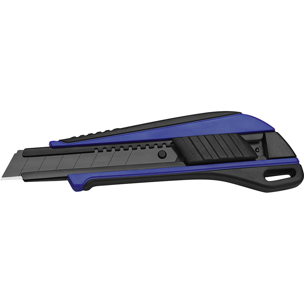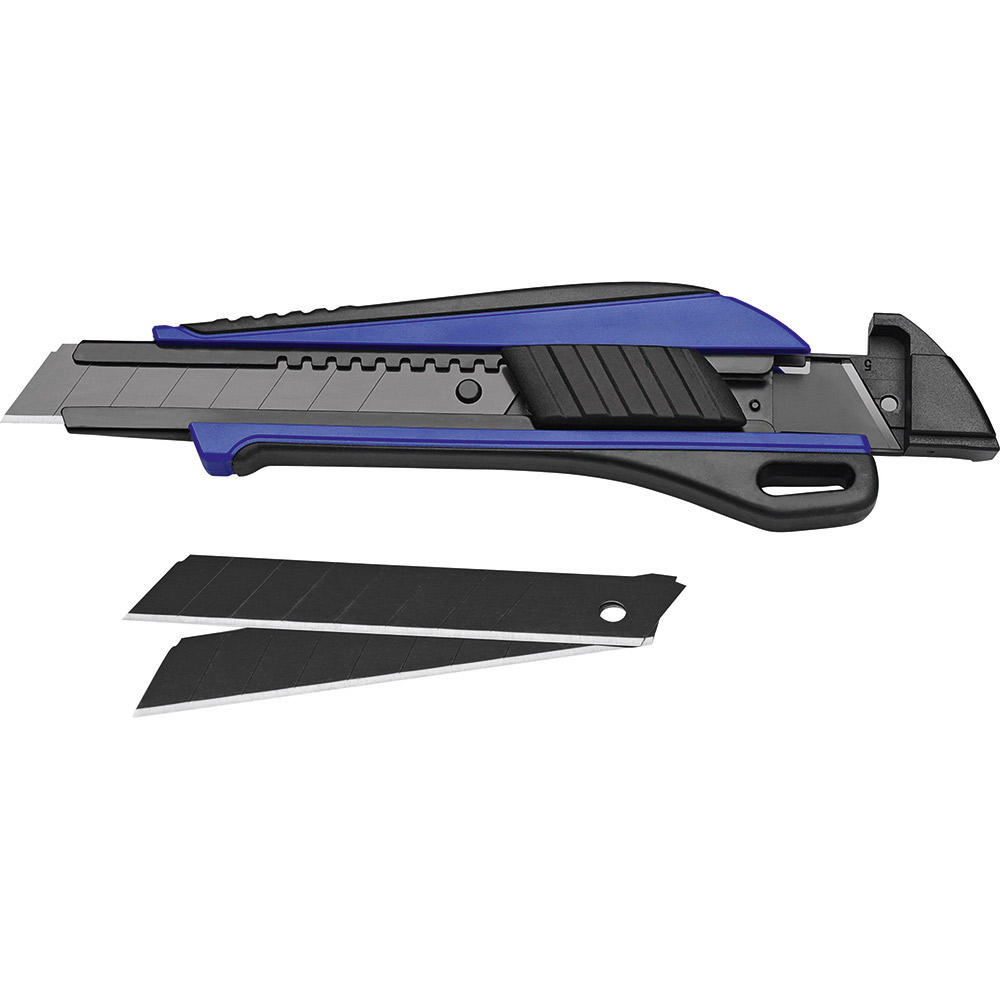 2K Professional - Cuttermesser mit 18 mm SK2 Hochleistungs-Abbrechklinge. Absolut hochwertiges Qualitäts-Cuttermesser, ergonomisch und stabil, mit schlagfestem 2-Komponenten-Gehäuse aus ABS und TPR und 18 mm SK2 Hochleistungs-Abbrechklinge für eine sichere Handhabung. Extrem hohe Schnitthaltigkeit durch den hohen Kohlenstoffgehalt der SK2 Stahlklinge. Die schwarze Klinge steht für besondere Schärfe und Langlebigkeit. Ein spezieller Schliff erhöht die Anfangsschärfe. In der äußerst robusten Edelstahl-Führungsschiene mit Schieberaster, kann die Klinge in der gewünschten Länge arretiert werden. Die Rücklaufsperre in der Klingenführungsschiene verhindert, dass die Klinge beim Zurückfahren aus dem Gehäuse springt. Material: schlagfestes 2-Komponenten-Gehäuse aus ABS und TPR, Klingenführungsschiene aus schwarz beschichtetem Edelstahl 430, Schieber aus TPR / ABS. Klinge: 18 mm Abbrechklinge aus SK2 Carbonstahl, Stärke 0,5 mm, Rockwell 62 ~ 65 HRC (gehobene Premium-Qualitätsstufe), Korrosionsschutz durch schwarze Beschichtung, max. Klingenausschub 79 mm, dreifach facettengeschärfte Schnittkante, 7 Abbrechsegmente für 8-fache Nutzung. Funktionen: Rücklaufsperre in der Klingenführungsschiene, Endkappe zum Abbrechen der Klingen-Segmente, Öse zum Anbringen eines Lanyards oder Fangriemen. Zubehör: 2 Ersatzklingen im separaten Ersatzklingenbehälter. Verpackung: schwarze Geschenkverpackung.