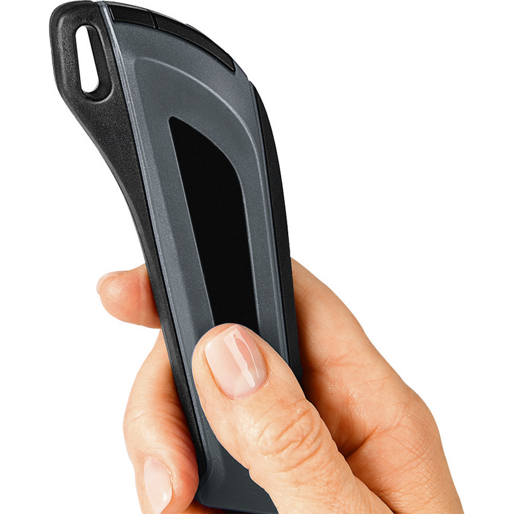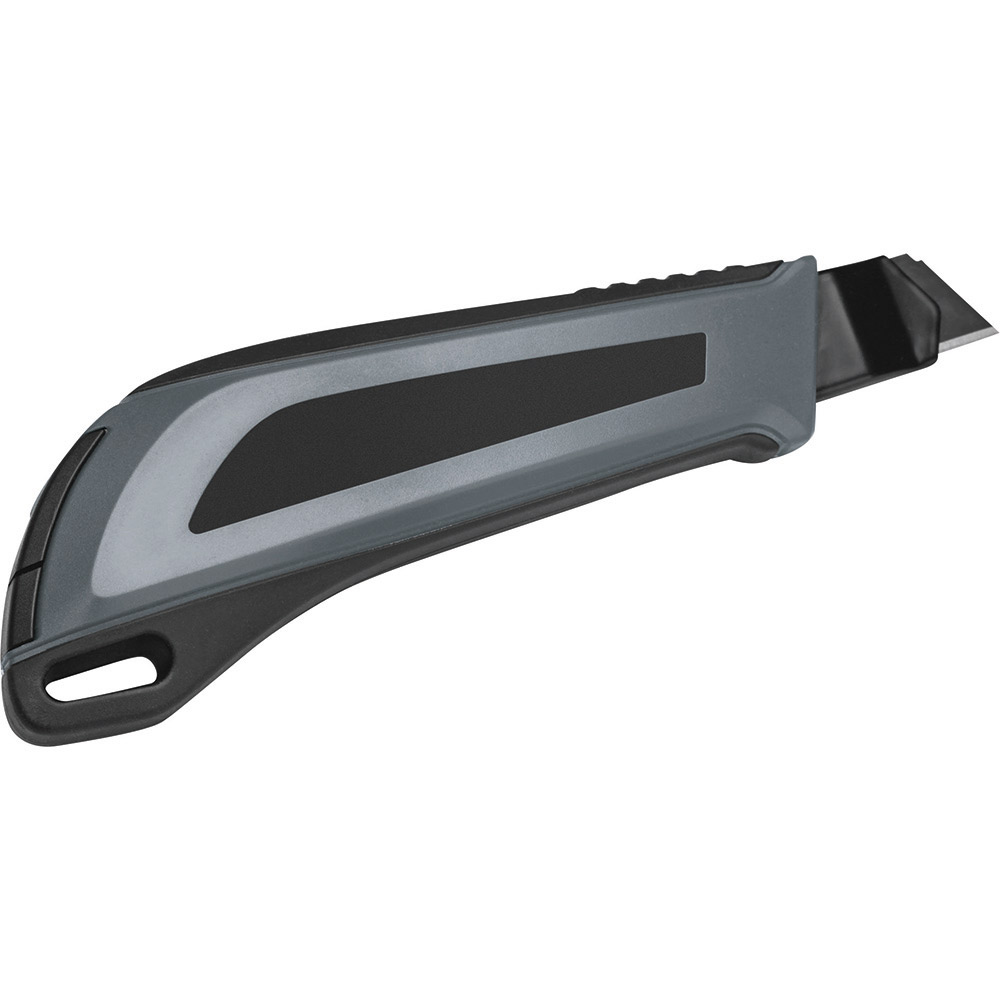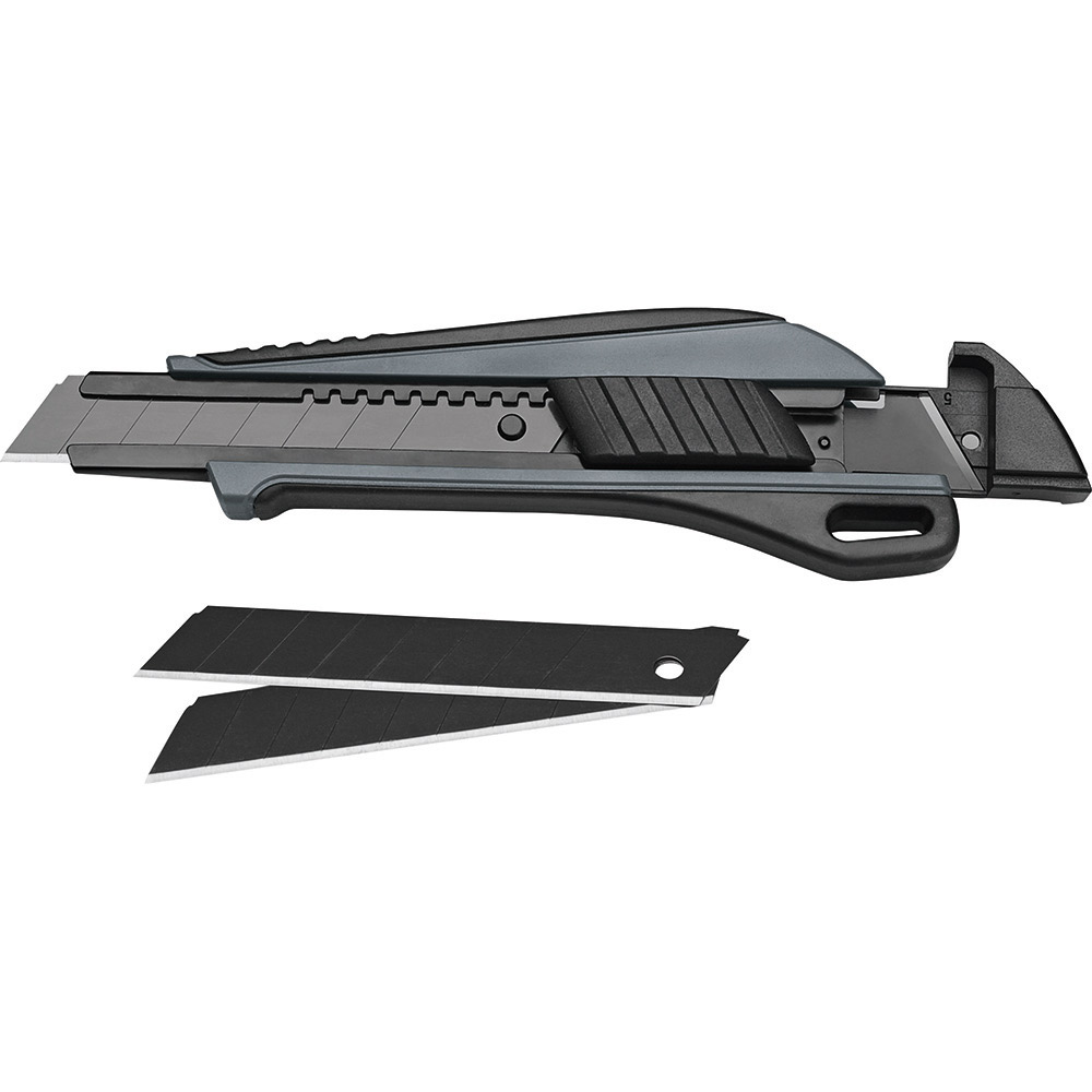 2K Professional - Cuttermesser mit 18 mm SK2 Hochleistungs-Abbrechklinge. Absolut hochwertiges Qualitäts-Cuttermesser, ergonomisch und stabil, mit schlagfestem 2-Komponenten-Gehäuse aus ABS und TPR und 18 mm SK2 Hochleistungs-Abbrechklinge für eine sichere Handhabung. Extrem hohe Schnitthaltigkeit durch den hohen Kohlenstoffgehalt der SK2 Stahlklinge. Die schwarze Klinge steht für besondere Schärfe und Langlebigkeit. Ein spezieller Schliff erhöht die Anfangsschärfe. In der äußerst robusten Edelstahl-Führungsschiene mit Schieberaster, kann die Klinge in der gewünschten Länge arretiert werden. Die Rücklaufsperre in der Klingenführungsschiene verhindert, dass die Klinge beim Zurückfahren aus dem Gehäuse springt. Material: schlagfestes 2-Komponenten-Gehäuse aus ABS und TPR, Klingenführungsschiene aus schwarz beschichtetem Edelstahl 430, Schieber aus TPR / ABS. Klinge: 18 mm Abbrechklinge aus SK2 Carbonstahl, Stärke 0,5 mm, Rockwell 62 ~ 65 HRC (gehobene Premium-Qualitätsstufe), Korrosionsschutz durch schwarze Beschichtung, max. Klingenausschub 79 mm, dreifach facettengeschärfte Schnittkante, 7 Abbrechsegmente für 8-fache Nutzung. Funktionen: Rücklaufsperre in der Klingenführungsschiene, Endkappe zum Abbrechen der Klingen-Segmente, Öse zum Anbringen eines Lanyards oder Fangriemen. Zubehör: 2 Ersatzklingen im separaten Ersatzklingenbehälter. Verpackung: schwarze Geschenkverpackung.