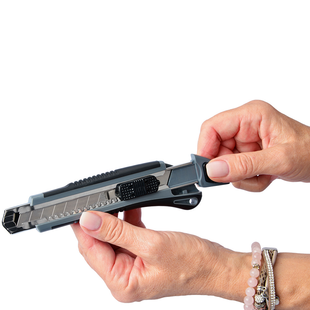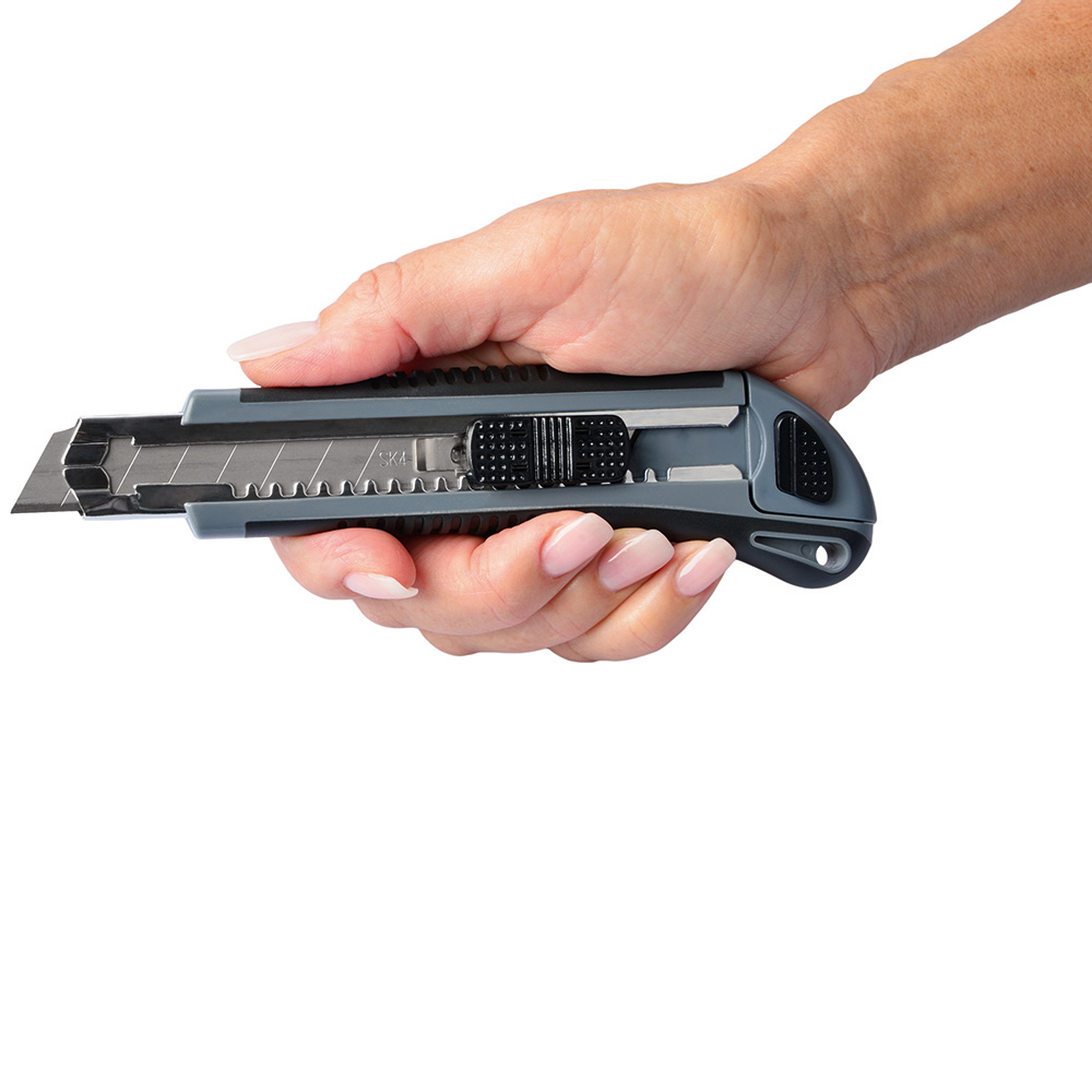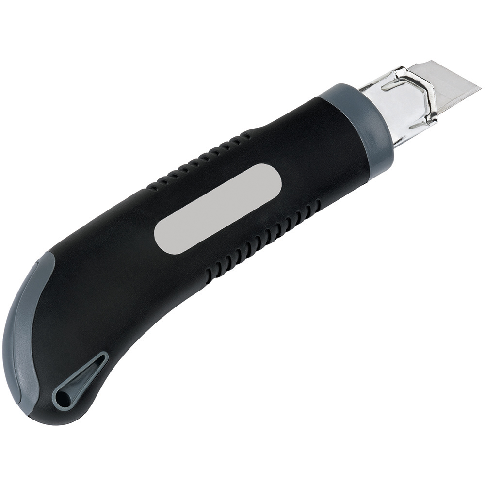 Cuttermesser mit 18 mm Abbrechklinge. Hohe Schnitthaltigkeit durch einen 3-fach Klingenschliff und bis zu 50% schärfer als Standardklingen. In der Metallführungsschiene mit Schieberaster kann die Klinge in der gewünschten Länge arretiert werden. Verbrauchte Klingen werden durch Ersatzklingen, die in einem Magazin im Gehäuse verstaut werden, automatisch nachgeladen. Material: schlagfestes 2-Komponenten-Gehäuse aus ABS mit TPR Ummantelung, Klingenführungsschiene aus Metall. Klinge: 18 mm Abbrechklinge aus SK4 Carbonstahl, Stärke 0,5 mm, Rockwell 62 HRC (gehobene Qualitätsstufe), max. Klingenausschub 79 mm, 2-seitiger 3-fach Klingenschliff, 7 Abbrechsegmente für 8-fache Nutzung. Funktionen: automatisches Nachladen der Klingen, Öse zum Anbringen eines Lanyards oder Fangriemen. Zubehör: 2 Ersatzklingen im Gehäuse. Verpackung: schwarze Geschenkverpackung.