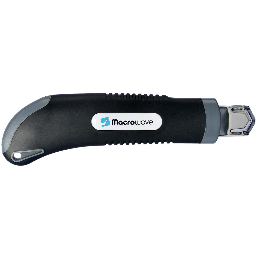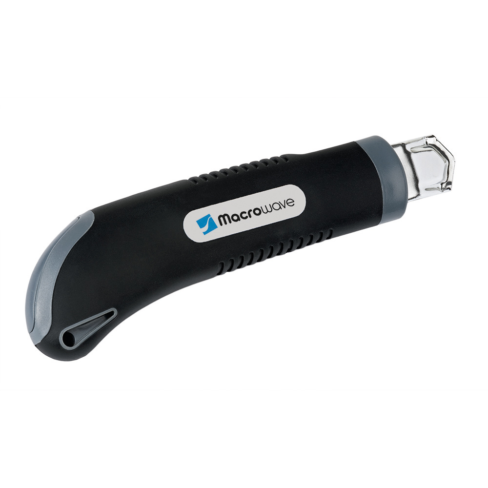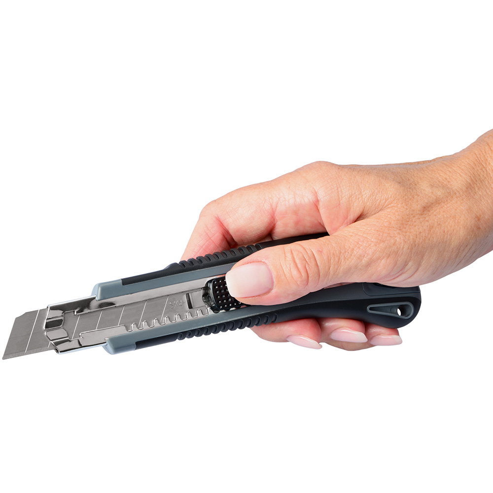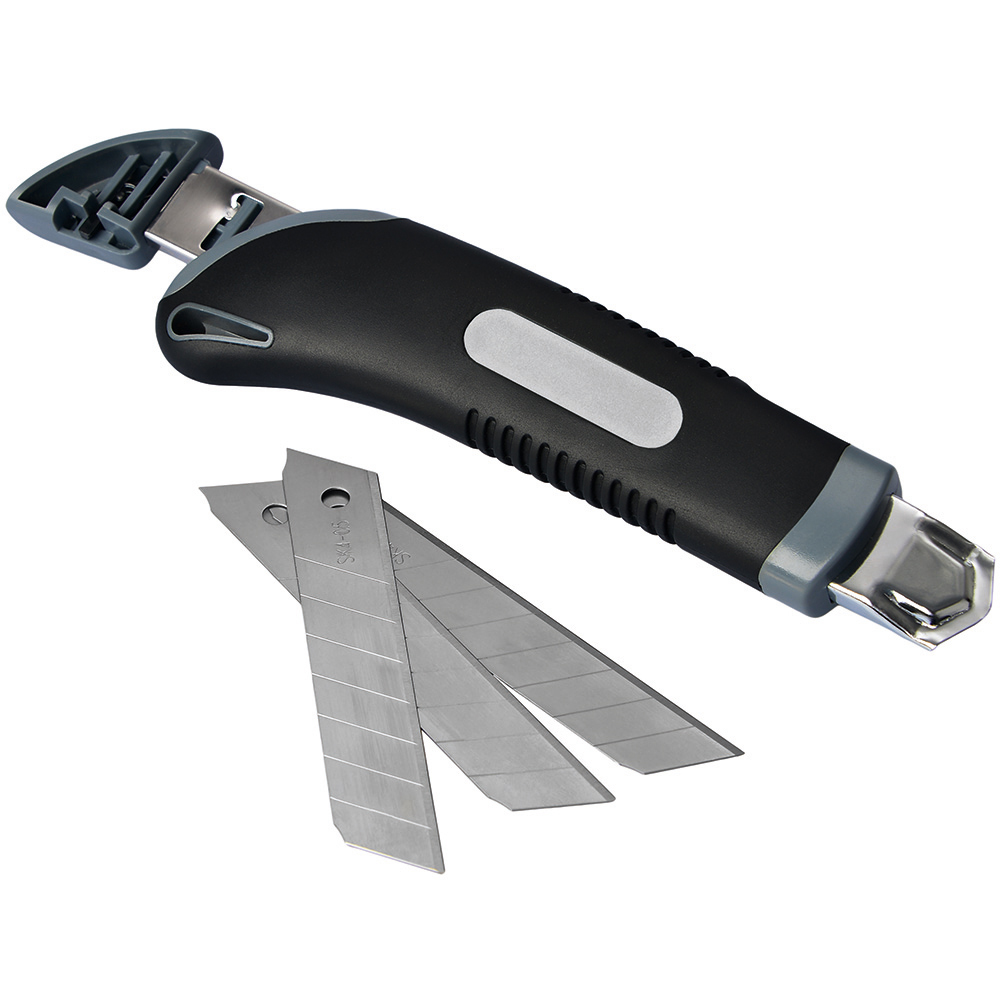 Cuttermesser mit 18 mm Abbrechklinge. Hohe Schnitthaltigkeit durch einen 3-fach Klingenschliff und bis zu 50% schärfer als Standardklingen. In der Metallführungsschiene mit Schieberaster kann die Klinge in der gewünschten Länge arretiert werden. Verbrauchte Klingen werden durch Ersatzklingen, die in einem Magazin im Gehäuse verstaut werden, automatisch nachgeladen. Material: schlagfestes 2-Komponenten-Gehäuse aus ABS mit TPR Ummantelung, Klingenführungsschiene aus Metall. Klinge: 18 mm Abbrechklinge aus SK4 Carbonstahl, Stärke 0,5 mm, Rockwell 62 HRC (gehobene Qualitätsstufe), max. Klingenausschub 79 mm, 2-seitiger 3-fach Klingenschliff, 7 Abbrechsegmente für 8-fache Nutzung. Funktionen: automatisches Nachladen der Klingen, Öse zum Anbringen eines Lanyards oder Fangriemen. Zubehör: 2 Ersatzklingen im Gehäuse. Verpackung: schwarze Geschenkverpackung.