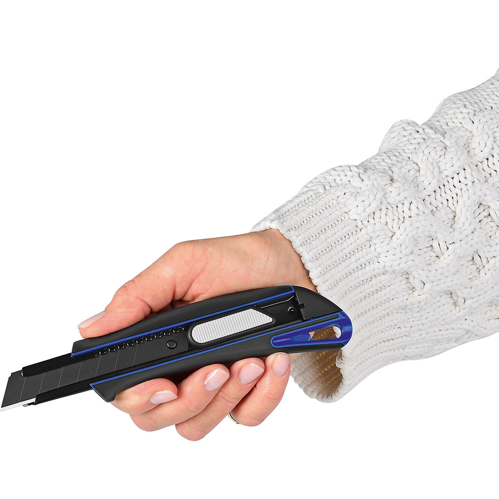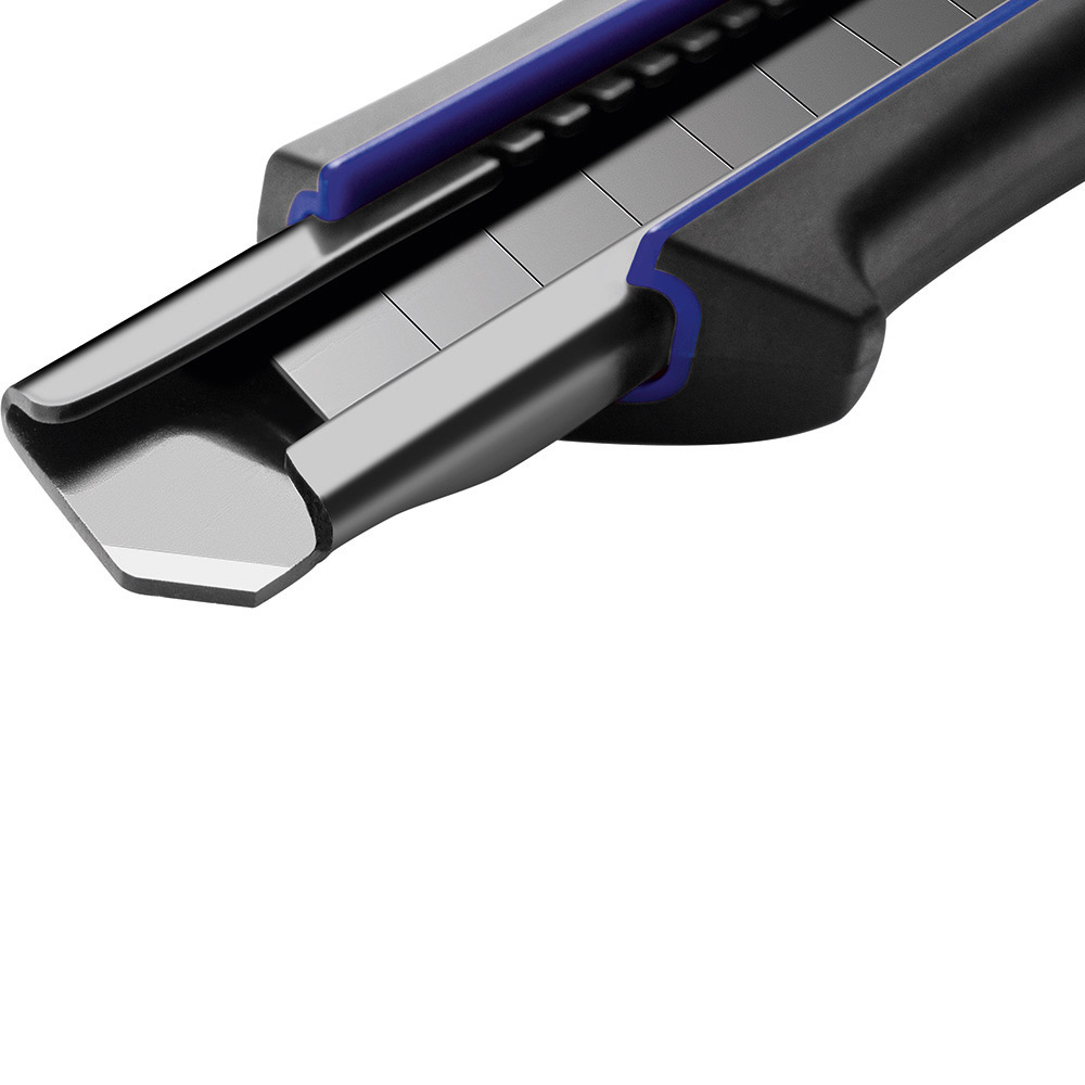 Qualitäts-Cuttermesser mit 18 mm SK2 Hochleistungs-Abbrechklinge. Höhere Stabilität der Klinge durch 0,6 mm Stärke, im Vergleich zu Standardklingen. Das Messer eignet sich daher auch für das Schneiden von stärkerem Schneidgut. Extrem hohe Schnitthaltigkeit durch den hohen Kohlenstoffgehalt der SK2 Stahlklinge. Die schwarze Klinge steht für besondere Schärfe und Langlebigkeit. Ein spezieller Schliff erhöht die Anfangsschärfe. In der Metallführungsschiene mit Schieberaster kann die Klinge in der gewünschten Länge arretiert werden. Die Rücklaufsperre in der Führungsschiene verhindert, dass die Klinge beim Zurückfahren aus dem Gehäuse springt. Die Spitze der Klingenführungsschiene ist extra gehärtet, sodass diese auch als Farbdosenöffner, Notschraubendreher, oder als Schnellschneider für Paketklebeband, usw. verwendet werden kann, ohne die Klinge ausfahren zu müssen. Material: schlagfestes 2-Komponenten-Gehäuse aus TPR und ABS, Klingenführungsschiene aus schwarz beschichtetem Edelstahl 430, Schieber aus TPR / ABS. Klinge: 18 mm Abbrechklinge aus SK2 Carbonstahl, Stärke 0,6 mm, Rockwell 62~65 HRC (gehobene Qualitätsstufe), Korrosionsschutz durch schwarze Beschichtung, max. Klingenausschub 75 mm, 2-seitiger Klingenschliff, 7 Abbrechsegmente für 8-fache Nutzung. Funktionen: Rücklaufsperre in der Klingenführungsschiene, Endkappe zum Abbrechen der Segmente, Öse zum Anbringen eines Lanyards oder Fangriemen. Verpackung: schwarze Geschenkverpackung.