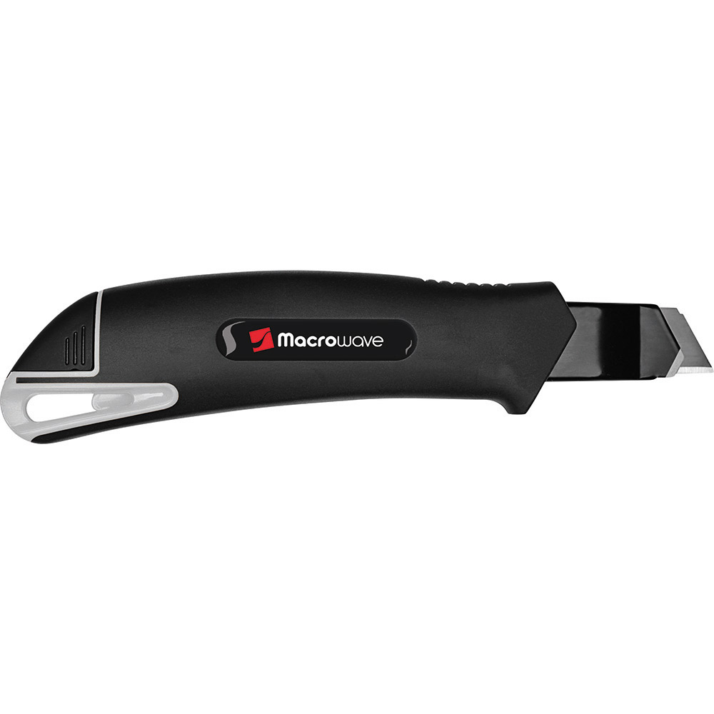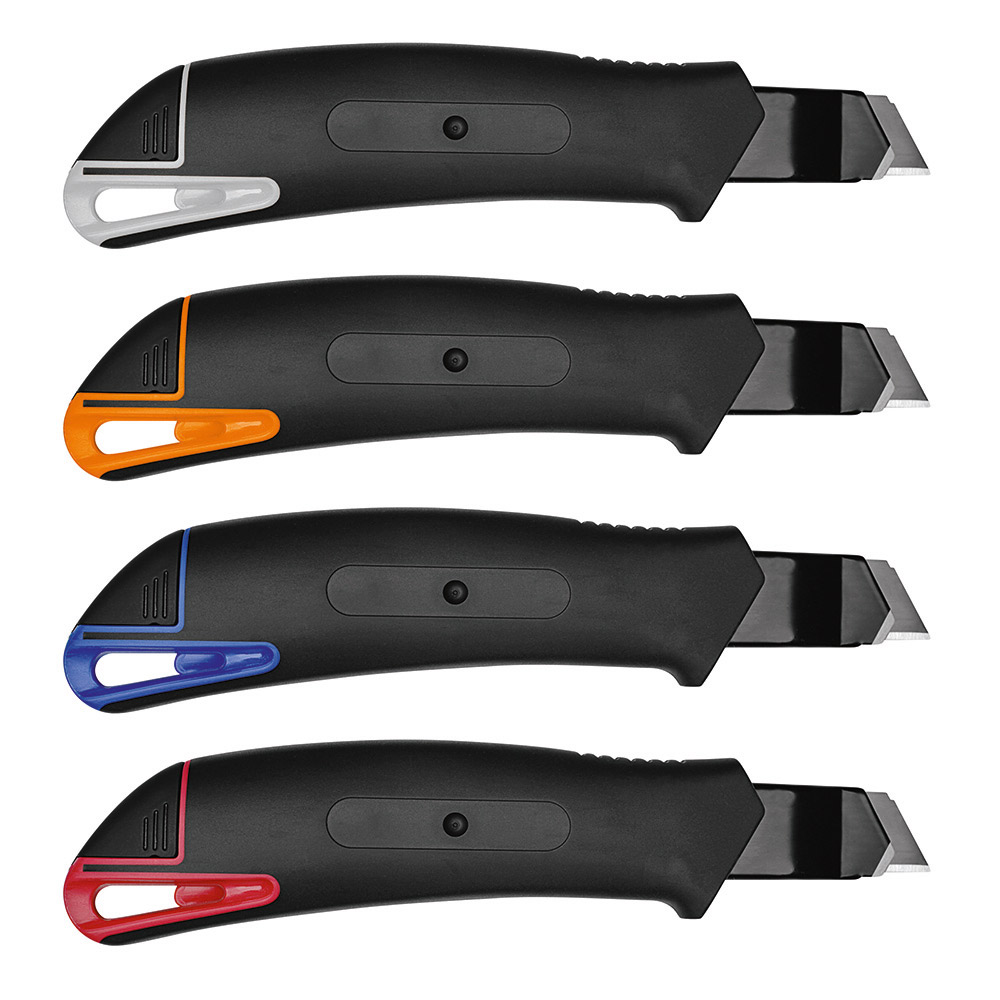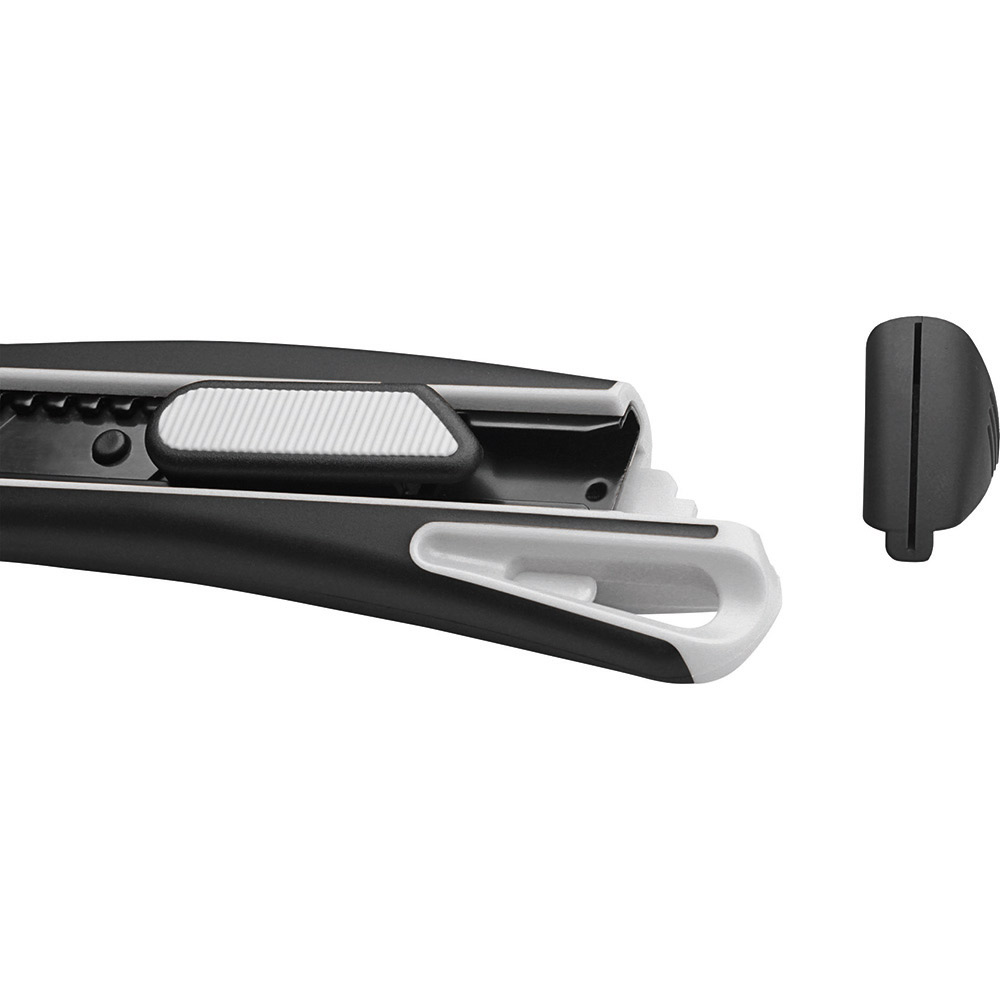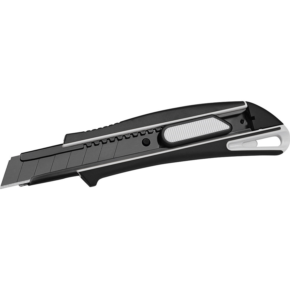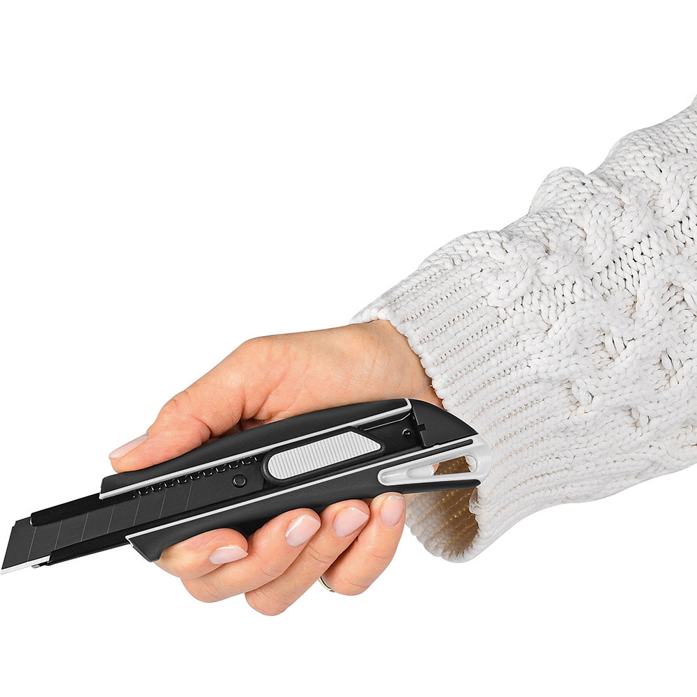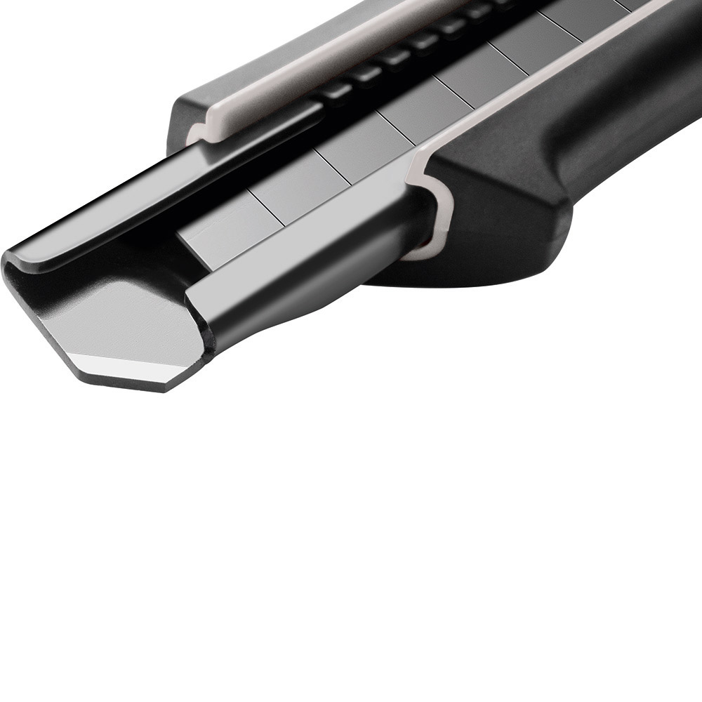 Qualitäts-Cuttermesser mit 18 mm SK2 Hochleistungs-Abbrechklinge. Höhere Stabilität der Klinge durch 0,6 mm Stärke, im Vergleich zu Standardklingen. Das Messer eignet sich daher auch für das Schneiden von stärkerem Schneidgut. Extrem hohe Schnitthaltigkeit durch den hohen Kohlenstoffgehalt der SK2 Stahlklinge. Die schwarze Klinge steht für besondere Schärfe und Langlebigkeit. Ein spezieller Schliff erhöht die Anfangsschärfe. In der Metallführungsschiene mit Schieberaster kann die Klinge in der gewünschten Länge arretiert werden. Die Rücklaufsperre in der Führungsschiene verhindert, dass die Klinge beim Zurückfahren aus dem Gehäuse springt. Die Spitze der Klingenführungsschiene ist extra gehärtet, sodass diese auch als Farbdosenöffner, Notschraubendreher, oder als Schnellschneider für Paketklebeband, usw. verwendet werden kann, ohne die Klinge ausfahren zu müssen. Material: schlagfestes 2-Komponenten-Gehäuse aus TPR und ABS, Klingenführungsschiene aus schwarz beschichtetem Edelstahl 430, Schieber aus TPR / ABS. Klinge: 18 mm Abbrechklinge aus SK2 Carbonstahl, Stärke 0,6 mm, Rockwell 62~65 HRC (gehobene Qualitätsstufe), Korrosionsschutz durch schwarze Beschichtung, max. Klingenausschub 75 mm, 2-seitiger Klingenschliff, 7 Abbrechsegmente für 8-fache Nutzung. Funktionen: Rücklaufsperre in der Klingenführungsschiene, Endkappe zum Abbrechen der Segmente, Öse zum Anbringen eines Lanyards oder Fangriemen. Verpackung: schwarze Geschenkverpackung.