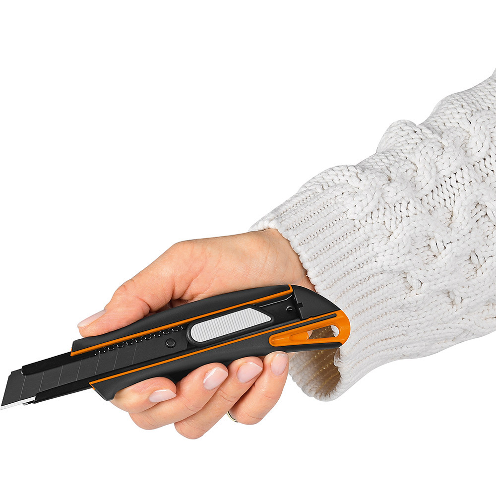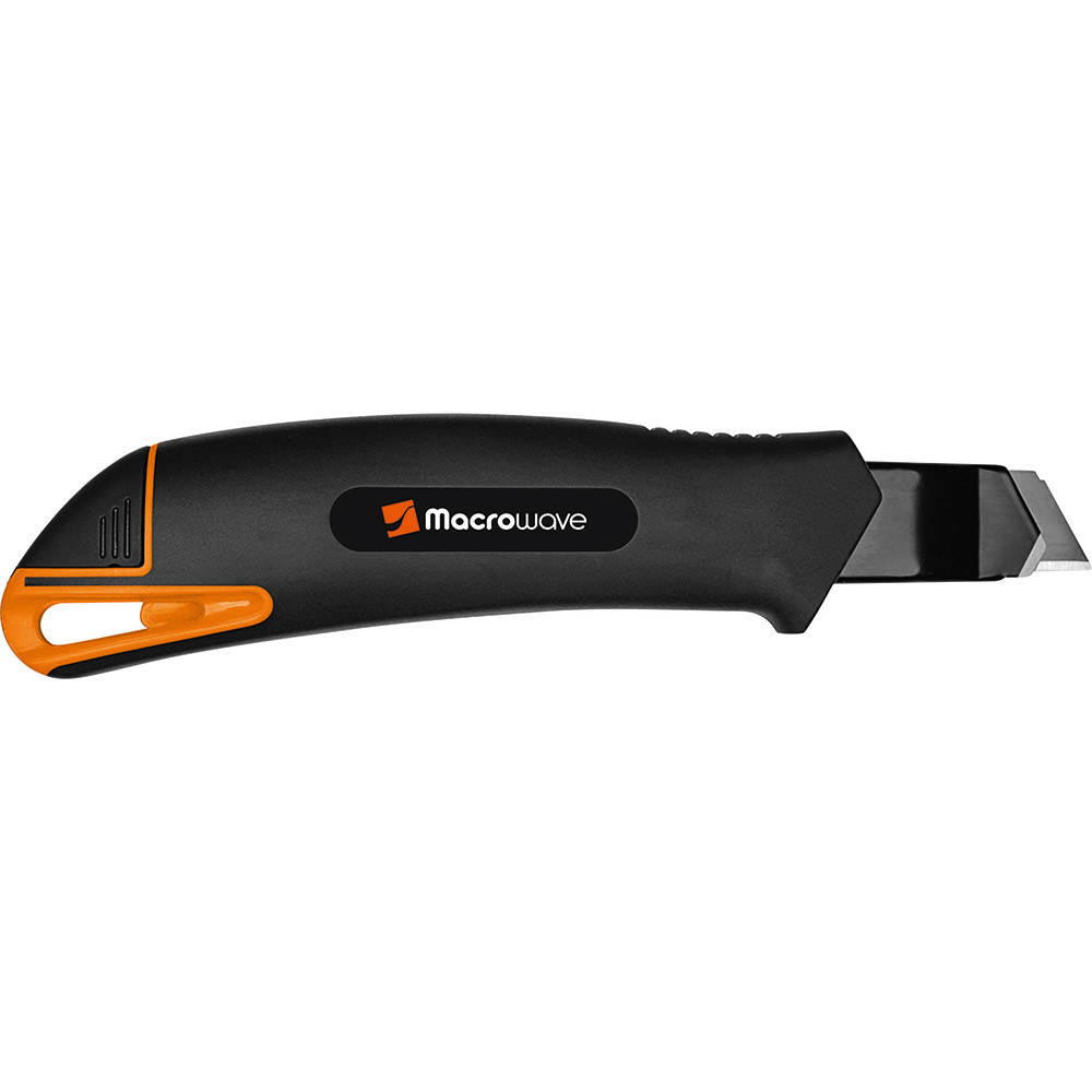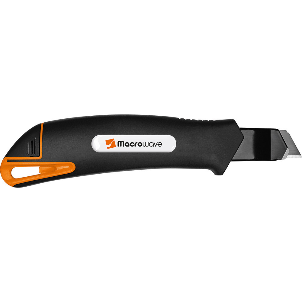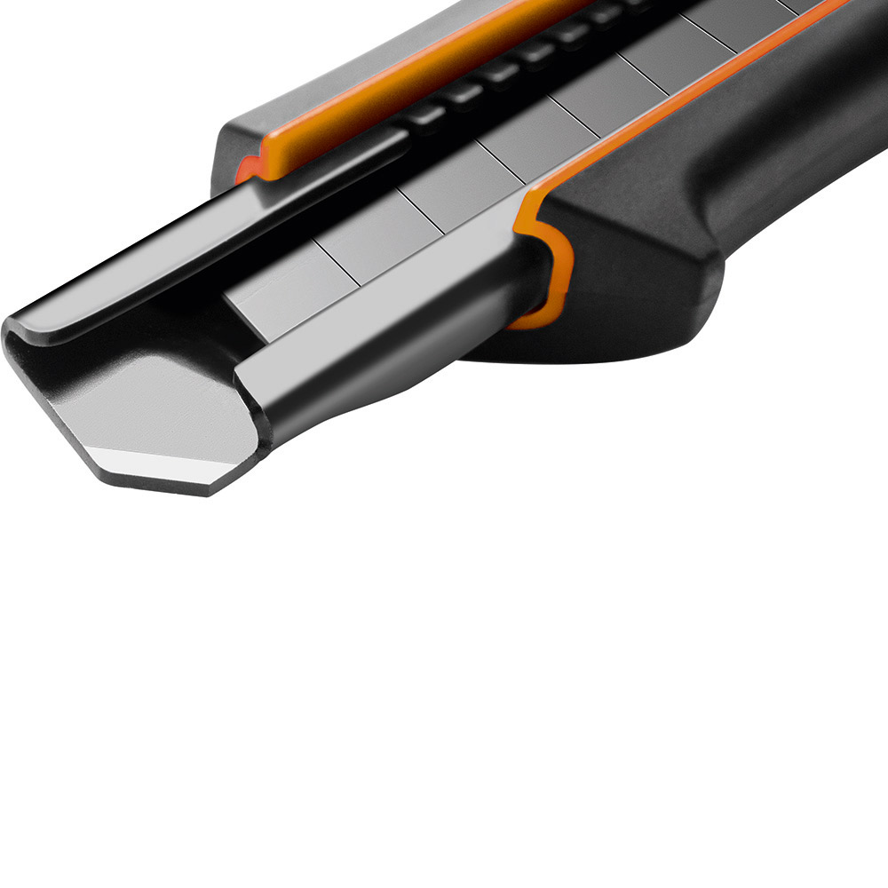 Qualitäts-Cuttermesser mit 18 mm SK2 Hochleistungs-Abbrechklinge. Höhere Stabilität der Klinge durch 0,6 mm Stärke, im Vergleich zu Standardklingen. Das Messer eignet sich daher auch für das Schneiden von stärkerem Schneidgut. Extrem hohe Schnitthaltigkeit durch den hohen Kohlenstoffgehalt der SK2 Stahlklinge. Die schwarze Klinge steht für besondere Schärfe und Langlebigkeit. Ein spezieller Schliff erhöht die Anfangsschärfe. In der Metallführungsschiene mit Schieberaster kann die Klinge in der gewünschten Länge arretiert werden. Die Rücklaufsperre in der Führungsschiene verhindert, dass die Klinge beim Zurückfahren aus dem Gehäuse springt. Die Spitze der Klingenführungsschiene ist extra gehärtet, sodass diese auch als Farbdosenöffner, Notschraubendreher, oder als Schnellschneider für Paketklebeband, usw. verwendet werden kann, ohne die Klinge ausfahren zu müssen. Material: schlagfestes 2-Komponenten-Gehäuse aus TPR und ABS, Klingenführungsschiene aus schwarz beschichtetem Edelstahl 430, Schieber aus TPR / ABS. Klinge: 18 mm Abbrechklinge aus SK2 Carbonstahl, Stärke 0,6 mm, Rockwell 62~65 HRC (gehobene Qualitätsstufe), Korrosionsschutz durch schwarze Beschichtung, max. Klingenausschub 75 mm, 2-seitiger Klingenschliff, 7 Abbrechsegmente für 8-fache Nutzung. Funktionen: Rücklaufsperre in der Klingenführungsschiene, Endkappe zum Abbrechen der Segmente, Öse zum Anbringen eines Lanyards oder Fangriemen. Verpackung: schwarze Geschenkverpackung.