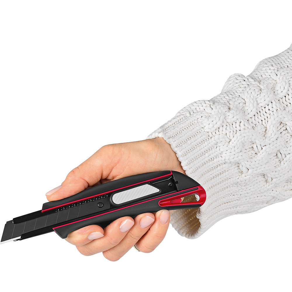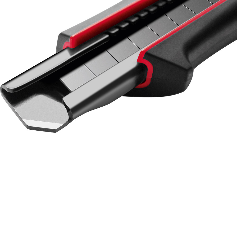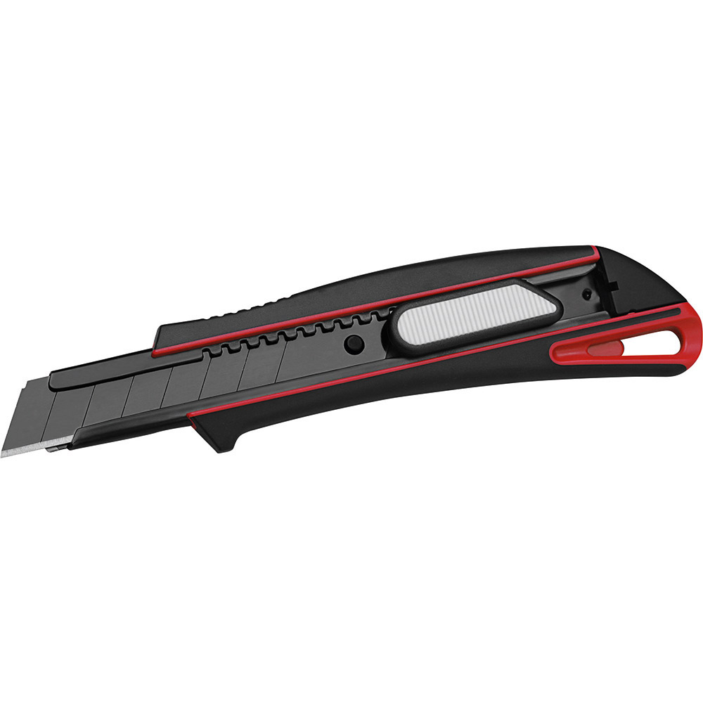 Qualitäts-Cuttermesser mit 18 mm SK2 Hochleistungs-Abbrechklinge. Höhere Stabilität der Klinge durch 0,6 mm Stärke, im Vergleich zu Standardklingen. Das Messer eignet sich daher auch für das Schneiden von stärkerem Schneidgut. Extrem hohe Schnitthaltigkeit durch den hohen Kohlenstoffgehalt der SK2 Stahlklinge. Die schwarze Klinge steht für besondere Schärfe und Langlebigkeit. Ein spezieller Schliff erhöht die Anfangsschärfe. In der Metallführungsschiene mit Schieberaster kann die Klinge in der gewünschten Länge arretiert werden. Die Rücklaufsperre in der Führungsschiene verhindert, dass die Klinge beim Zurückfahren aus dem Gehäuse springt. Die Spitze der Klingenführungsschiene ist extra gehärtet, sodass diese auch als Farbdosenöffner, Notschraubendreher, oder als Schnellschneider für Paketklebeband, usw. verwendet werden kann, ohne die Klinge ausfahren zu müssen. Material: schlagfestes 2-Komponenten-Gehäuse aus TPR und ABS, Klingenführungsschiene aus schwarz beschichtetem Edelstahl 430, Schieber aus TPR / ABS. Klinge: 18 mm Abbrechklinge aus SK2 Carbonstahl, Stärke 0,6 mm, Rockwell 62~65 HRC (gehobene Qualitätsstufe), Korrosionsschutz durch schwarze Beschichtung, max. Klingenausschub 75 mm, 2-seitiger Klingenschliff, 7 Abbrechsegmente für 8-fache Nutzung. Funktionen: Rücklaufsperre in der Klingenführungsschiene, Endkappe zum Abbrechen der Segmente, Öse zum Anbringen eines Lanyards oder Fangriemen. Verpackung: schwarze Geschenkverpackung.
