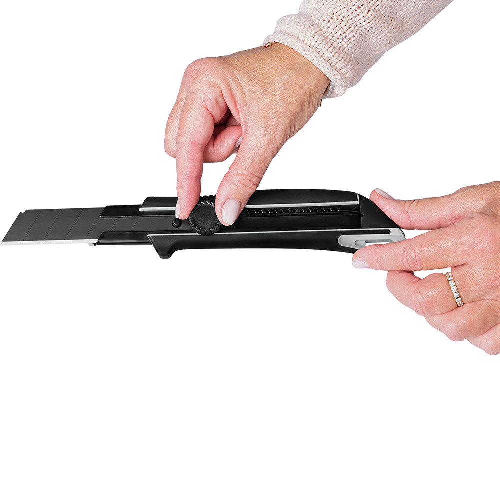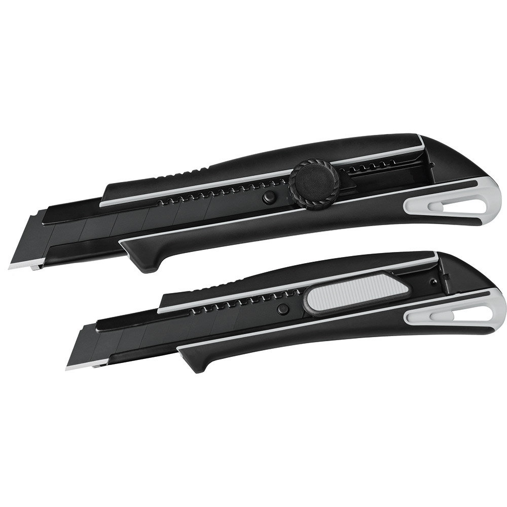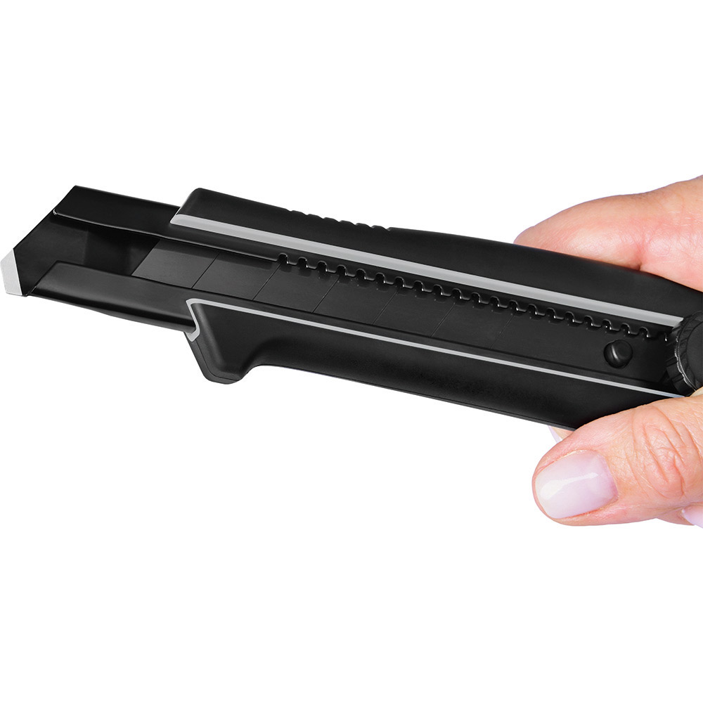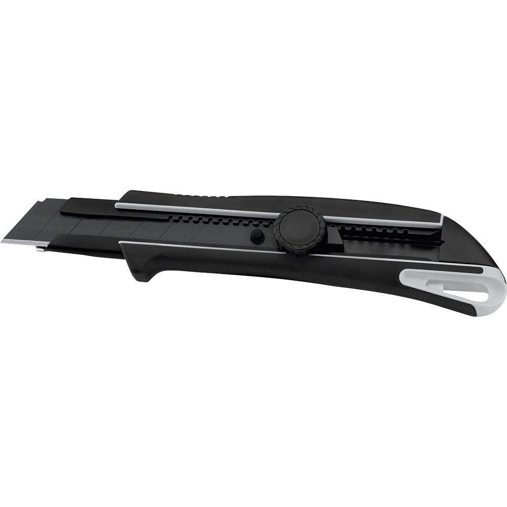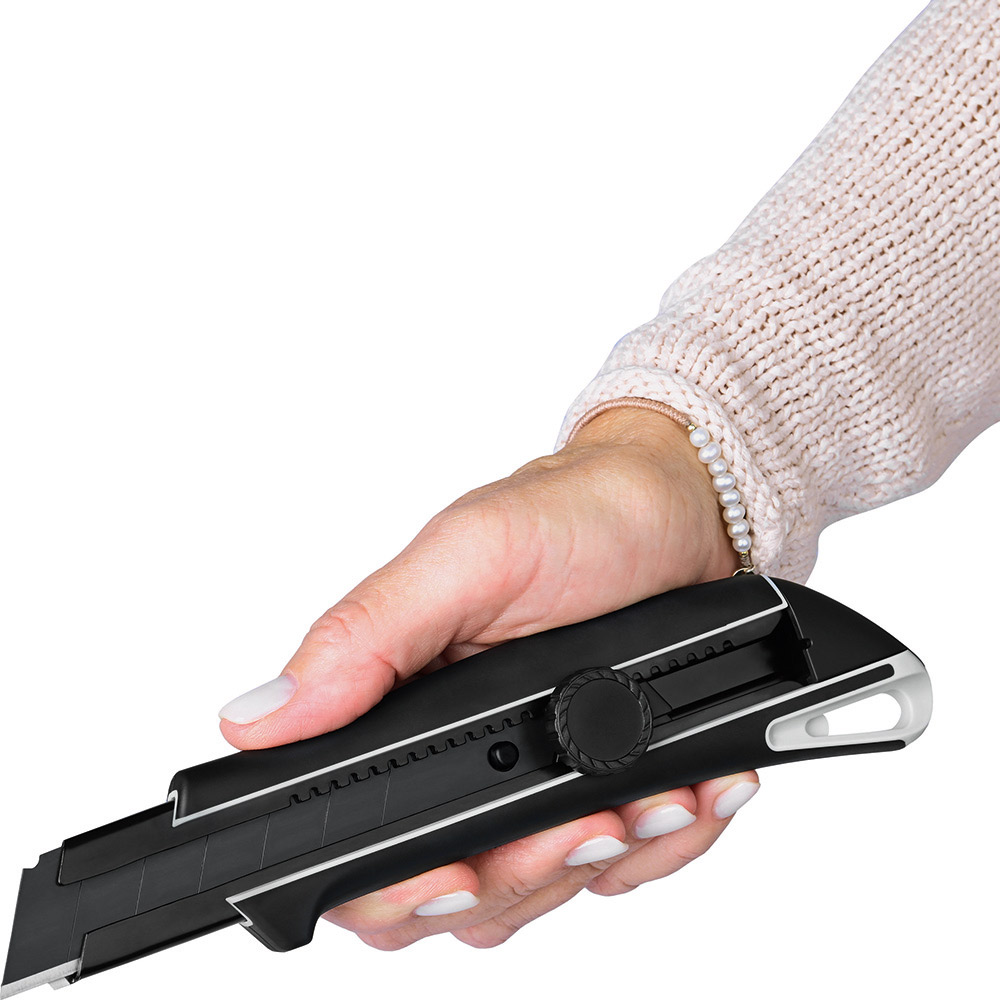 Qualitäts-Cuttermesser mit 25 mm SK2 Hochleistungs-Abbrechklinge und Feststellrad. Das Feststellrad ermöglicht eine stufenlose Feststellung und Fixierung der Klinge. Geeignet für robuste Schneidarbeiten. Extrem hohe Schnitthaltigkeit durch den hohen Kohlenstoffgehalt der SK2 Stahlklinge. Die schwarze Klinge steht für besondere Schärfe und Langlebigkeit. Ein spezieller Schliff erhöht die Anfangsschärfe. Die Spitze der Klingenführungsschiene ist gehärtet, sodass diese auch als Farbdosenöffner, Notschraubendreher, oder als Schnellschneider für Paketklebeband, usw. verwendet werden kann, ohne die Klinge ausfahren zu müssen. Material: schlagfestes 2-Komponenten-Gehäuse aus TPR und ABS, Klingenführungsschiene aus schwarz beschichtetem Edelstahl 430, Feststellrad aus ABS. Klinge: 25 mm Abbrechklinge aus SK2 Carbonstahl, Stärke 0,7 mm, Rockwell 62~65 HRC (gehobene Qualitätsstufe), max. Klingenausschub 68 mm, 2-seitiger Klingenschliff, 6 Abbrechsegmente für 7-fache Nutzung. Funktionen: Rücklaufsperre in der Klingenführungsschiene, Endkappe zum Abbrechen der Segmente, Öse zum Anbringen eines Lanyards oder Fangriemen. Verpackung: schwarze Geschenkverpackung.