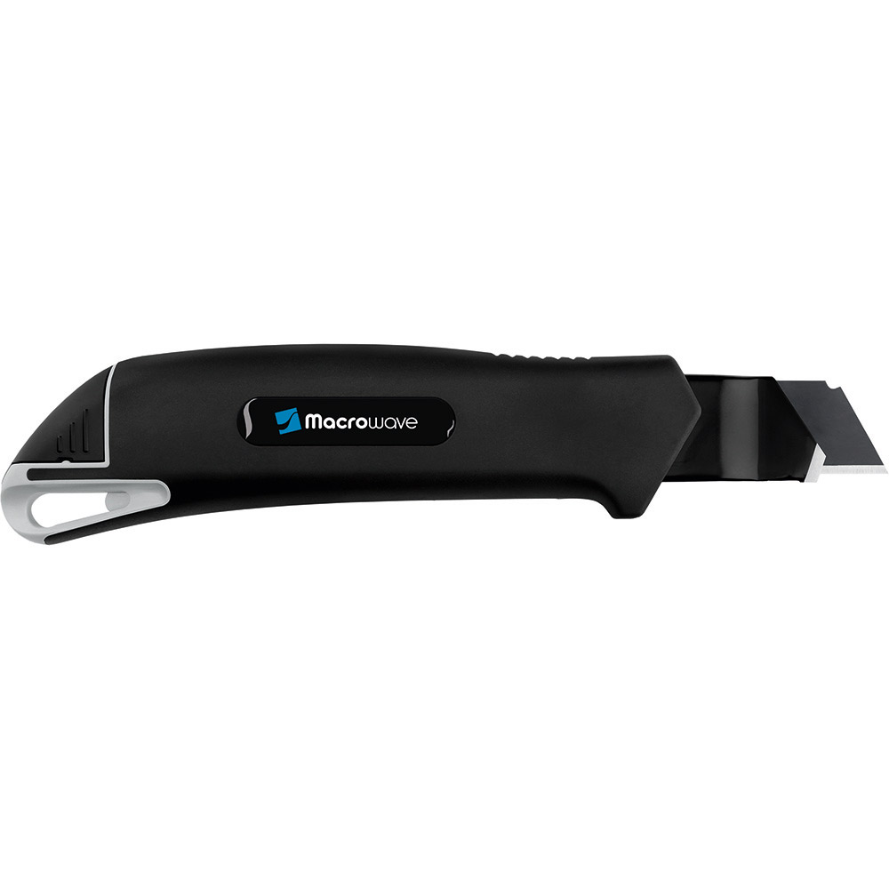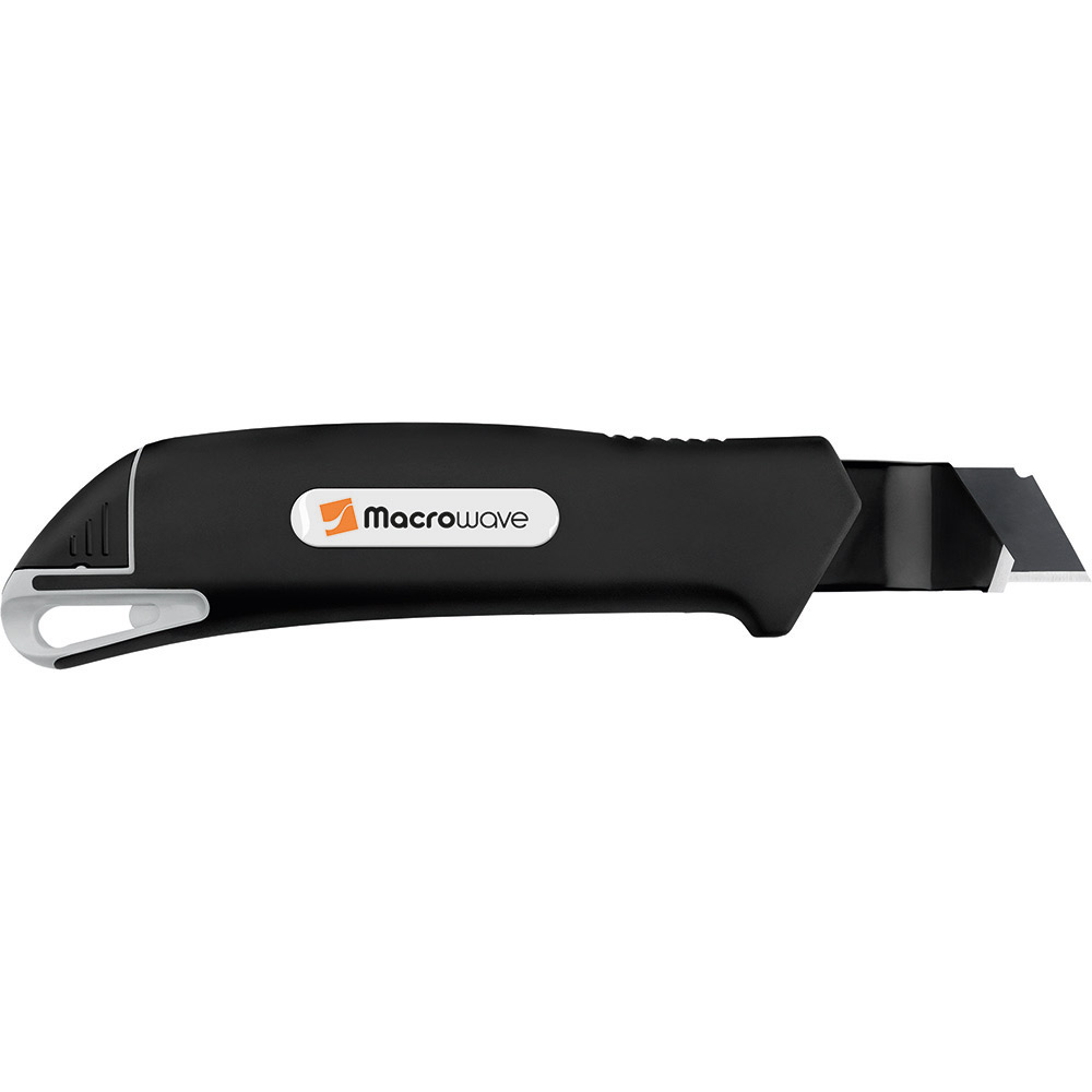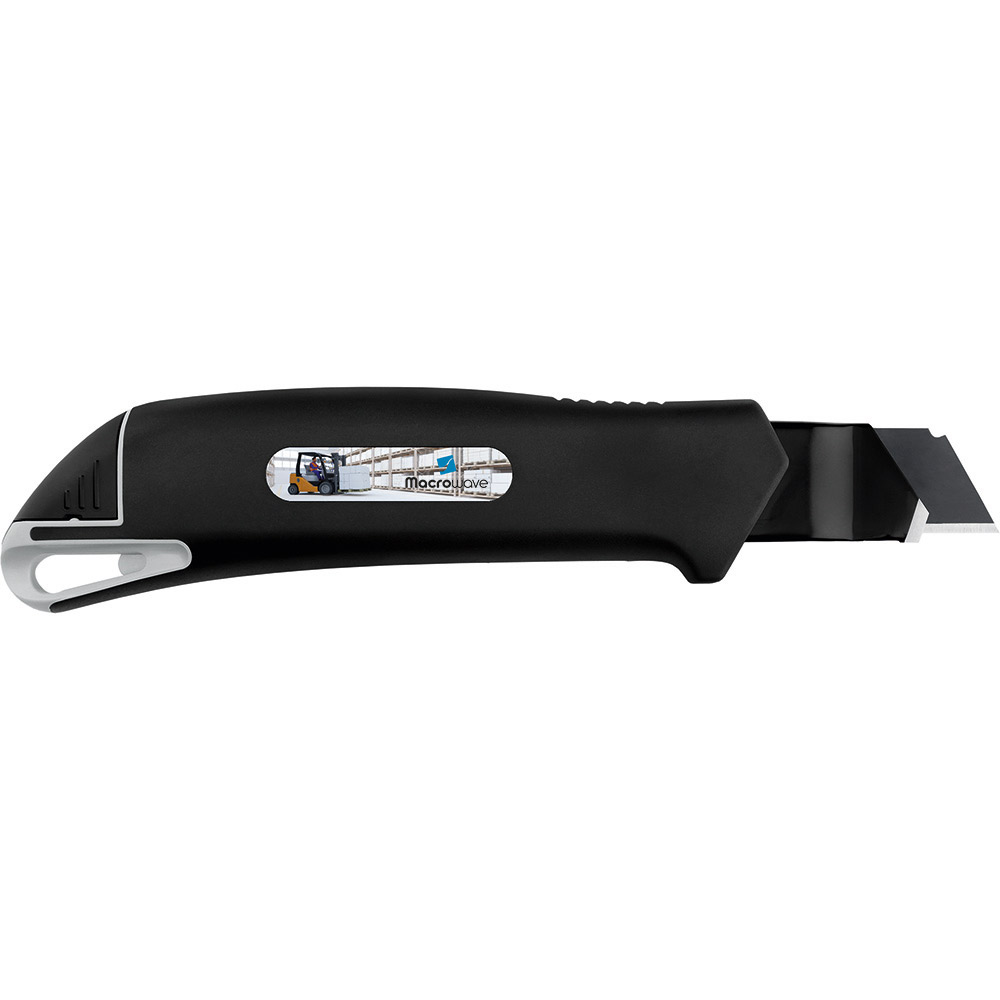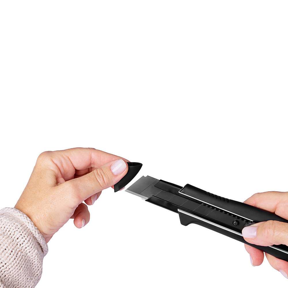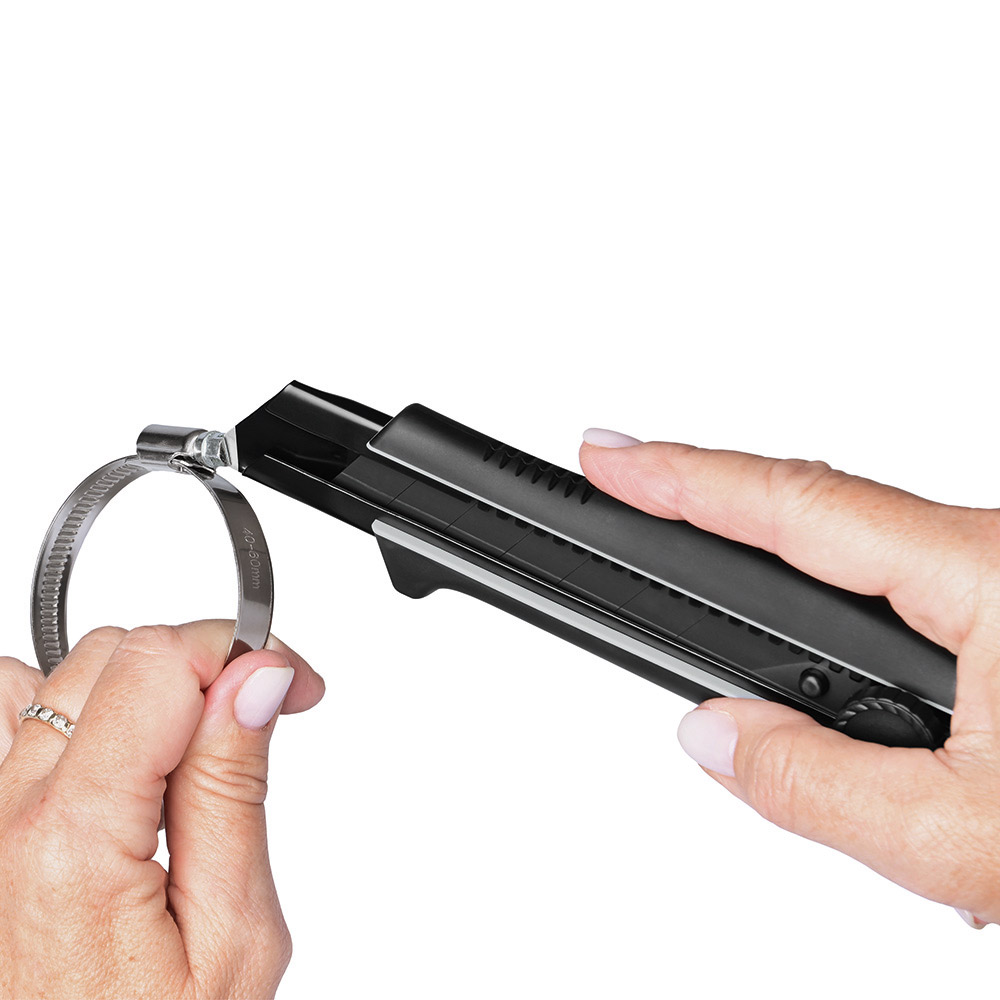 Qualitäts-Cuttermesser mit 25 mm SK2 Hochleistungs-Abbrechklinge und Feststellrad. Das Feststellrad ermöglicht eine stufenlose Feststellung und Fixierung der Klinge. Geeignet für robuste Schneidarbeiten. Extrem hohe Schnitthaltigkeit durch den hohen Kohlenstoffgehalt der SK2 Stahlklinge. Die schwarze Klinge steht für besondere Schärfe und Langlebigkeit. Ein spezieller Schliff erhöht die Anfangsschärfe. Die Spitze der Klingenführungsschiene ist gehärtet, sodass diese auch als Farbdosenöffner, Notschraubendreher, oder als Schnellschneider für Paketklebeband, usw. verwendet werden kann, ohne die Klinge ausfahren zu müssen. Material: schlagfestes 2-Komponenten-Gehäuse aus TPR und ABS, Klingenführungsschiene aus schwarz beschichtetem Edelstahl 430, Feststellrad aus ABS. Klinge: 25 mm Abbrechklinge aus SK2 Carbonstahl, Stärke 0,7 mm, Rockwell 62~65 HRC (gehobene Qualitätsstufe), max. Klingenausschub 68 mm, 2-seitiger Klingenschliff, 6 Abbrechsegmente für 7-fache Nutzung. Funktionen: Rücklaufsperre in der Klingenführungsschiene, Endkappe zum Abbrechen der Segmente, Öse zum Anbringen eines Lanyards oder Fangriemen. Verpackung: schwarze Geschenkverpackung.