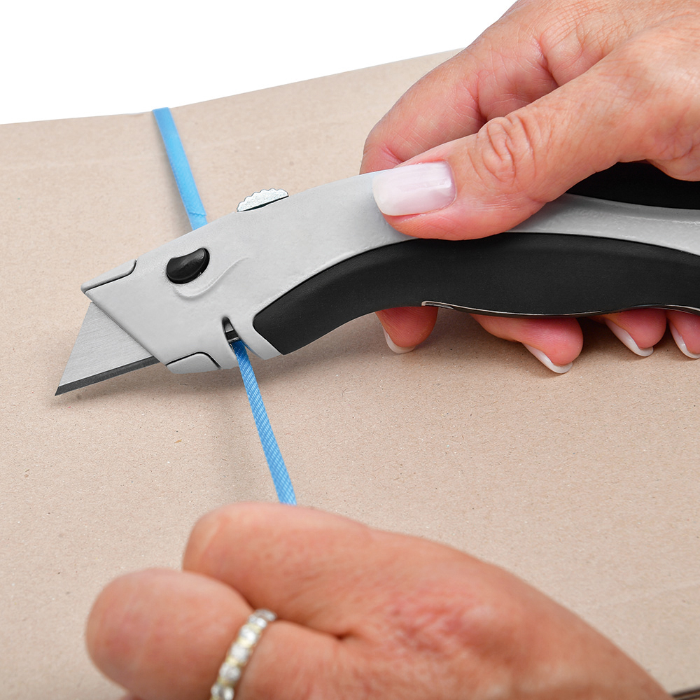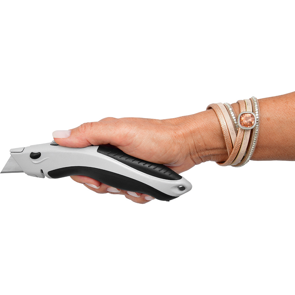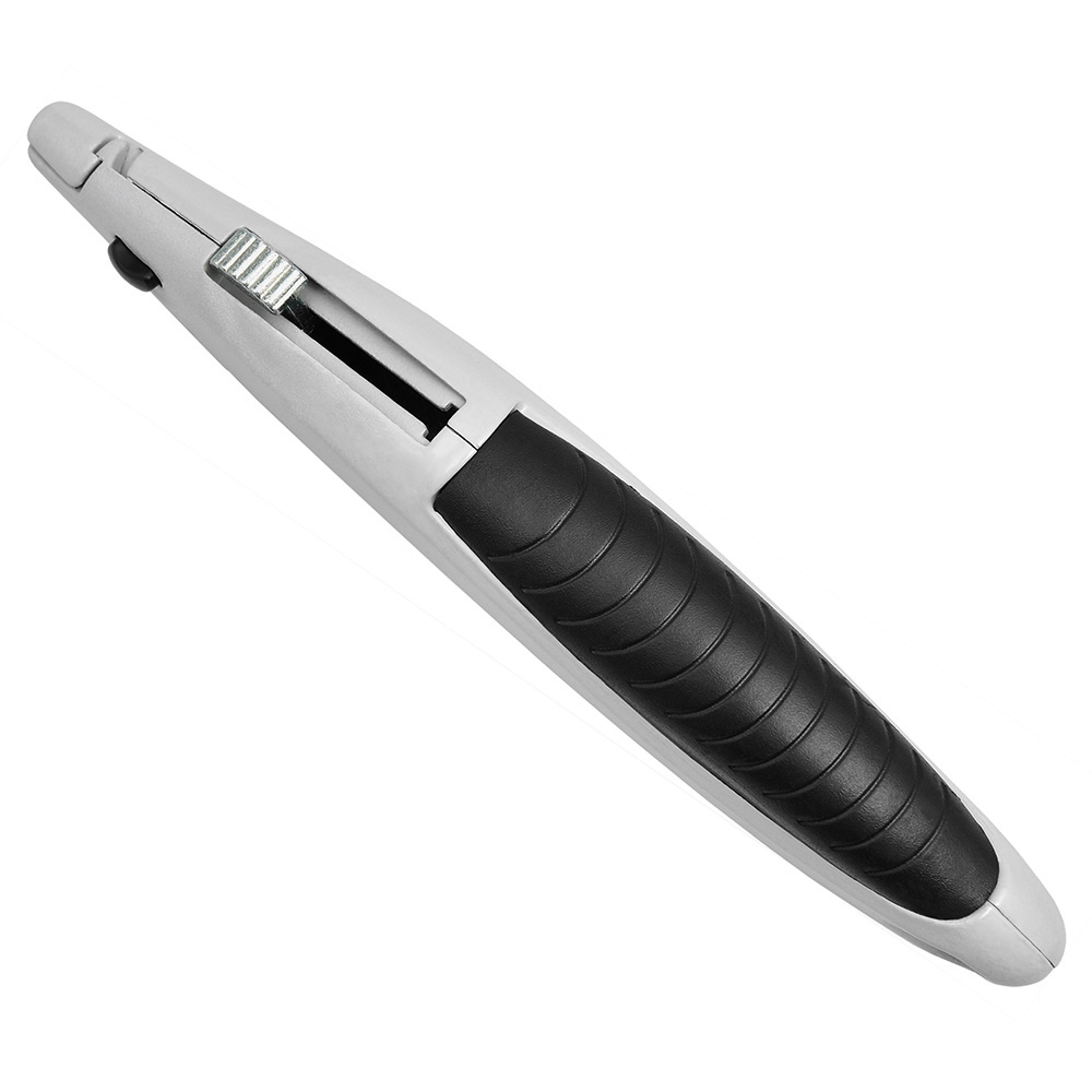 Cuttermesser mit 3-stufiger Klingenfeststellmechanik. Diese ermöglicht das Einstellen von drei Schnitttiefen und verhindert, dass die Klinge unbeabsichtigt ausgefahren werden kann. Für Rechts- und Linkshänder geeignet. Gehäuse: Zinklegierung mit einem gummierten TPR Griff und Ersatzklingenfach aus ABS. Klinge: Trapezklinge aus SK5 Carbonstahl, Rockwell 58~62 HRC (mittlere Qualitätsstufe), max. Schnitttiefe 21 mm, 2-fach verwendbar durch 2-seitigen Schliff. Funktionen: Klingenwechsel ohne Hilfsmittel, 3-stufige Klingenfeststellmechanik, Paketbandschneider mit abgedeckter Klinge, Öse zum Anbringen eines Lanyards oder Fangriemen. Zubehör: 3 Ersatzklingen in einem Klingenfach im Gehäuse. Verpackung: schwarze Geschenkverpackung.