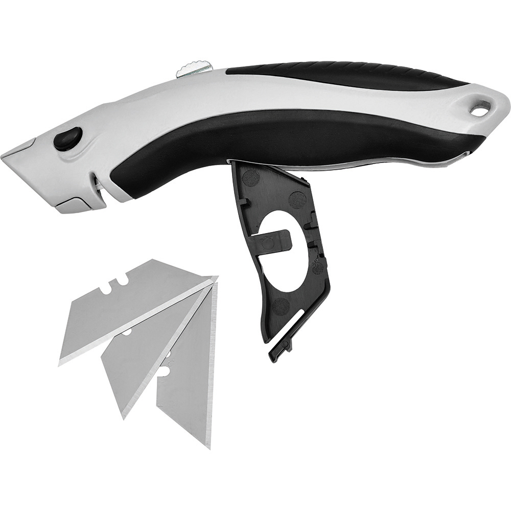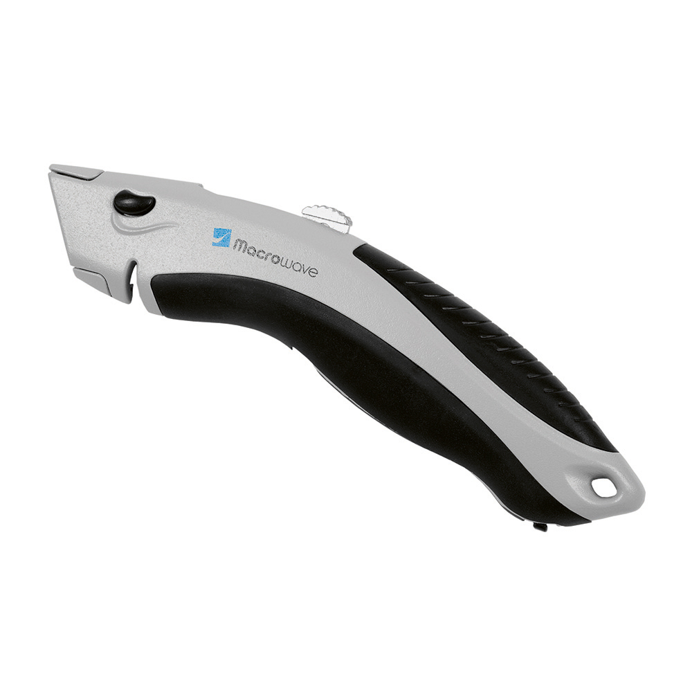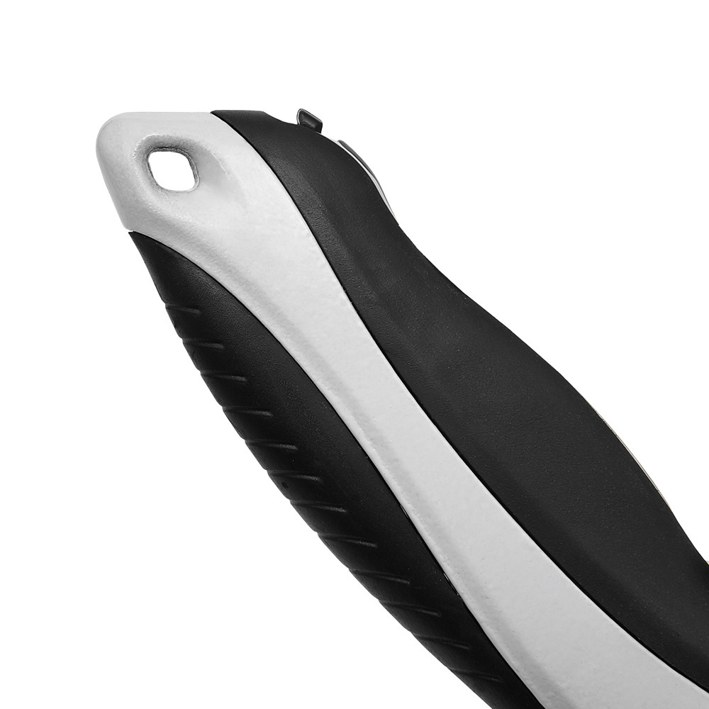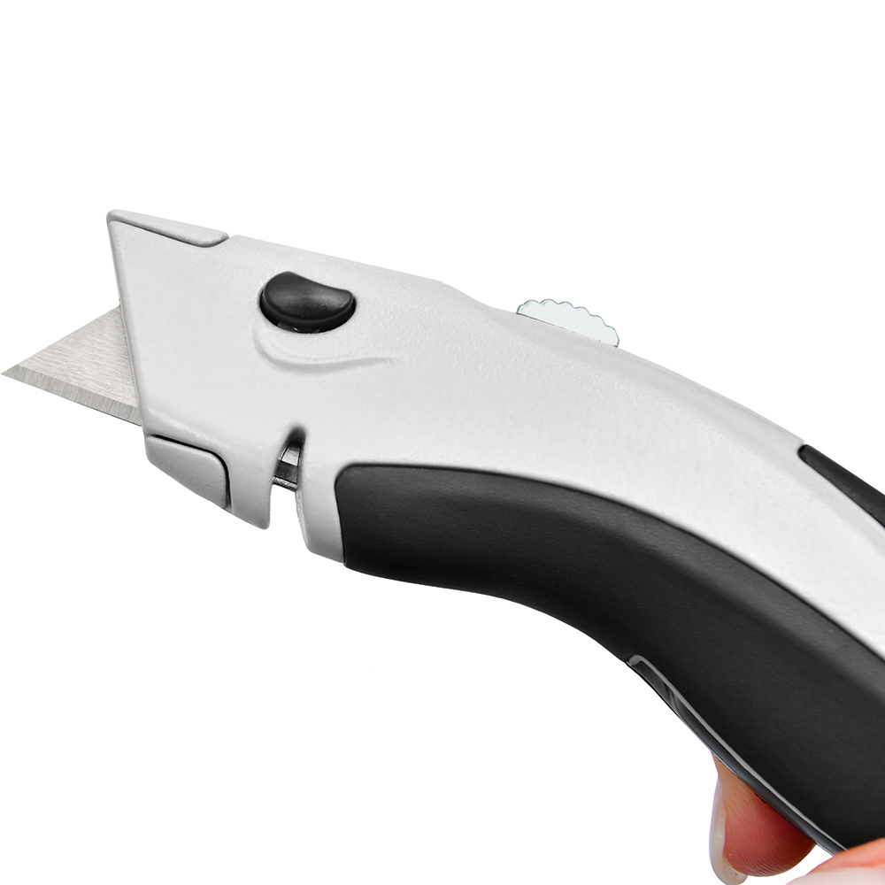 Cuttermesser mit 3-stufiger Klingenfeststellmechanik. Diese ermöglicht das Einstellen von drei Schnitttiefen und verhindert, dass die Klinge unbeabsichtigt ausgefahren werden kann. Für Rechts- und Linkshänder geeignet. Gehäuse: Zinklegierung mit einem gummierten TPR Griff und Ersatzklingenfach aus ABS. Klinge: Trapezklinge aus SK5 Carbonstahl, Rockwell 58~62 HRC (mittlere Qualitätsstufe), max. Schnitttiefe 21 mm, 2-fach verwendbar durch 2-seitigen Schliff. Funktionen: Klingenwechsel ohne Hilfsmittel, 3-stufige Klingenfeststellmechanik, Paketbandschneider mit abgedeckter Klinge, Öse zum Anbringen eines Lanyards oder Fangriemen. Zubehör: 3 Ersatzklingen in einem Klingenfach im Gehäuse. Verpackung: schwarze Geschenkverpackung.