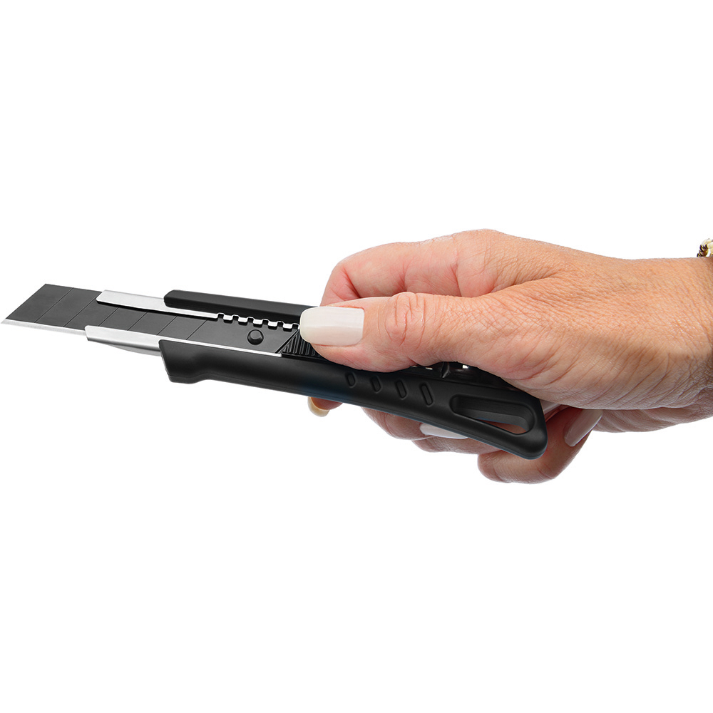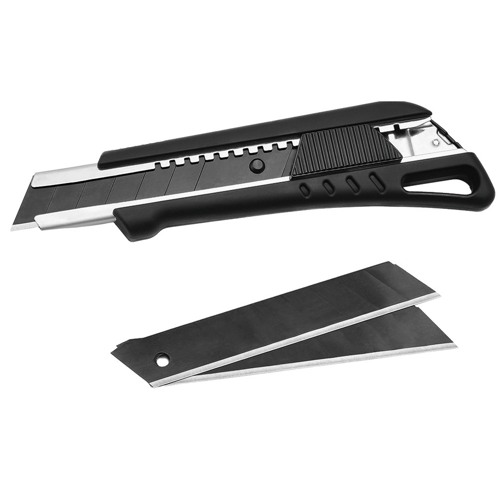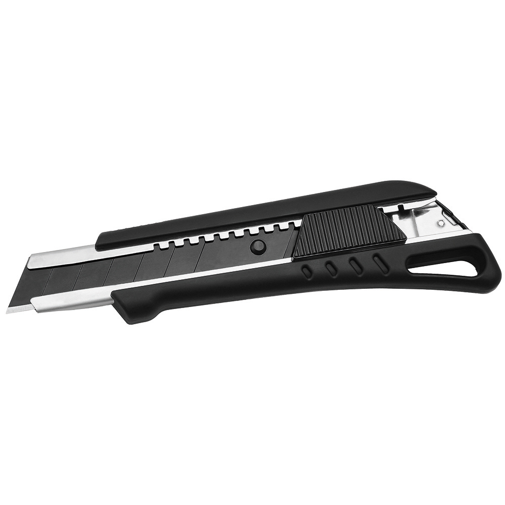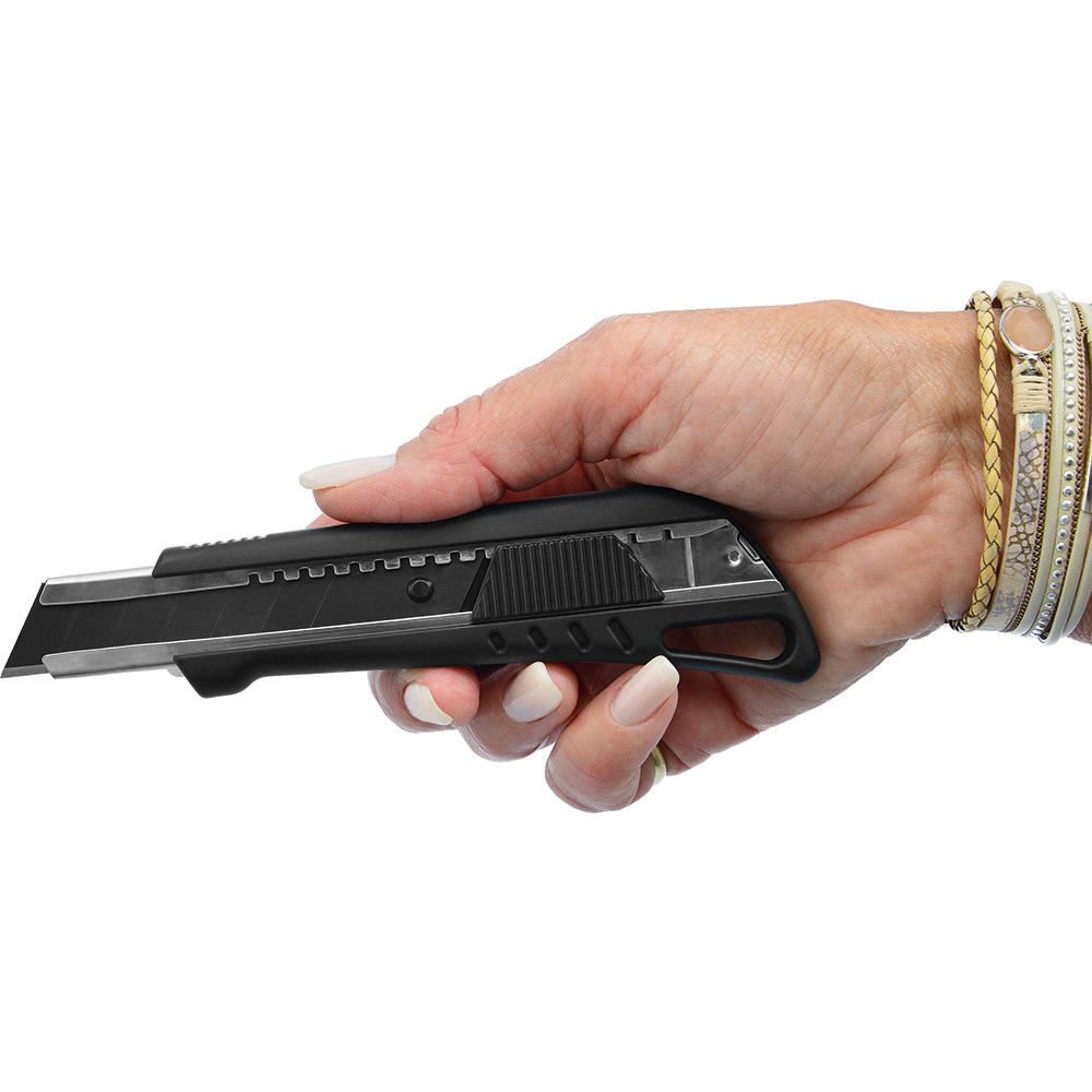 Cuttermesser mit 18 mm SK2 Hochleistungs-Abbrechklinge. Extrem hohe Schnitthaltigkeit durch den hohen Kohlenstoffgehalt der SK2 Stahlklinge. In der Metallführungsschiene mit Schieberaster kann die Klinge in der gewünschten Länge arretiert werden. Rücklaufsperre in der Führungsschiene, die verhindert, dass die Klinge beim Zurückfahren einfach aus dem Gehäuse springt. Die Klinge wurde brüniert, was die Klinge durch eine chemische Reaktion schwarz werden lässt. Dieses Verfahren dient zum Korrosionsschutz. Material: schlagfestes Gehäuse aus ABS, gummierte Oberfläche matt, Klingenführungsschiene aus Edelstahl. Klinge: 18 mm Abbrechklinge aus SK2 Carbonstahl, Stärke 0,6 mm, Rockwell 62~65 HRC (gehobene Premium-Qualitätsstufe), Korrosionsschutz durch Brünieren, max. Klingenausschub 79 mm, 2-seitiger Klingenschliff, 7 Abbrechsegmente für 8-fache Nutzung. Funktionen: Klingenwechsel ohne Hilfsmittel, Rücklaufsperre in der Klingenführungsschiene, Öse zum Anbringen eines Lanyards oder Fangriemen. Zubehör: 2 Ersatzklingen im separaten Ersatzklingenfach im Gehäuse. Verpackung: schwarze Geschenkverpackung.