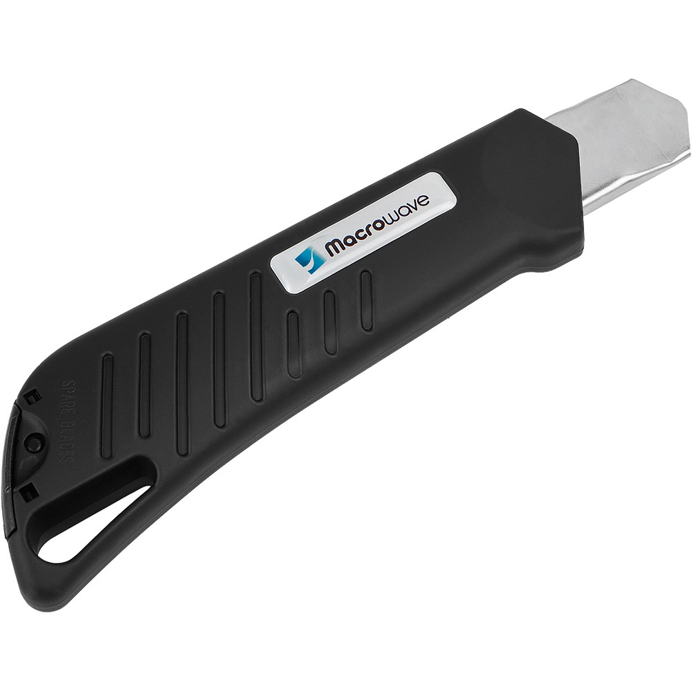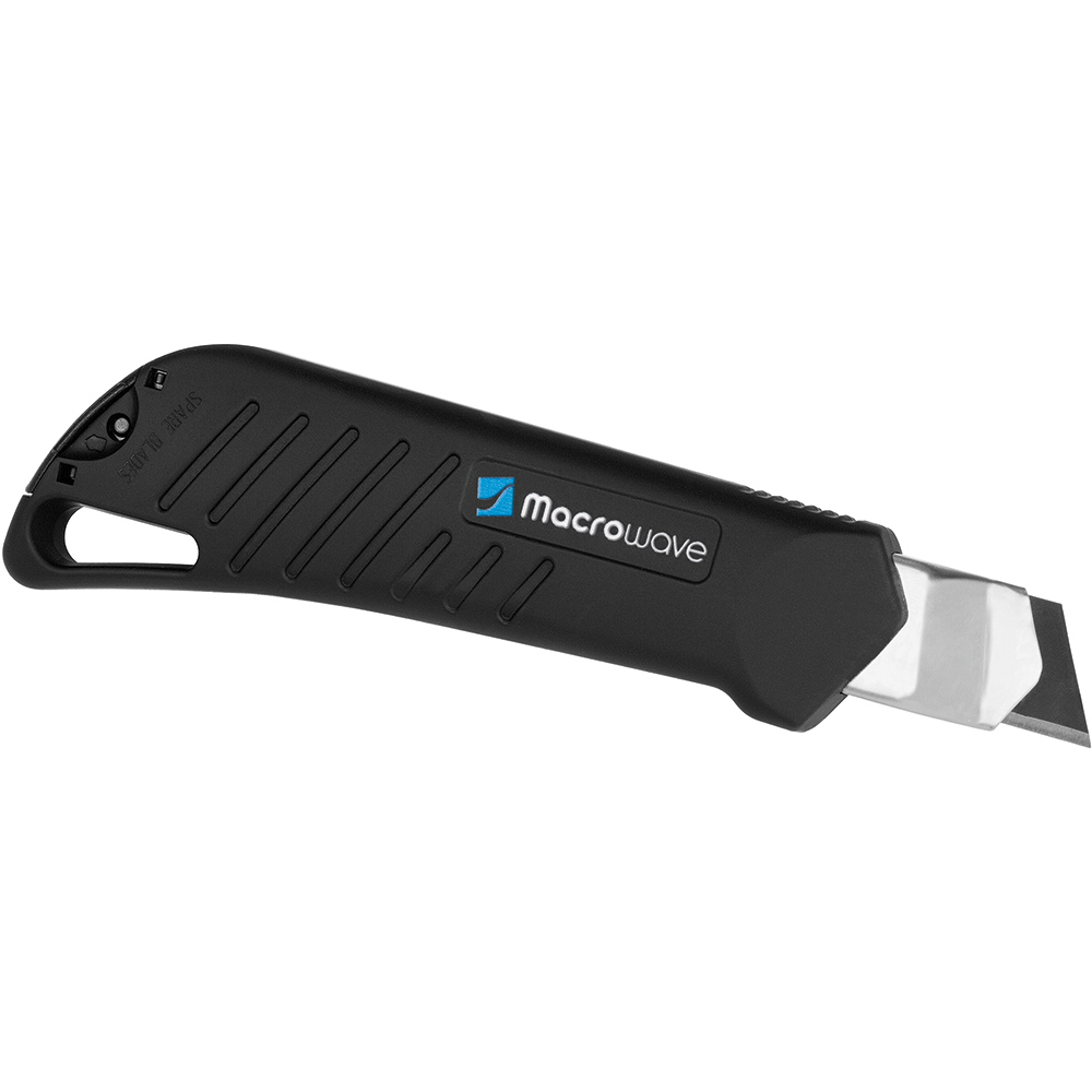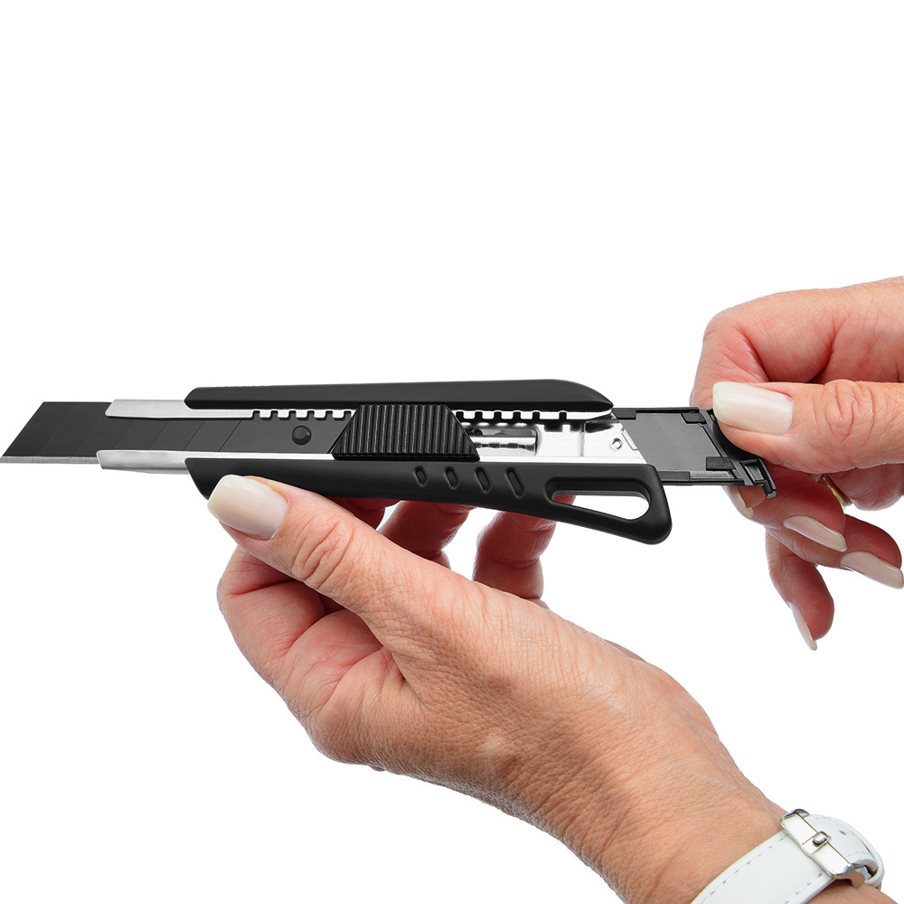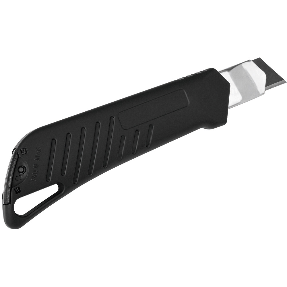 Cuttermesser mit 18 mm SK2 Hochleistungs-Abbrechklinge. Extrem hohe Schnitthaltigkeit durch den hohen Kohlenstoffgehalt der SK2 Stahlklinge. In der Metallführungsschiene mit Schieberaster kann die Klinge in der gewünschten Länge arretiert werden. Rücklaufsperre in der Führungsschiene, die verhindert, dass die Klinge beim Zurückfahren einfach aus dem Gehäuse springt. Die Klinge wurde brüniert, was die Klinge durch eine chemische Reaktion schwarz werden lässt. Dieses Verfahren dient zum Korrosionsschutz. Material: schlagfestes Gehäuse aus ABS, gummierte Oberfläche matt, Klingenführungsschiene aus Edelstahl. Klinge: 18 mm Abbrechklinge aus SK2 Carbonstahl, Stärke 0,6 mm, Rockwell 62~65 HRC (gehobene Premium-Qualitätsstufe), Korrosionsschutz durch Brünieren, max. Klingenausschub 79 mm, 2-seitiger Klingenschliff, 7 Abbrechsegmente für 8-fache Nutzung. Funktionen: Klingenwechsel ohne Hilfsmittel, Rücklaufsperre in der Klingenführungsschiene, Öse zum Anbringen eines Lanyards oder Fangriemen. Zubehör: 2 Ersatzklingen im separaten Ersatzklingenfach im Gehäuse. Verpackung: schwarze Geschenkverpackung.