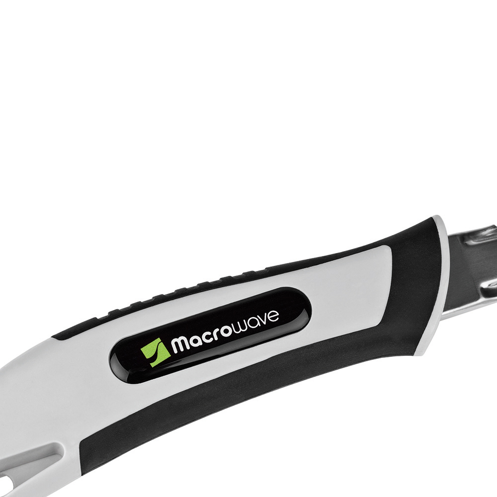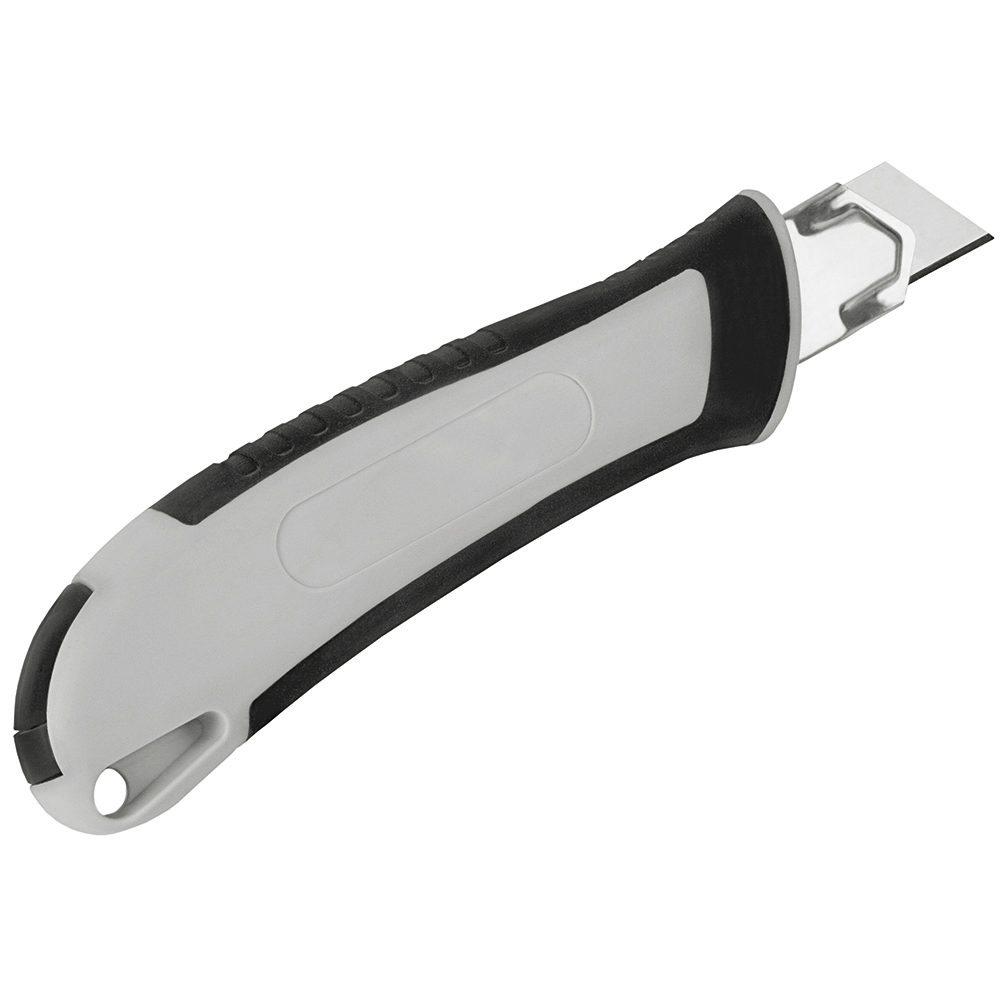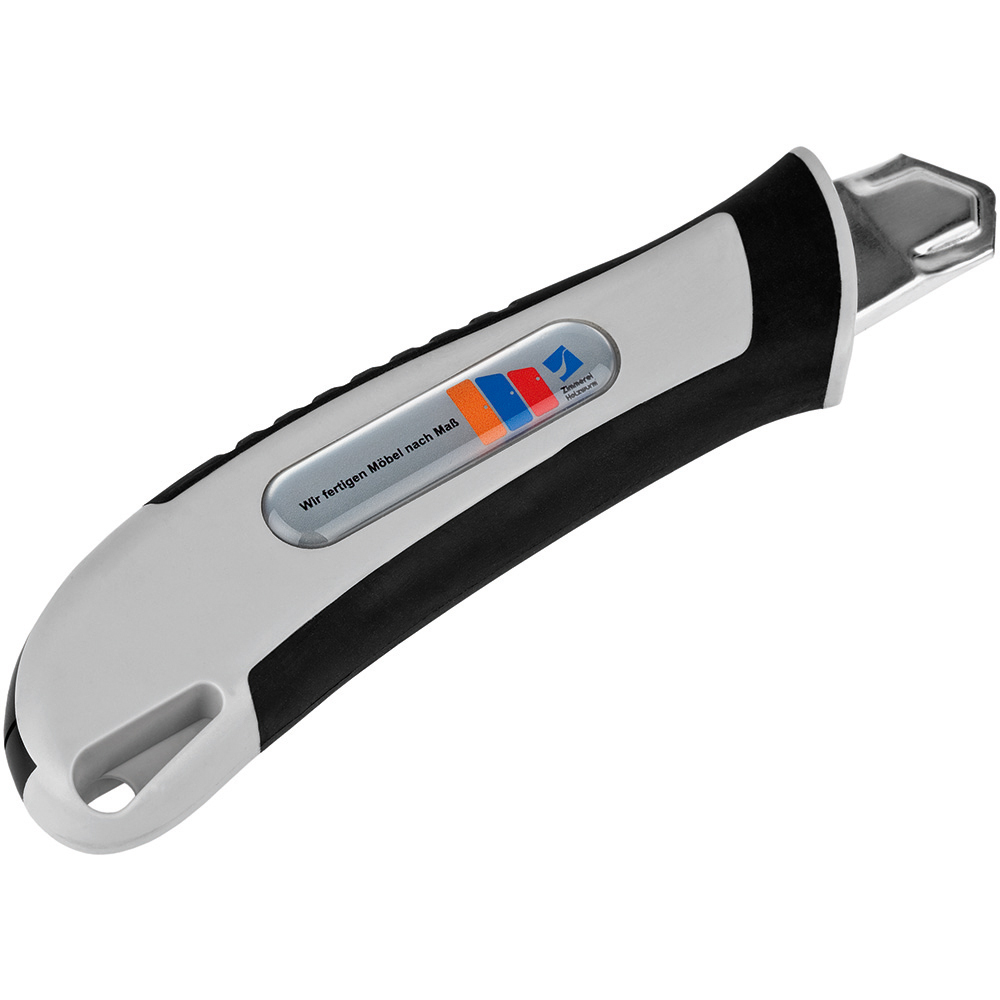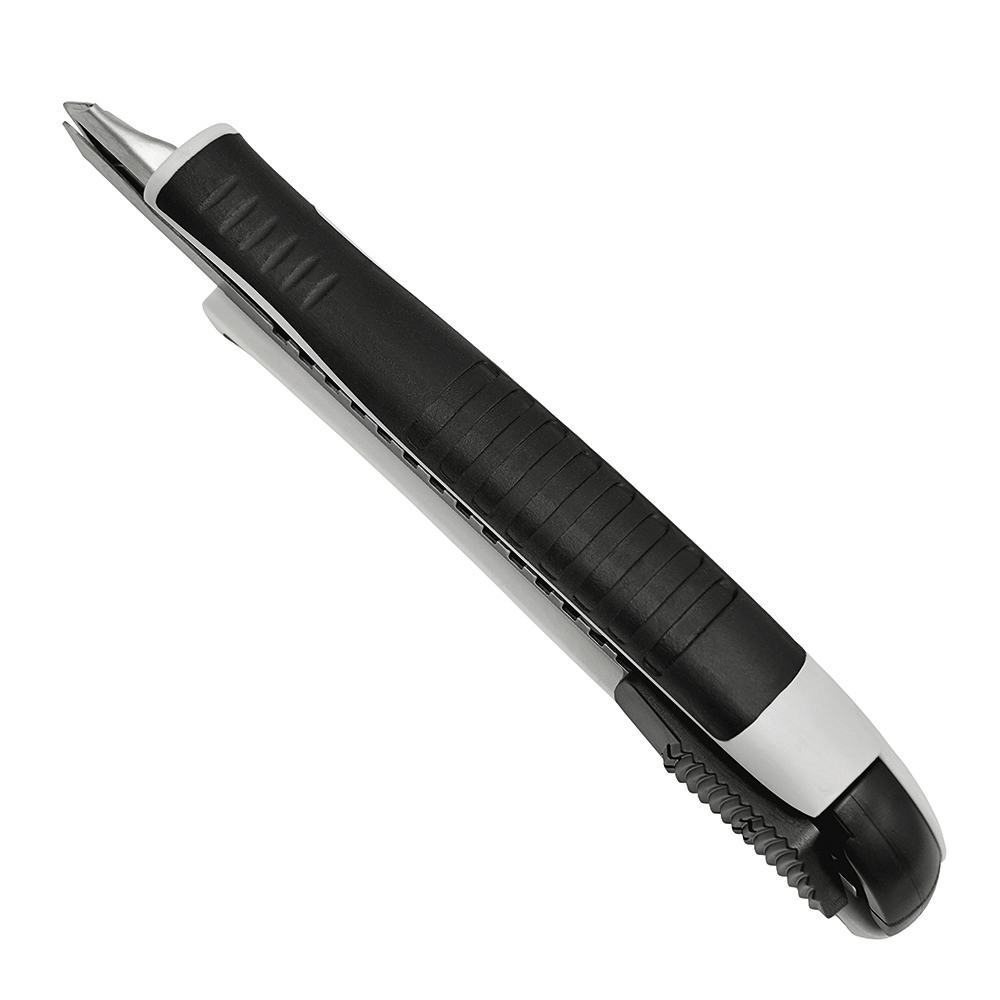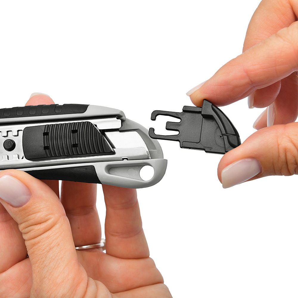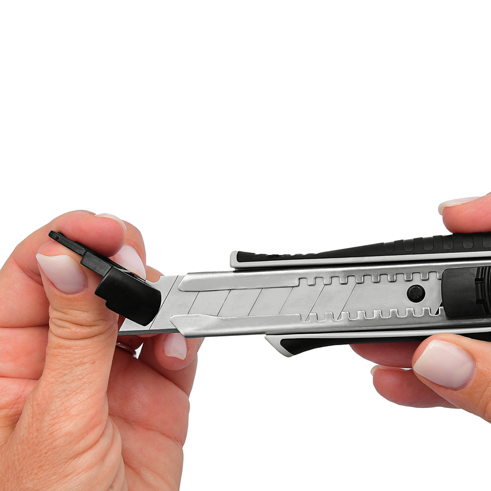 Cuttermesser mit 18 mm Abbrechklinge. In der Führungsschiene mit Schieberaster kann die Klinge in der gewünschten Länge arretiert werden. Die abnehmbare Endkappe kann zum Abbrechen der stumpfen Klingensegmente eingesetzt werden. Gehäuse: schlagfestes 2-Komponenten-Gehäuse aus ABS und TPR. Klinge: 18 mm Abbrechklinge aus SK5 Carbonstahl, Rockwell 58~62 HRC (mittlere Qualitätsstufe), max. Klingenausschub 84 mm, 2-seitiger Klingenschliff, 7 Abbrechsegmente für 8-fache Nutzung. Funktionen: Klingenwechsel ohne Hilfsmittel, Endkappe zum Abbrechen der Segmente, Öse zum Anbringen eines Lanyards oder Fangriemen. Verpackung: schwarze Geschenkverpackung.