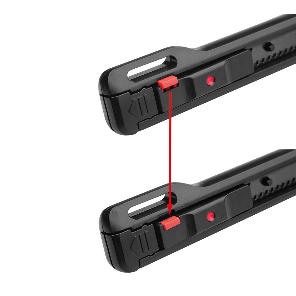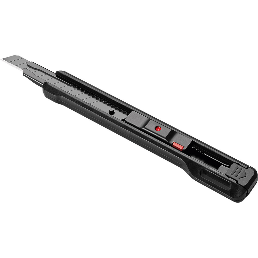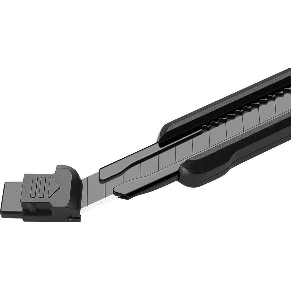 Elegantes Cuttermesser mit 9 mm SK2 Hochleistungs-Abbrechklinge. Formschönes Qualitäts-Cuttermesser mit mechanischem Verriegelungsschutz. Das professionelle Werkzeug für den Einsatz im Office, im künstlerischen Bereich, im Architekturbereich oder im Modellbau. Geeignet zum Schneiden von Karton, Pappe, Leichtstoffplatten, aber auch von Leder, Filz, Velours usw. Extrem hohe Schnitthaltigkeit durch den hohen Kohlenstoffgehalt der SK2 Stahlklinge. Die schwarze Klinge steht für besondere Schärfe und Langlebigkeit. Ein spezieller Schliff erhöht die Anfangsschärfe. In der Metallführungsschiene mit Schieberaster kann die Klinge in der gewünschten Länge arretiert werden. Die Rücklaufsperre in der Führungsschiene verhindert, dass die Klinge beim Zurückfahren aus dem Gehäuse springt. Um ein unbeabsichtigtes Ausfahren der SK2 Stahlklinge zu vermeiden, kann diese mit dem mechanischen Verriegelungsschutz gesichert werden. Material: schlagfestes Gehäuse aus ABS, matt beschichtet, Klingenführungsschiene aus schwarz beschichtetem Edelstahl 430, Schieber aus POM. Klinge: 9 mm Abbrechklinge aus SK2 Carbonstahl, Stärke 0,4 mm, Rockwell 62 ~ 65 HRC (gehobene Premium-Qualitätsstufe), Korrosionsschutz durch schwarze Beschichtung, max. Klingenausschub 68 mm, dreifach facettengeschärfte Schnittkante, 12 Abbrechsegmente für 13-fache Nutzung. Funktionen: Verriegelungsschutz Klingenausschub, Rücklaufsperre in der Klingenführungsschiene, Endkappe zum Abbrechen der Klingen-Segmente, Öse zum Anbringen eines Lanyards oder Fangriemen. Verpackung: schwarze Geschenkverpackung.
