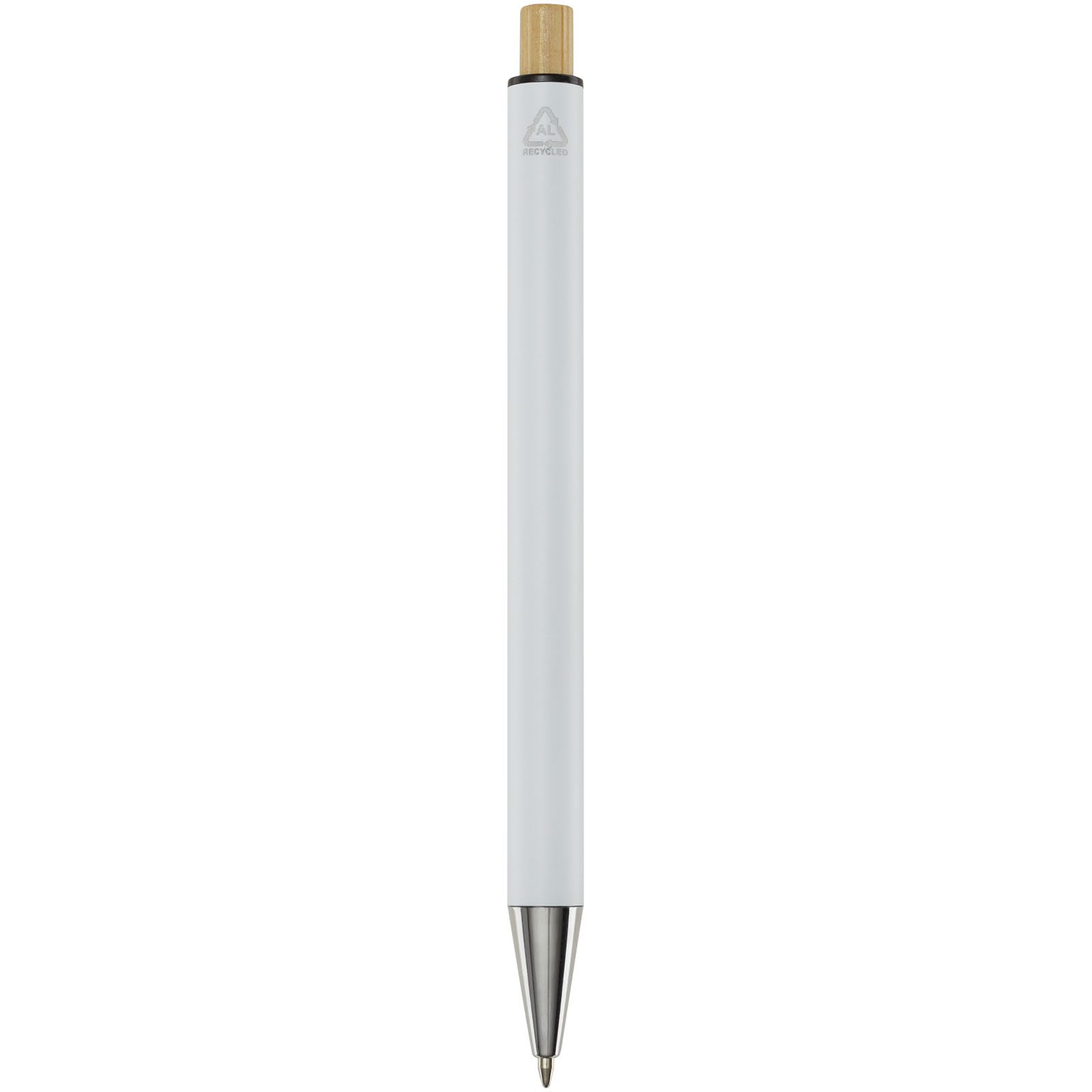 Der Cyrus Kugelschreiber ist aus recyceltem Aluminium hergestellt, was weniger Energie benötigt als die Herstellung von Aluminium aus Rohstoffen. Es reduziert außerdem die Abfallmenge auf Mülldeponien und trägt dazu bei, natürliche Ressourcen zu schonen und Treibhausgasemissionen zu reduzieren. Druckknopf ist aus Bambus gefertigt. Tintenfarbe: Schwarz. Schreiblänge: 800 Meter. Spitzengröße: 1,00 mm.