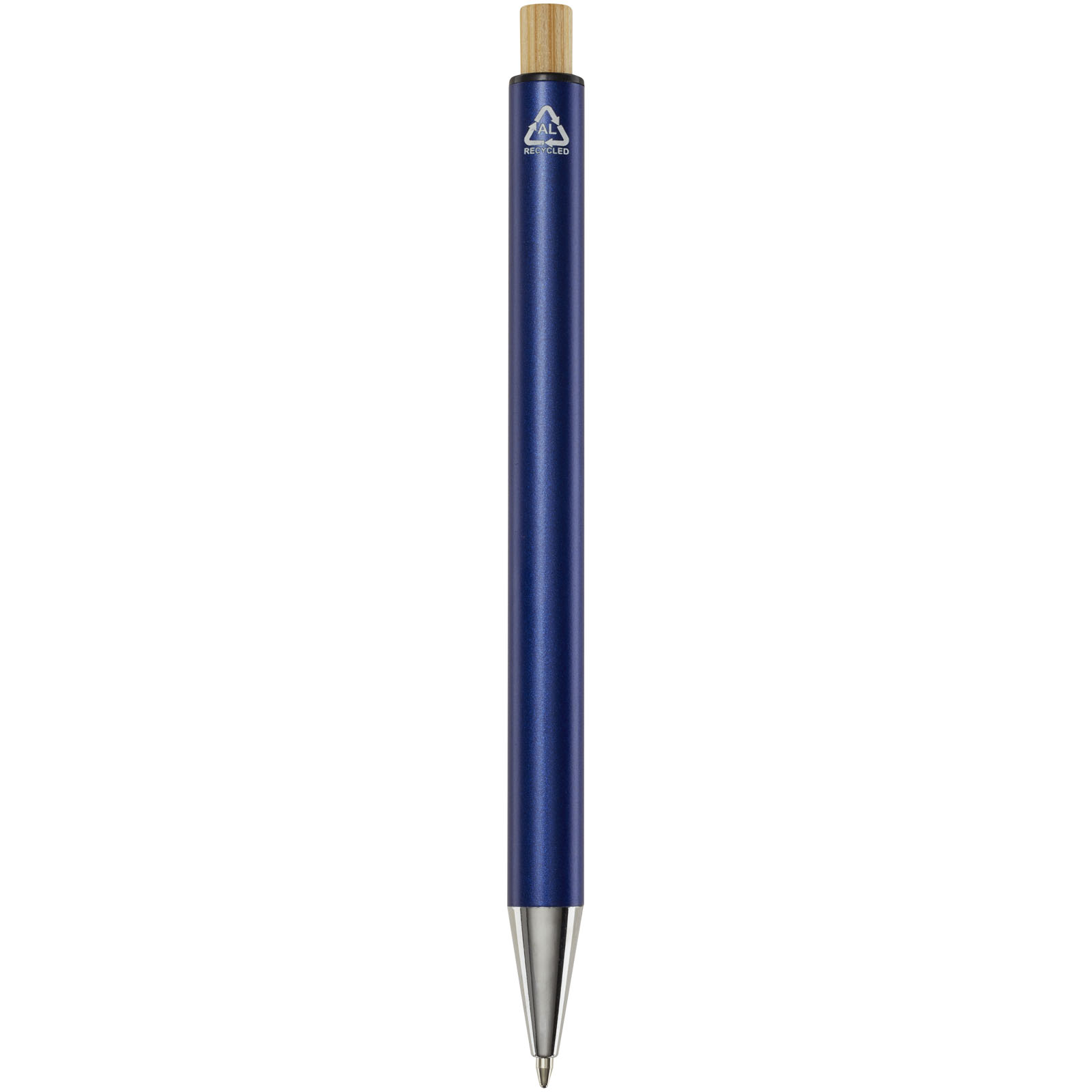 Der Cyrus Kugelschreiber ist aus recyceltem Aluminium hergestellt, was weniger Energie benötigt als die Herstellung von Aluminium aus Rohstoffen. Es reduziert außerdem die Abfallmenge auf Mülldeponien und trägt dazu bei, natürliche Ressourcen zu schonen und Treibhausgasemissionen zu reduzieren. Druckknopf ist aus Bambus gefertigt. Tintenfarbe: Schwarz. Schreiblänge: 800 Meter. Spitzengröße: 1,00 mm.