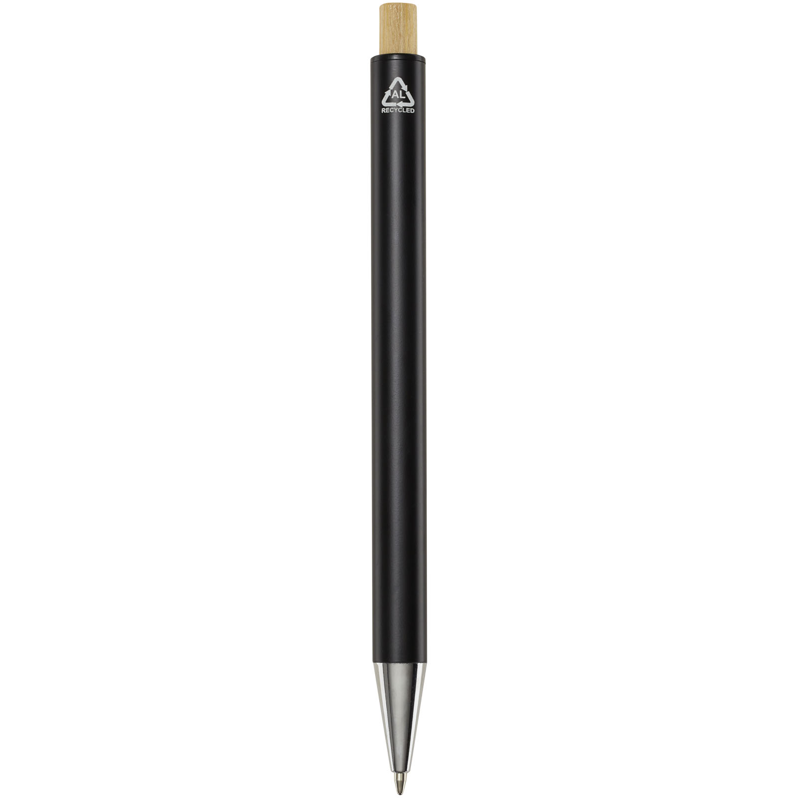 Der Cyrus Kugelschreiber ist aus recyceltem Aluminium hergestellt, was weniger Energie benötigt als die Herstellung von Aluminium aus Rohstoffen. Es reduziert außerdem die Abfallmenge auf Mülldeponien und trägt dazu bei, natürliche Ressourcen zu schonen und Treibhausgasemissionen zu reduzieren. Druckknopf ist aus Bambus gefertigt. Tintenfarbe: Schwarz. Schreiblänge: 800 Meter. Spitzengröße: 1,00 mm.