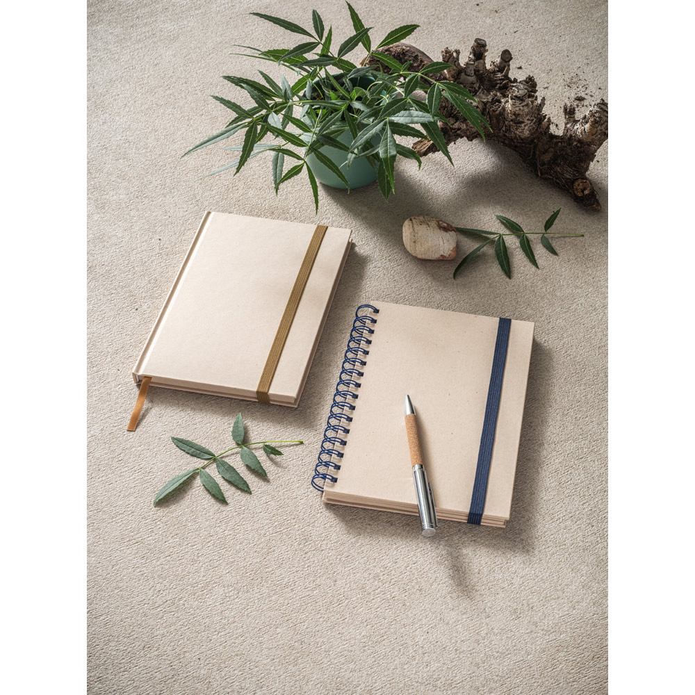 A5-Notizbuch mit festem Einband, hergestellt aus Zuckerrohrpapier (80 % zuckerrohr). Das Innere enthält 160 linierte Seiten aus Zuckerrohrpapier (80 % zuckerrohr) (90 g / m²), einen Trennstreifen und ein Gummiband zum Schließen des Notizbuchs. 147 x 216 mm