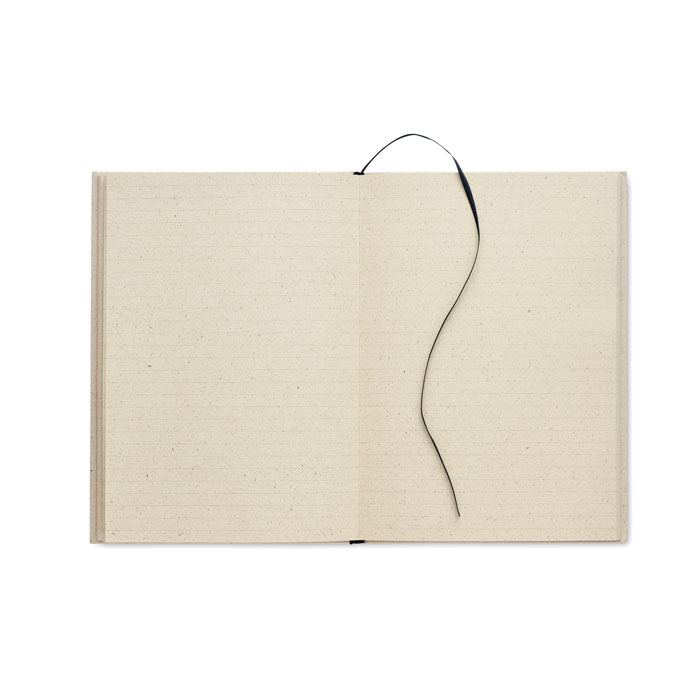 DIN A5 Notizbuch mit 80 Blatt liniertem Graspapier (40% Grasfasern) in einem Einband aus Karton. Mit elastischem Verschlussband und Lesebändchen. Ideal für alle Ihre Notizen bei Besprechungen im Büro oder in der Schule. Graspapier ist ein perfektes, bewusstes Werbemittel. Der Produktionsprozess ist von Anfang bis Ende nachhaltig und umweltfreundlicher als bei herkömmlichem aus Holz produziertem Papier. Hergestellt in der EU.