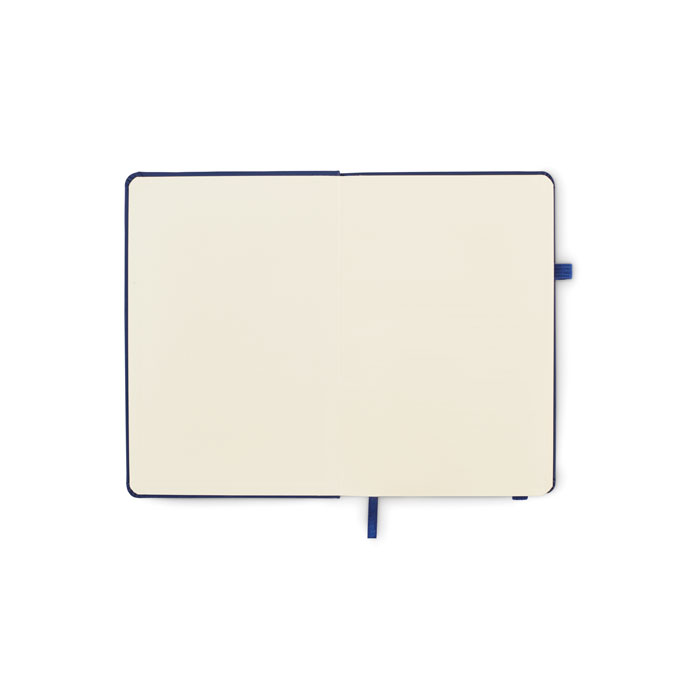 DIN A5 Notizbuch mit Hardcover aus 70% recyceltem Pre-Consumer-Leder und 30% PU-Latex. 96 Blatt (192 Seiten) liniertes Recyclingpapier. Mit farblich passendem elastischen Baumwoll Verschlussband und Stiftschlaufe.