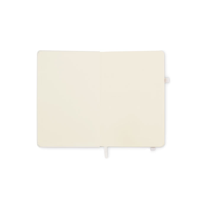 DIN A5 Notizbuch mit Hardcover aus 70% recyceltem Pre-Consumer-Leder und 30% PU-Latex. 96 Blatt (192 Seiten) liniertes Recyclingpapier. Mit farblich passendem elastischen Baumwoll Verschlussband und Stiftschlaufe.