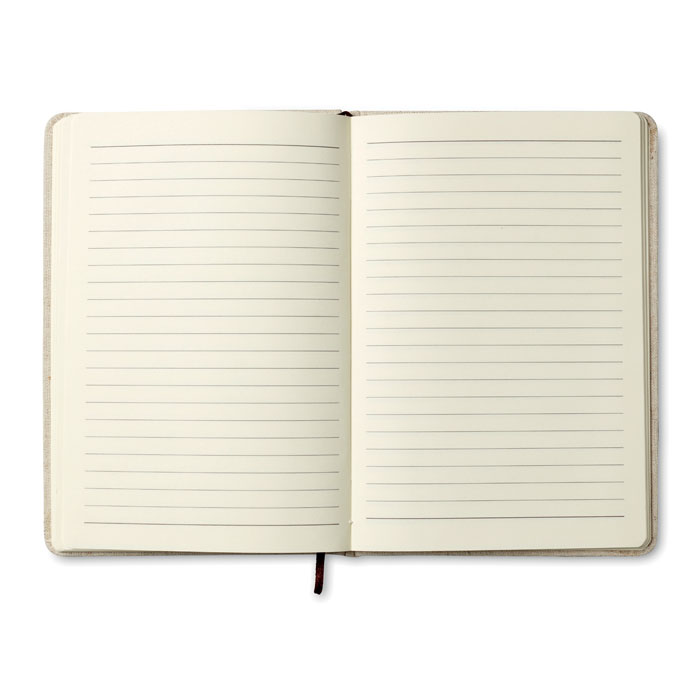 DIN A5 Notizbuch mit gebundenem Hard Cover mit Canvas. 96 Blatt (192 Seiten) liniertes Recyclingpapier. Elastisches Verschlussband und Lesebändchen.