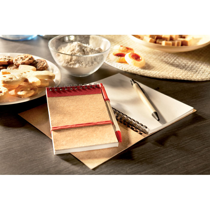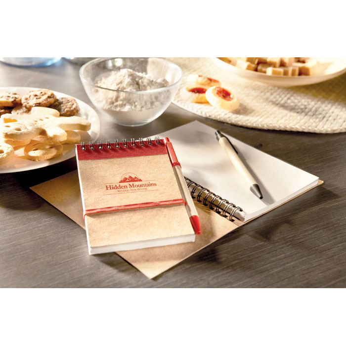 Notizbuch mit 70 Blatt (140 Seiten) recyceltem Blankopapier. Spiralbindung. Stiftschlaufe. Druckkugelschreiber aus recyceltem Karton mit Clip, Spitze und Drücker aus natürlich abbaubarem Kunststoff. Blaue Tinte. FSC®-certified | FSC MIX, P7.1, FSC-C213206