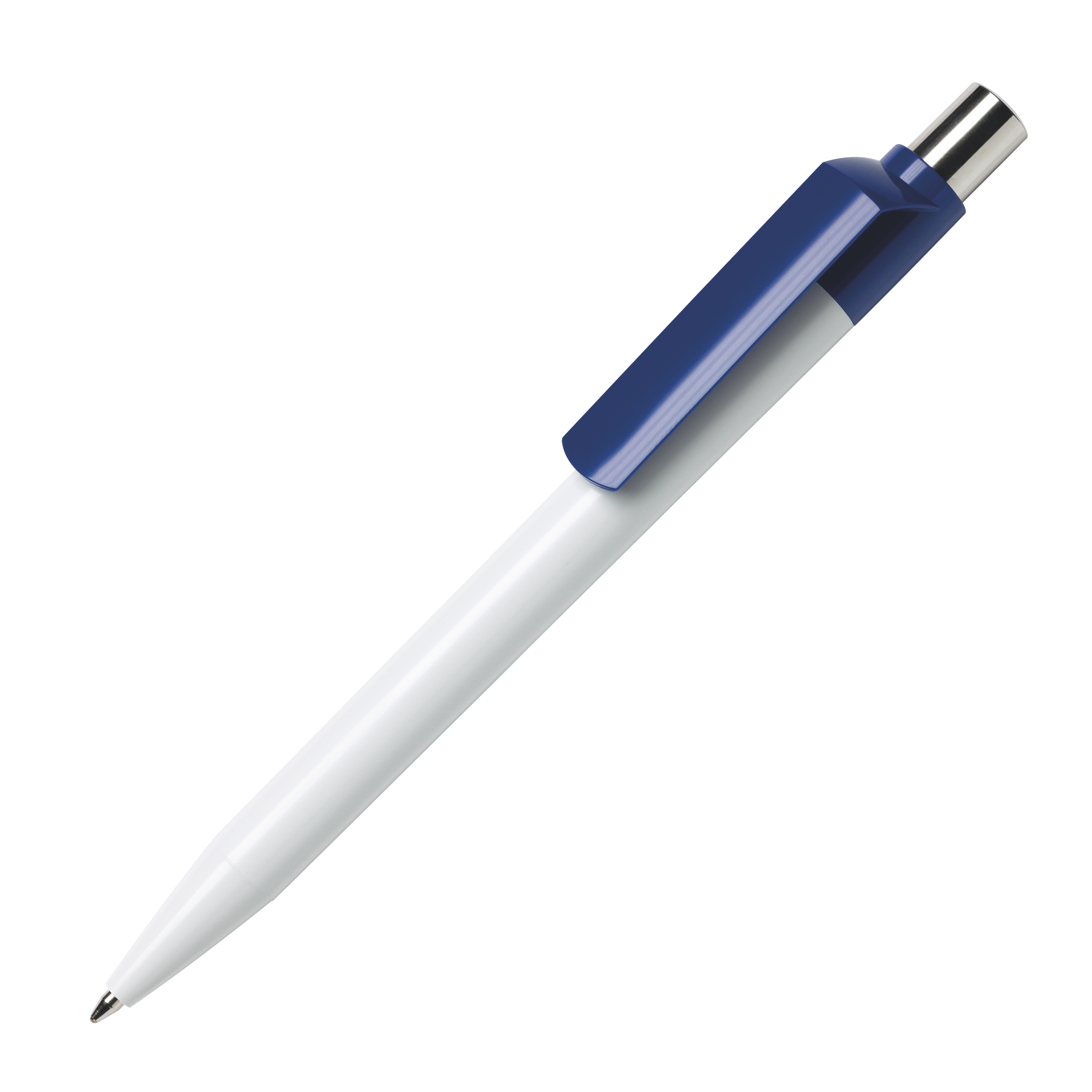 DOT D1 BC CR Kugelschreiber Maxema, Nüchtern und minimalistisch im Design - aber versehen mit einer ganz persönlichen Maxema-Note, dem kleinen Pünktchen im Drücker, wird dieses oft vernachlässigte Detail zu einem echten Stilelement. Das Gehäuse des Kugelschreibers ist aus hochglänzendem, solidem, weißem ABS gefertigt, der Drücker aus hochglänzendem Metall. Drücker-Element und Clip sind in 20 Farben lieferbar, die bereits ab 2.000 Stück untereinander kombinierbar sind. Er ist mit einer blauschreibenden Großraummine ausgestattet.