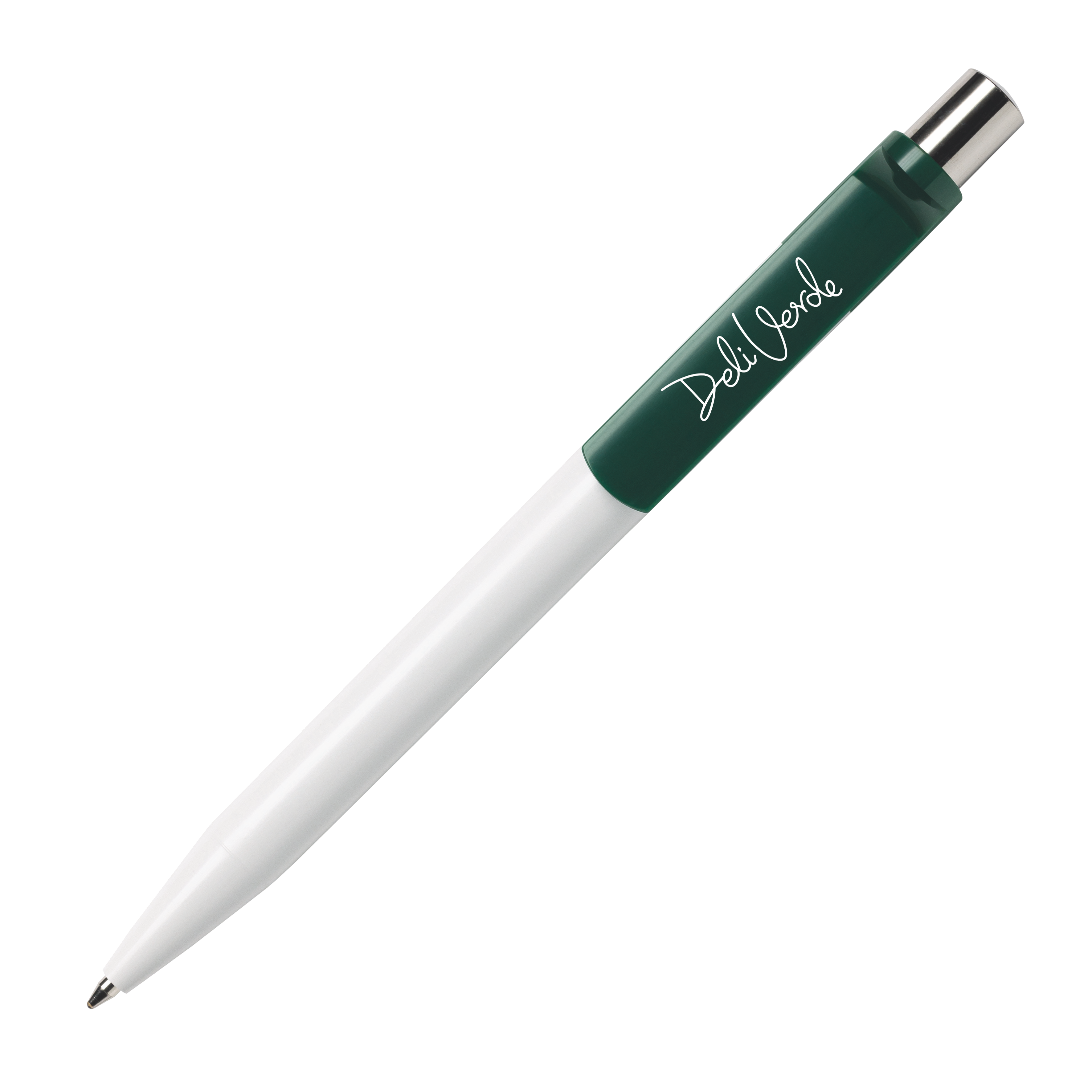 DOT D1 BC CR Kugelschreiber Maxema, Nüchtern und minimalistisch im Design - aber versehen mit einer ganz persönlichen Maxema-Note, dem kleinen Pünktchen im Drücker, wird dieses oft vernachlässigte Detail zu einem echten Stilelement. Das Gehäuse des Kugelschreibers ist aus hochglänzendem, solidem, weißem ABS gefertigt, der Drücker aus hochglänzendem Metall. Drücker-Element und Clip sind in 20 Farben lieferbar, die bereits ab 2.000 Stück untereinander kombinierbar sind. Er ist mit einer blauschreibenden Großraummine ausgestattet.