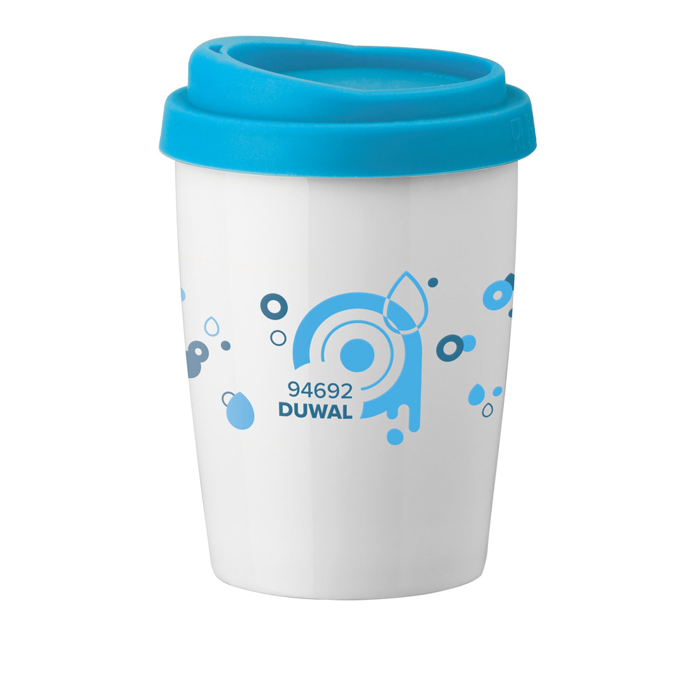 Reisebecher aus Porzellan, doppelwandig, luftisoliert und mit Silikondeckel (220 mL). Geliefert in einer Schachtel. ø86 x 122 mm