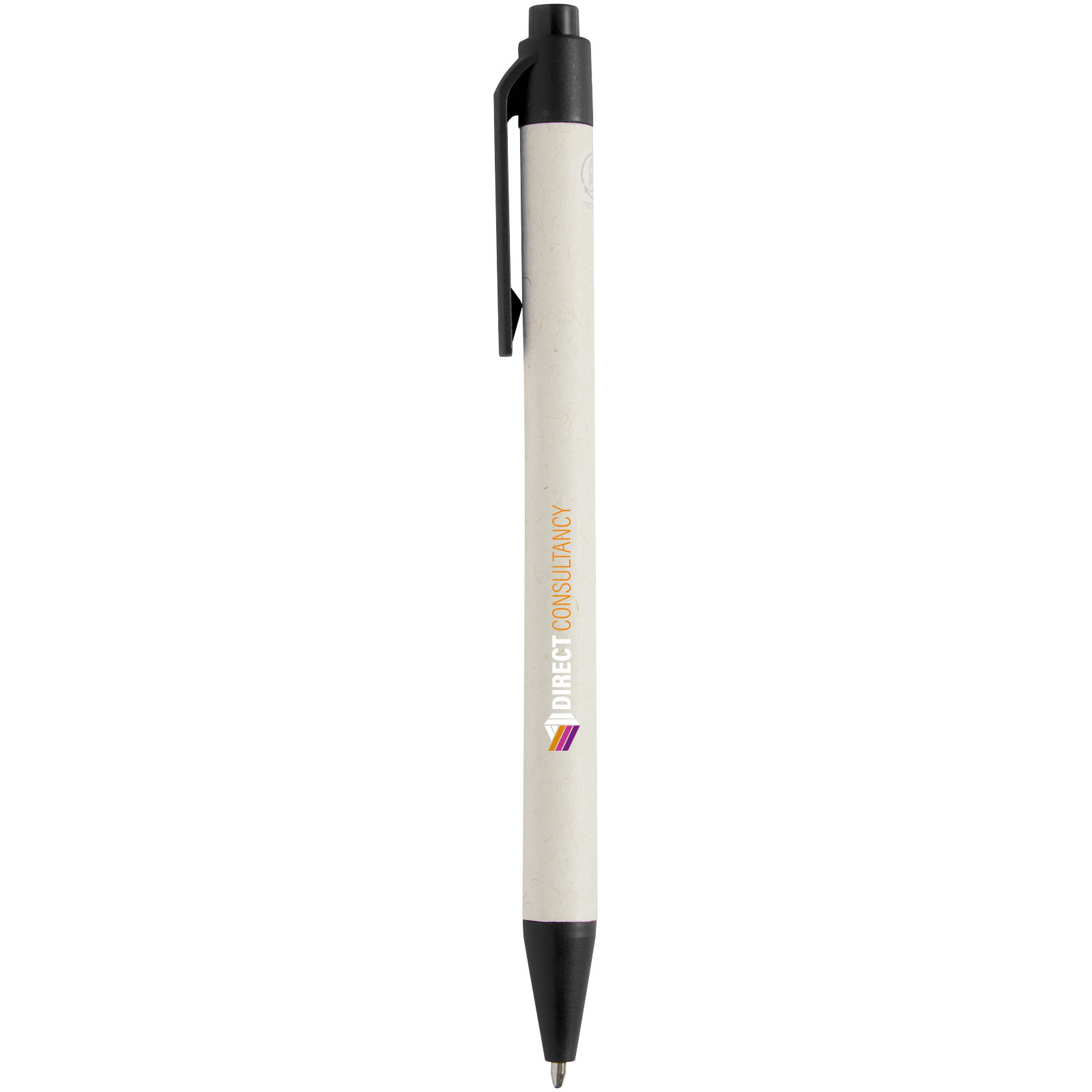 Kugelschreiber mit Druckmechanik und einem Schaft aus recycelten Milchtüten (bis zu 70 %). Der Druckknopf, der Clip und die Spitze sind aus PLA-Kunststoff gefertigt. Gebrauchte Milchtüten werden gesammelt, sortiert, verarbeitet und in Papier umgewandelt, sodass aus Abfall wirklich etwas Nützliches wird.