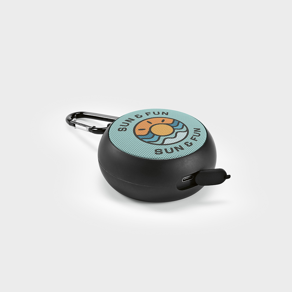 Darwin ist ein 5 W Lautsprecher aus recyceltem ABS, ausgestattet mit einem 3,7 V 1000 mAh Akku für 1,5 Stunden Spielzeit. Die Ladezeit beträgt ca. 2 Stunden über den USB-C-Anschluss. Dank dem Bluetooth V5.3 stellt er eine perfekte Verbindung her. Mit praktischem Karabiner zum Aufhängen oder Mitnehmen. Das Metallgitter ermöglicht vollfarbige Personalisierung. Bietet IPX5-Wasserschutz. Wird einzeln in einer Kraftkartonbox geliefert.