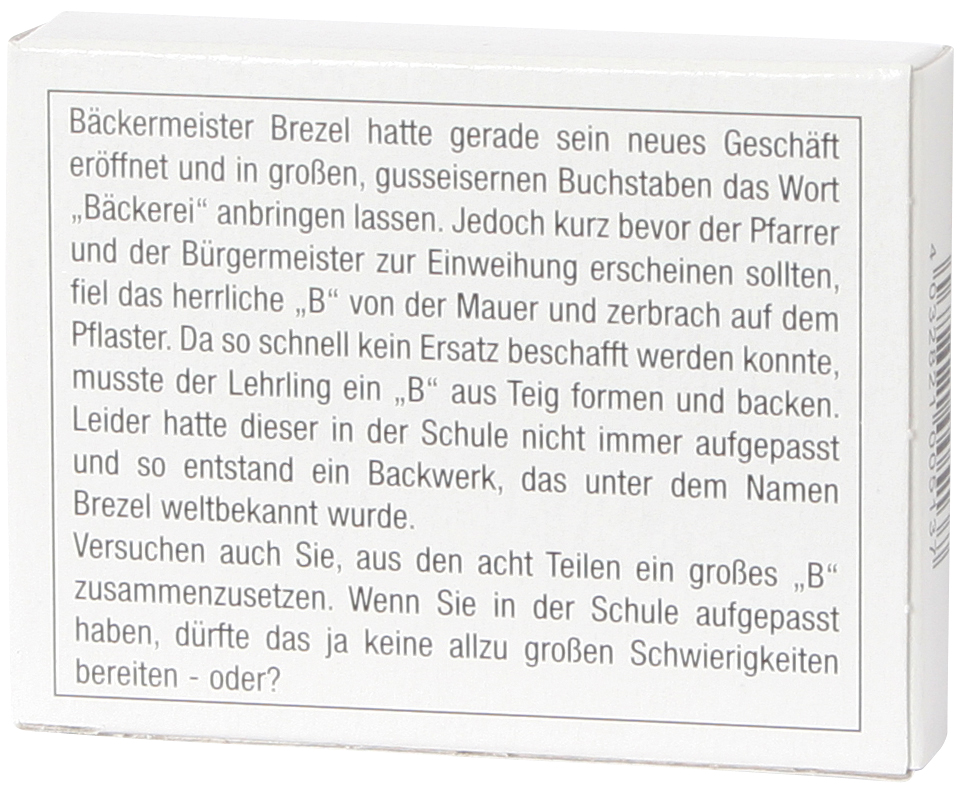 Bäckermeister Brezels Lehrling sollte ein B backen. Da er aber in der Schule nicht aufpasste, wurde daraus die heute so beliebte Breze. Können Sie aus acht Teilen ein B puzzeln?