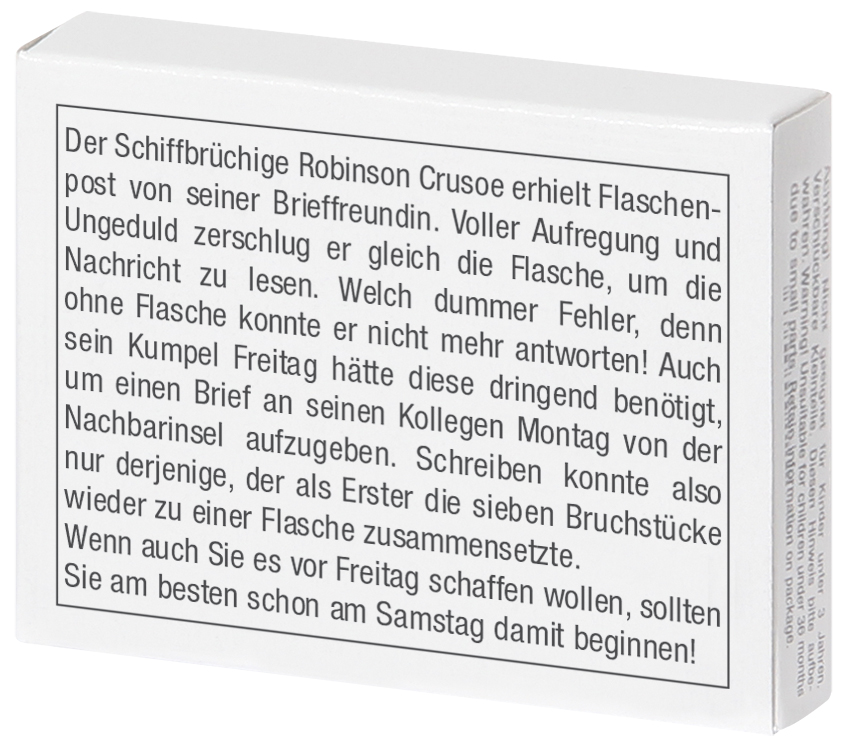 Zwei Schiffbrüchige wollen ihre Post verschicken. Sie haben aber nur eine kaputte Flasche. Wer es schafft, diese aus sieben Teilen zusammenzusetzen, darf seinen Brief versenden.