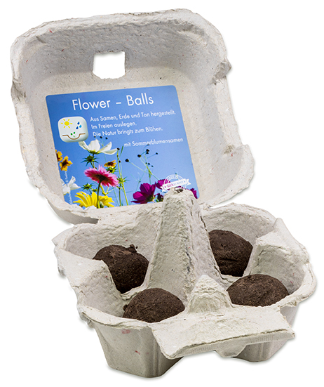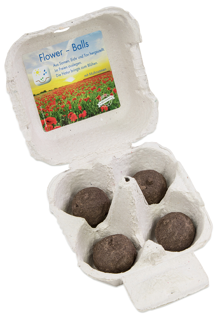 Mal nicht aus Schokolade sind die Ostereier im Eierkarton. Bei diesem grünen Werbeartikel erwarten den Kunden vier Flower-Balls, kleine Kugeln, bestehend aus Samen, Erde und Tonpulver. Diese werden beliebig und ohne Einpflanzen direkt auf dem Boden verteilt. Die Natur bringt sie dann zum Blühen. Zur Auswahl stehen die Flower-Balls entweder mit Mohn- oder mit Sommerblumensamen, über deren Blüten sich die Bienen, Schmetterlinge und andere Insekten freuen werden. Außen auf dem Original Eierkarton wird ein Werbeaufkleber mit viel Platz für die individuelle Werbebotschaft angebracht.