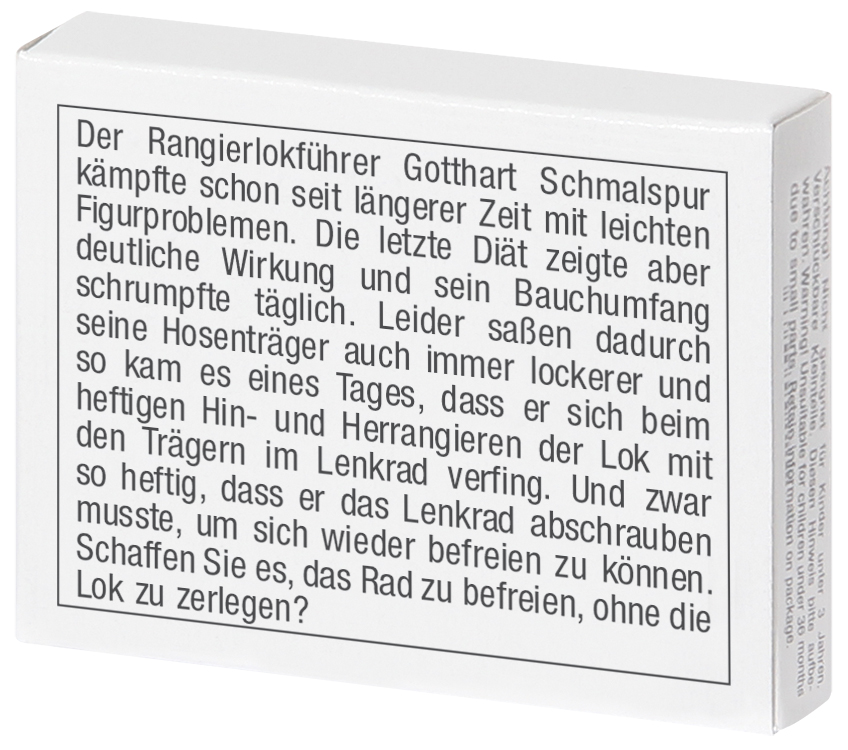Der Lokführer Gottthart Schmalspur hat sich mit seinen Hosenträgern im Lenkrad verfangen. Befreien Sie den Tollpatsch. Lösen Sie den Ring von der Lok!