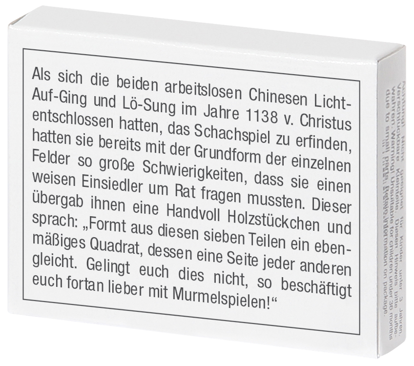 Die Chinesen Licht-Auf-Ging und L-Sung wollten das Schachspiel erfinden. Das misslang. So erfanden sie ein siebenteiliges Quadrat zum Zusammenbauen.