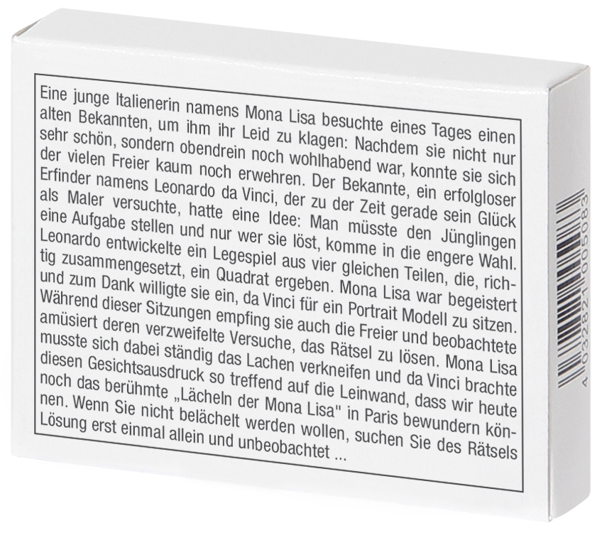 Leonardo da Vinci tüftelte für Mona Lisa eine Prüfung für ihre Freier aus: Wer es schafft, ein Quadrat aus vier Teilen zu bauen, kriegt die Schöne! Also, los! Auch in englischer Version erhältlich: Art.-Nr. 102525.