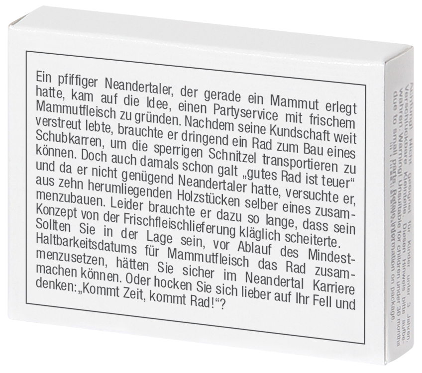 Ein Neandertaler gründete einen Partyservice. Um seine Mammutspezialitäten liefern zu können, brauchte er einen Wagen. Bauen Sie das Rad aus zehn Teilen dazu! Auch in englischer Version erhältlich: Art.-Nr. 102532.