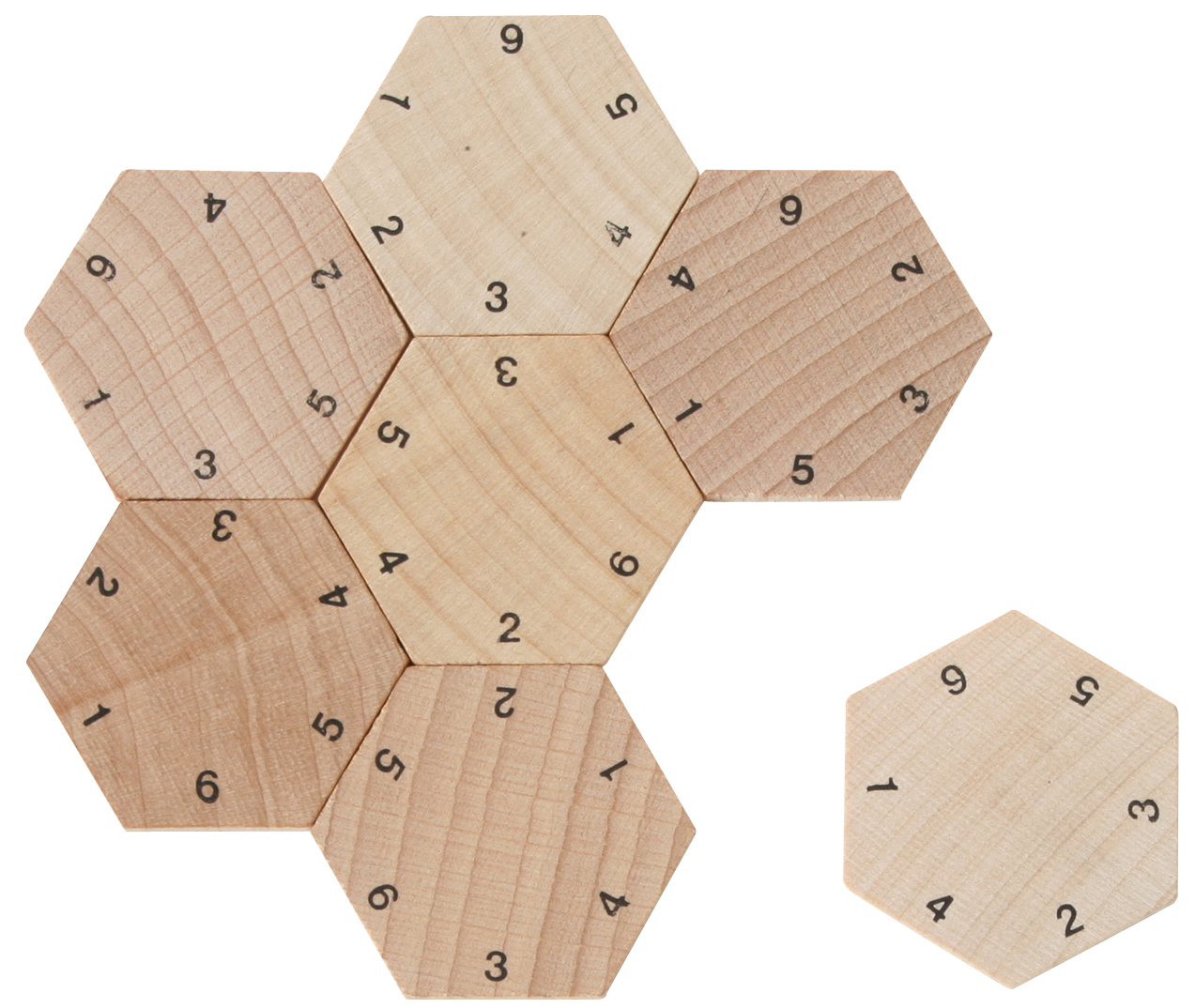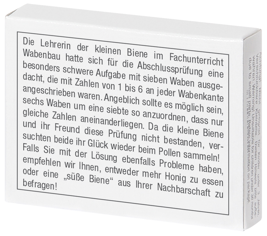 Die Prüfung einer Biene im Fach Wabenbau hatte es in sich! Sieben Waben waren so anzuordnen, dass alle aneinanderstoßenden Zahlen gleich sind. Gar nicht so einfach - probieren Sie selbst! Auch in englischer Version erhältlich: Art.-Nr. 102538.