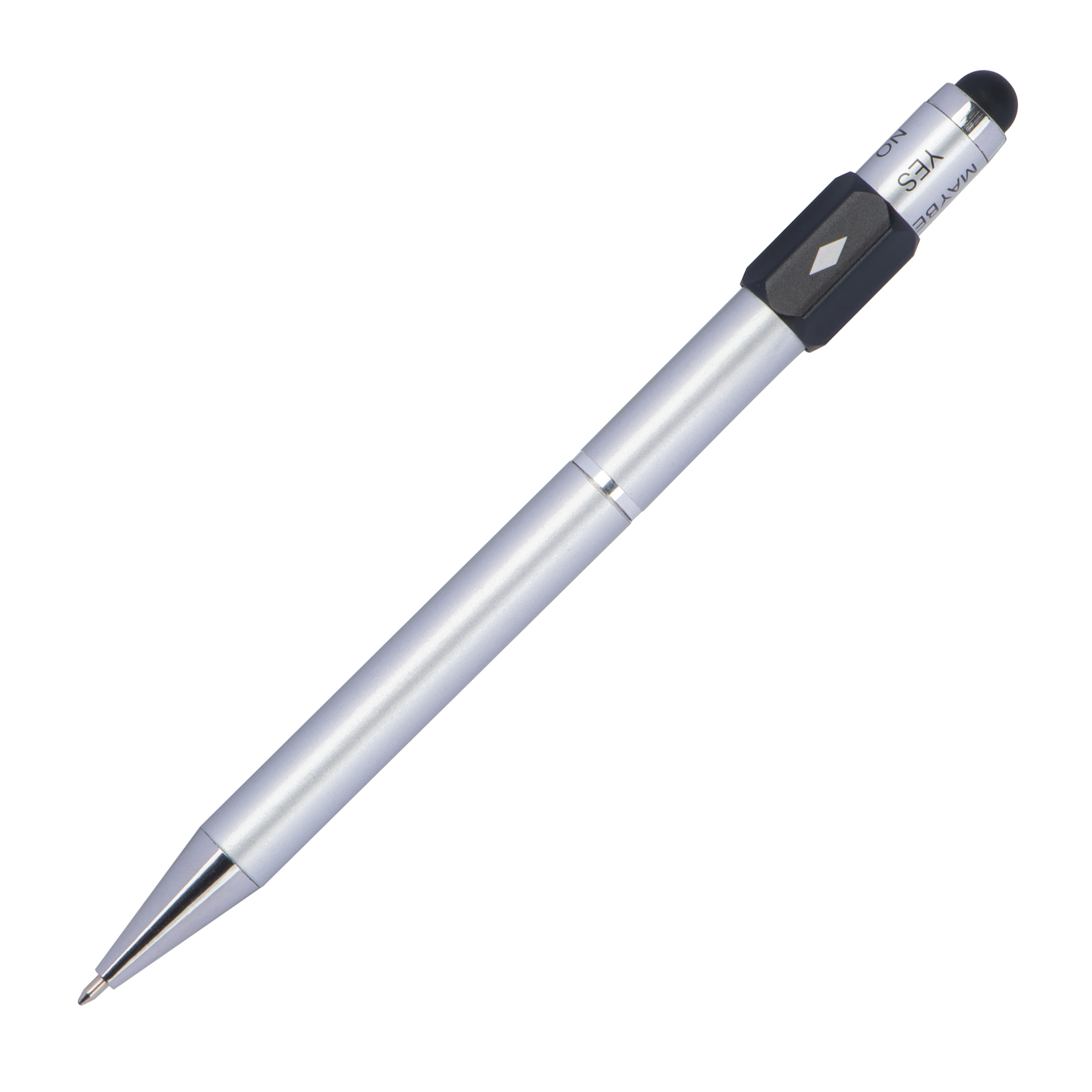 YES - NO - MAYBE: Fragen Sie doch einfach Ihren Decision Kugelschreiber. Mit dem Dreh-Fidget unterhalb des Drückers gibt der Kugelschreiber aus Metall die Antwort auf Ihre Fragen. Mit blau schreibender Mine. Ihre Werbung gravieren wir auf den Schaft.